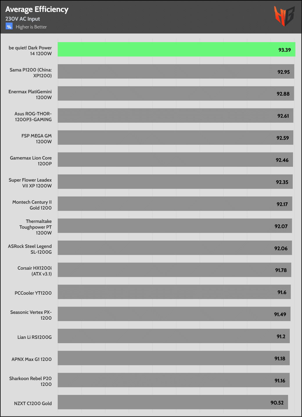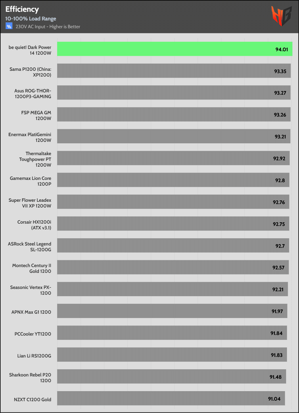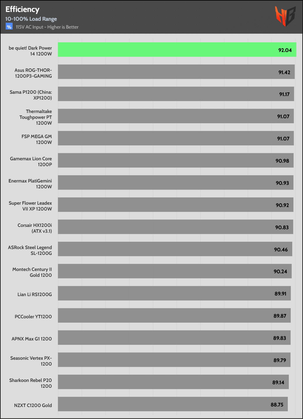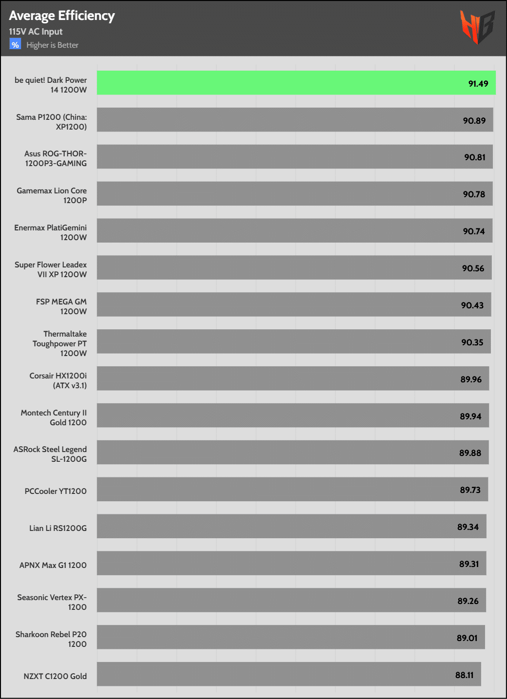 The PSU’s average efficiency with more than 1450 different load levels at 115V and 230V is depicted in the graphs below.