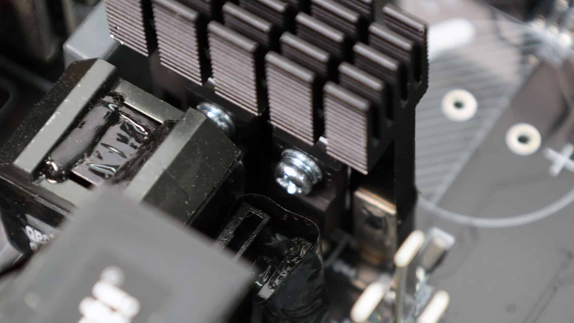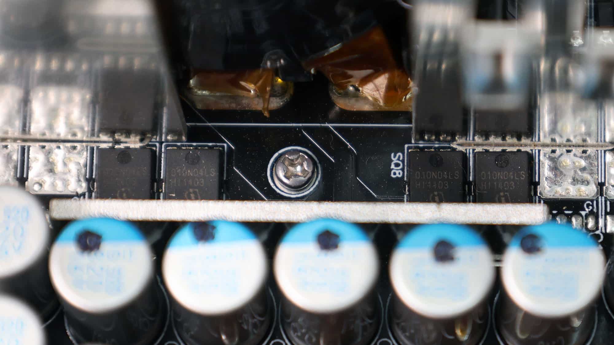 Four Infineon BSC010N04LS FETs regulate the 12V rail. They are installed on the business (top) side of the PCB, and two small heatsinks handle their cooling.