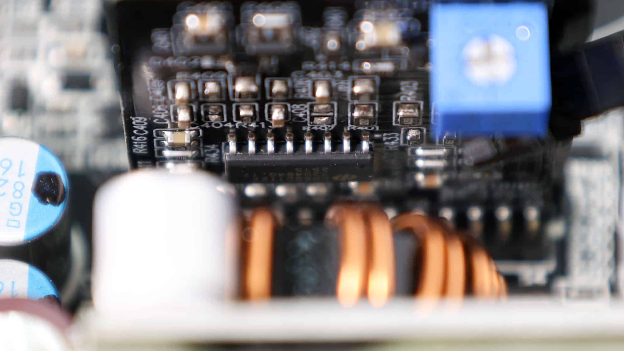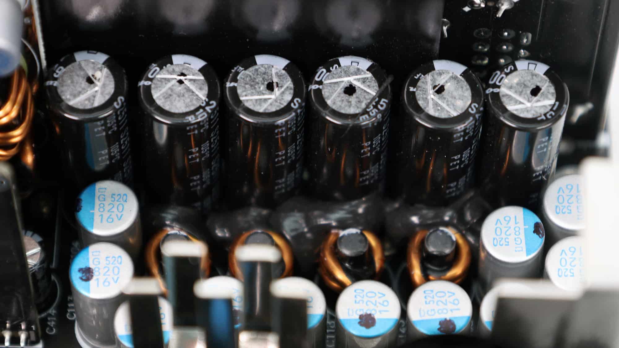 The APFC converter uses two Infineon IPA60R120P7 FETs and a single Infineon IDH10G65C6 boost diode. Chemi-Con manufactures the bulk capacitors. Their combined capacity is 940 μF, and both are rated for 2,000 hours at 105 °C. The voltage rating is 420V, providing a large enough margin from the APFC’s DC bus voltage (approximately 380-400V DC).