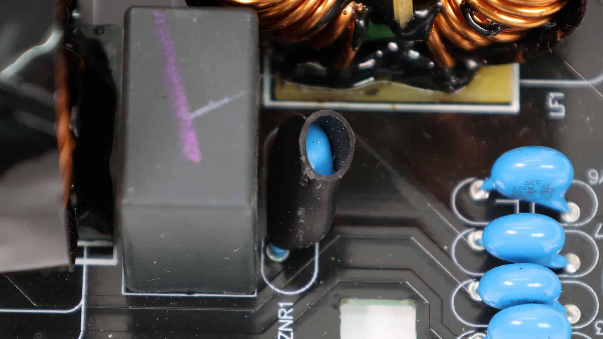 There is an MOV to protect from voltage surges and an NTC thermistor with a resistance of 5 ohms. Moreover, a bypass relay supports the NTC thermistor.