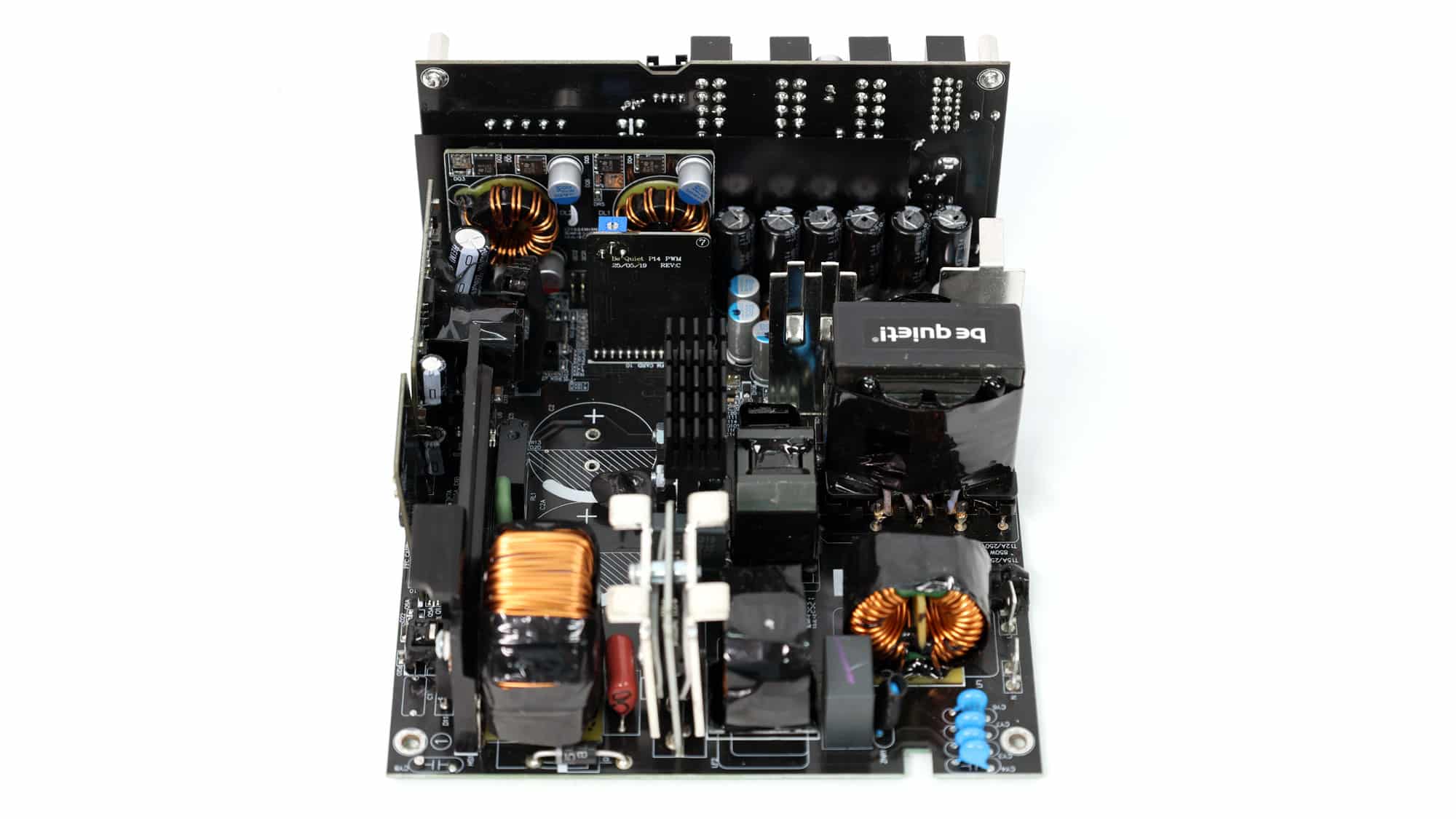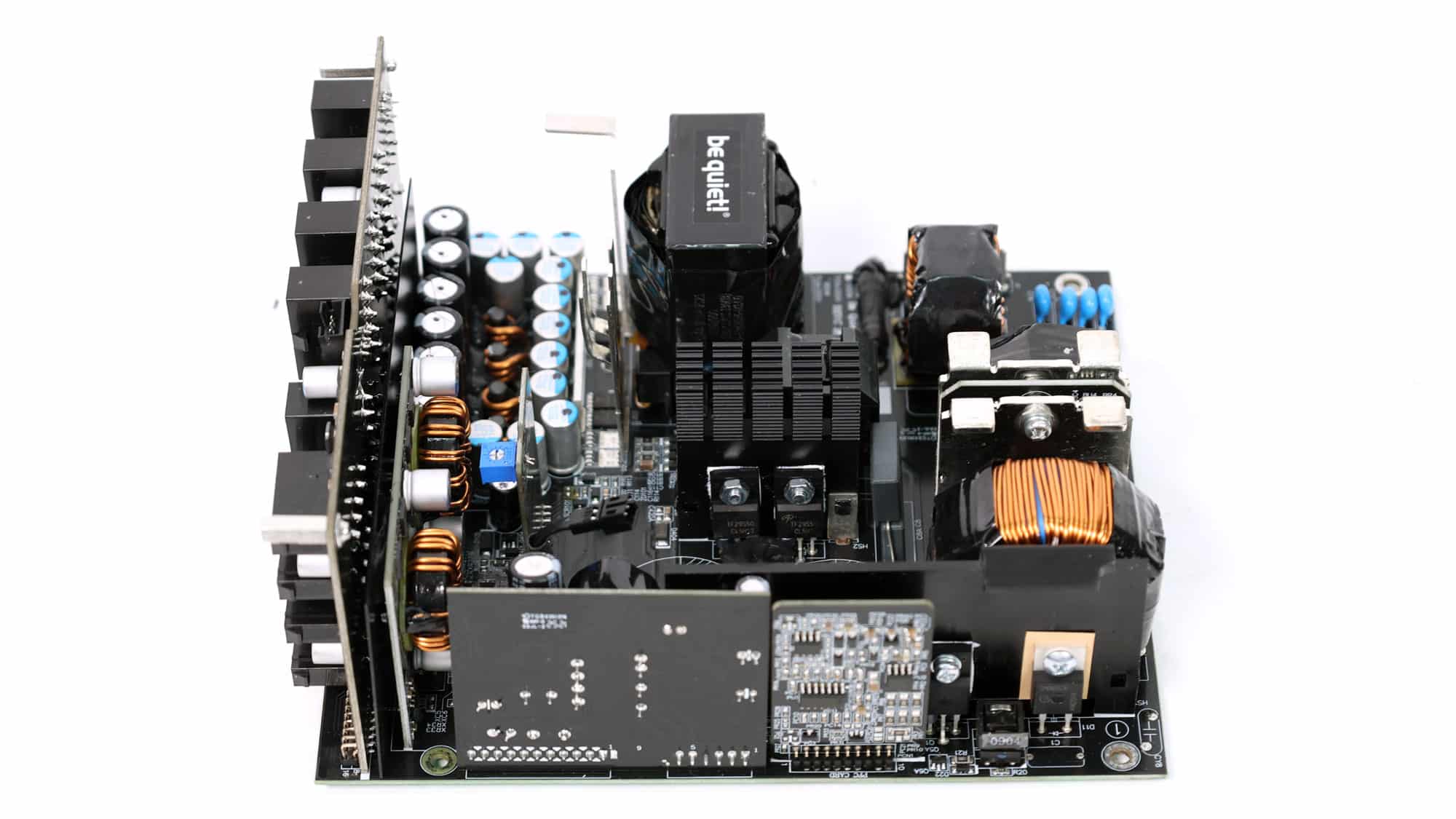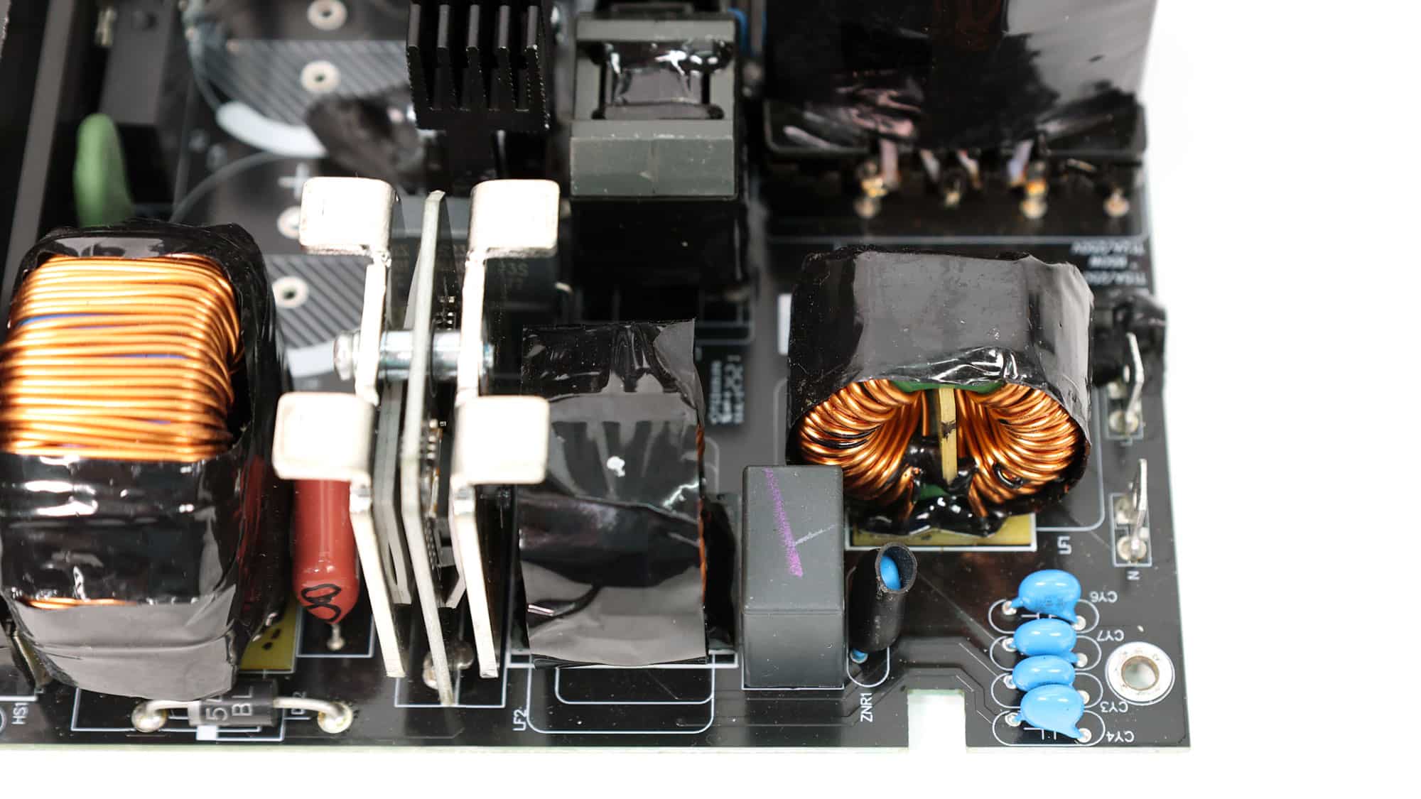 CWT supplies this platform with a modern architecture that incorporates bridgeless APFC to minimize energy losses and a full-bridge topology for improved power-handling capability. The primary side also features an LLC resonant converter, further boosting overall efficiency. The PCB uses standard-to-large dimensions and is laid out with acoustics in mind, avoiding crowding in favor of generous component spacing—especially on the secondary side—to promote optimal airflow. Notably, the electrolytic capacitors are positioned well away from major heat sources, significantly enhancing their expected lifespan. In typical CWT fashion, the secondary-side heatsinks are relatively modest in size, as are those on the primary side, with the largest heatsink dedicated to the APFC stage.