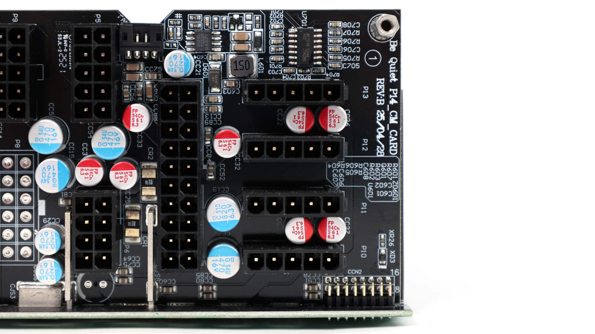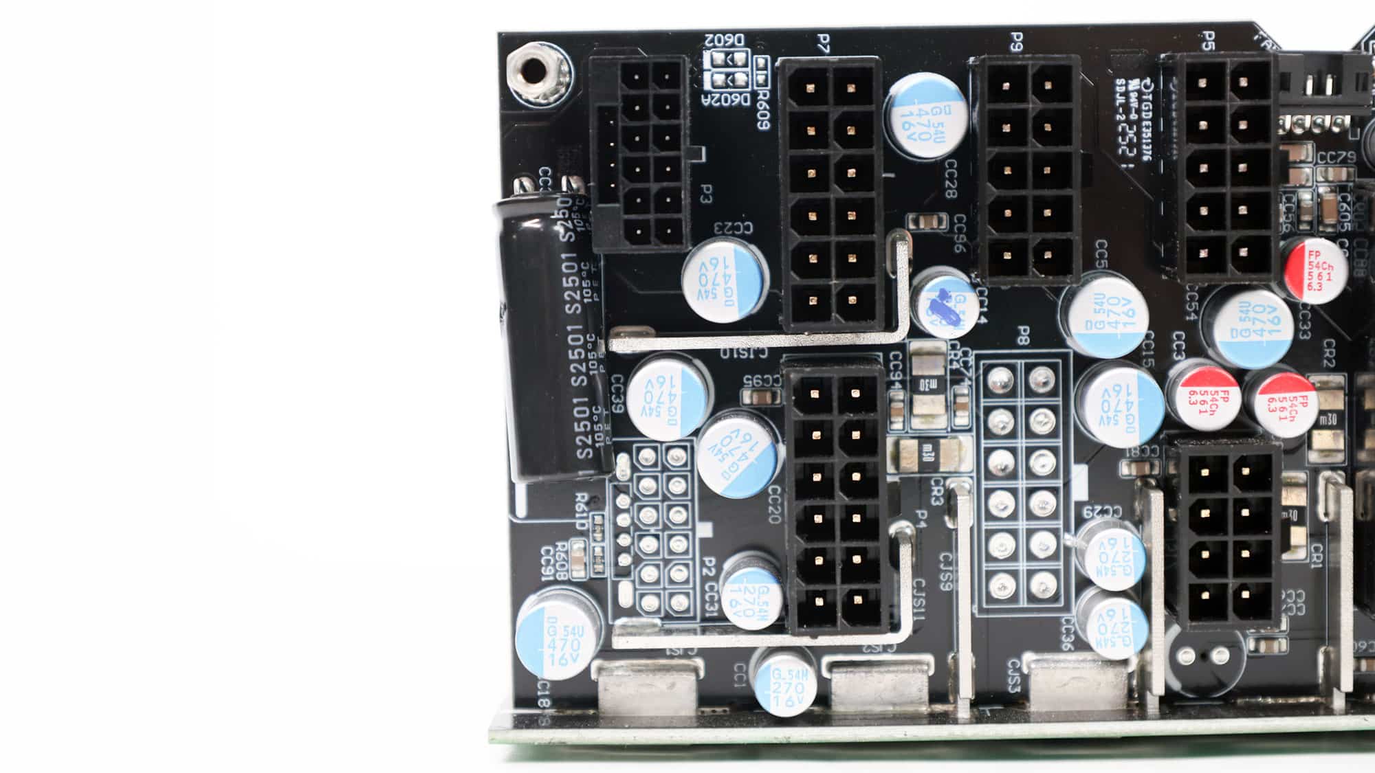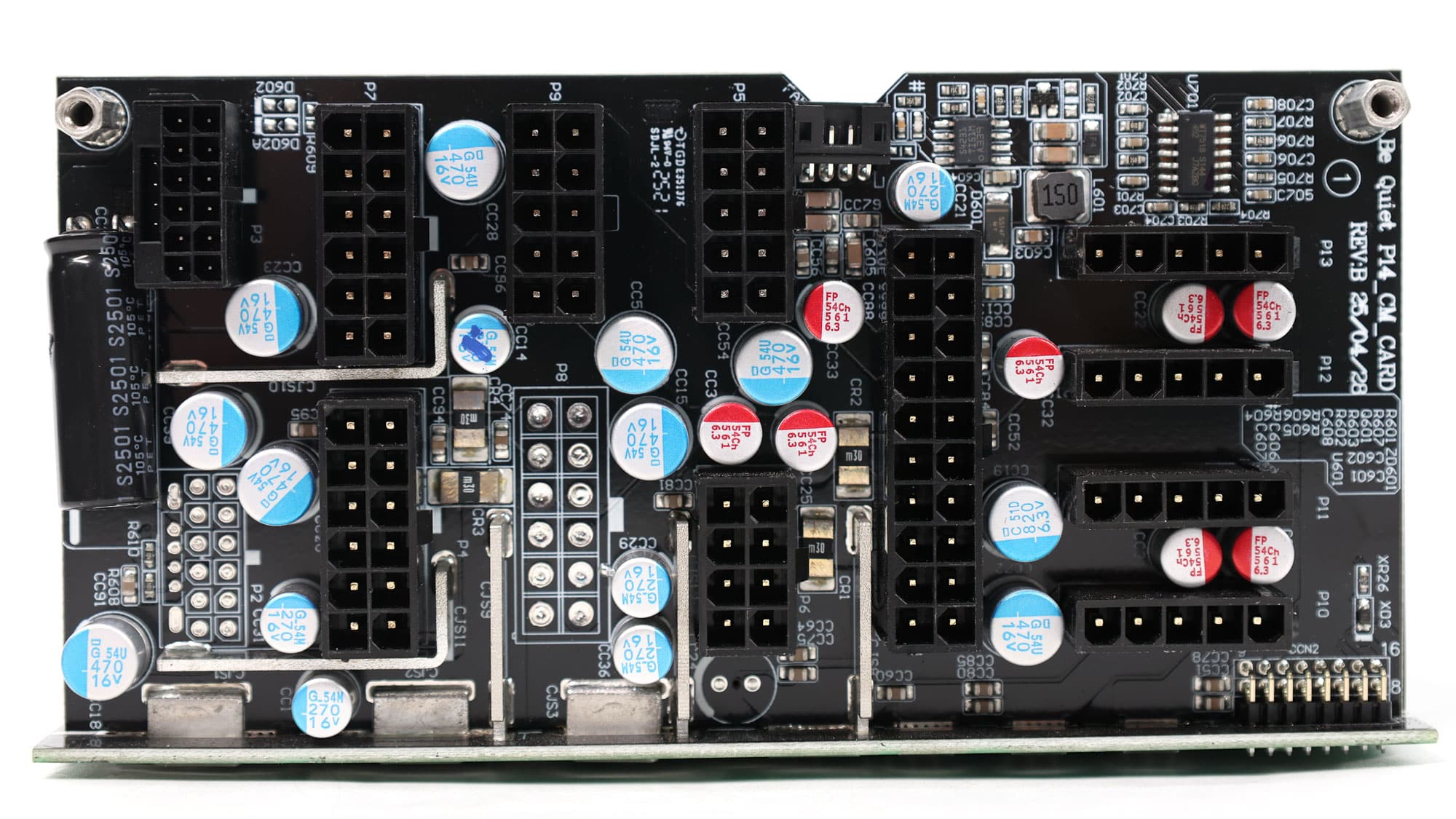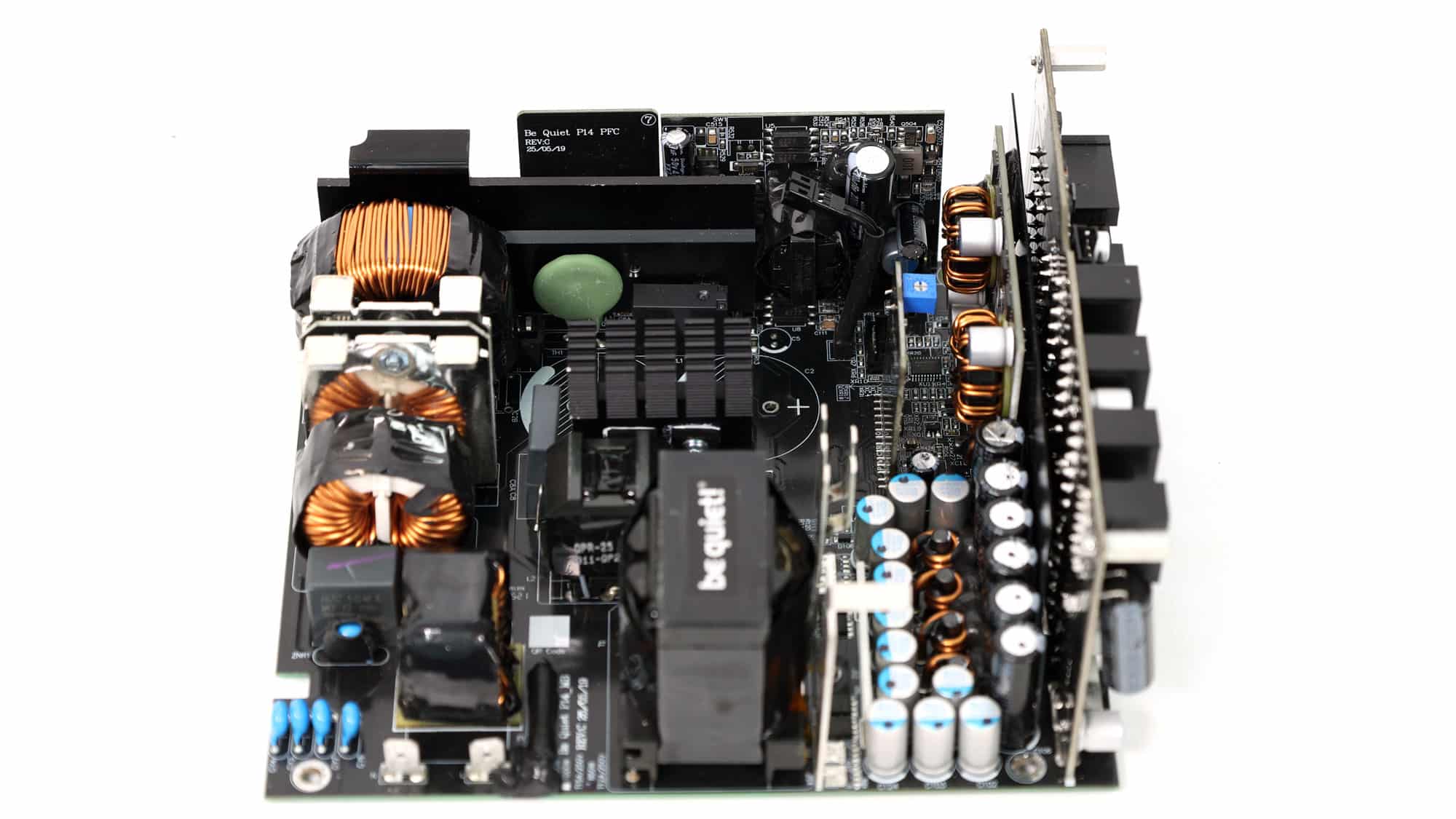 CWT supplies this platform with a modern architecture that incorporates bridgeless APFC to minimize energy losses and a full-bridge topology for improved power-handling capability. The primary side also features an LLC resonant converter, further boosting overall efficiency. The PCB uses standard-to-large dimensions and is laid out with acoustics in mind, avoiding crowding in favor of generous component spacing—especially on the secondary side—to promote optimal airflow. Notably, the electrolytic capacitors are positioned well away from major heat sources, significantly enhancing their expected lifespan. In typical CWT fashion, the secondary-side heatsinks are relatively modest in size, as are those on the primary side, with the largest heatsink dedicated to the APFC stage.