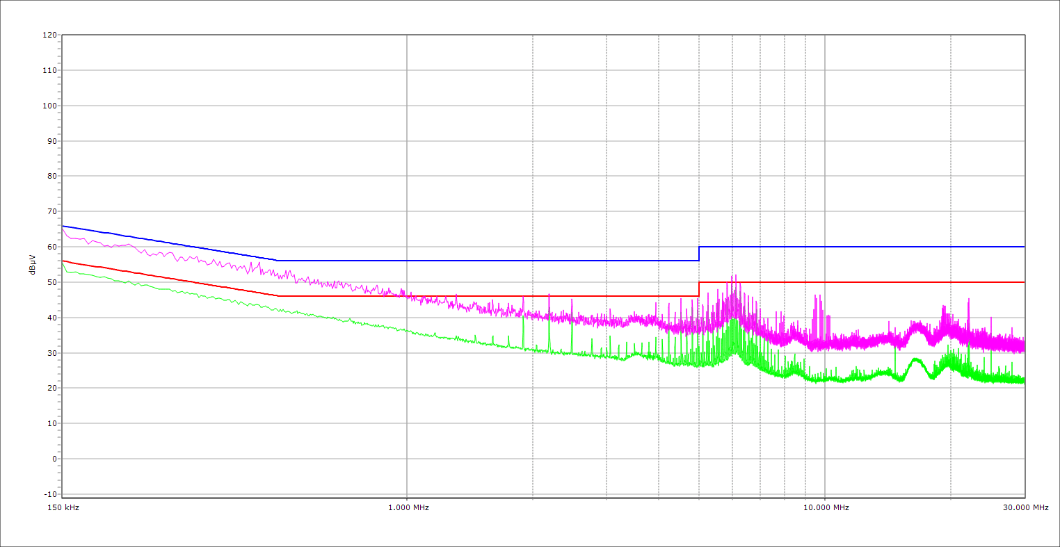 The PSU’s conducted emissions are below the respective limits at both the average and peak EMI detectors.