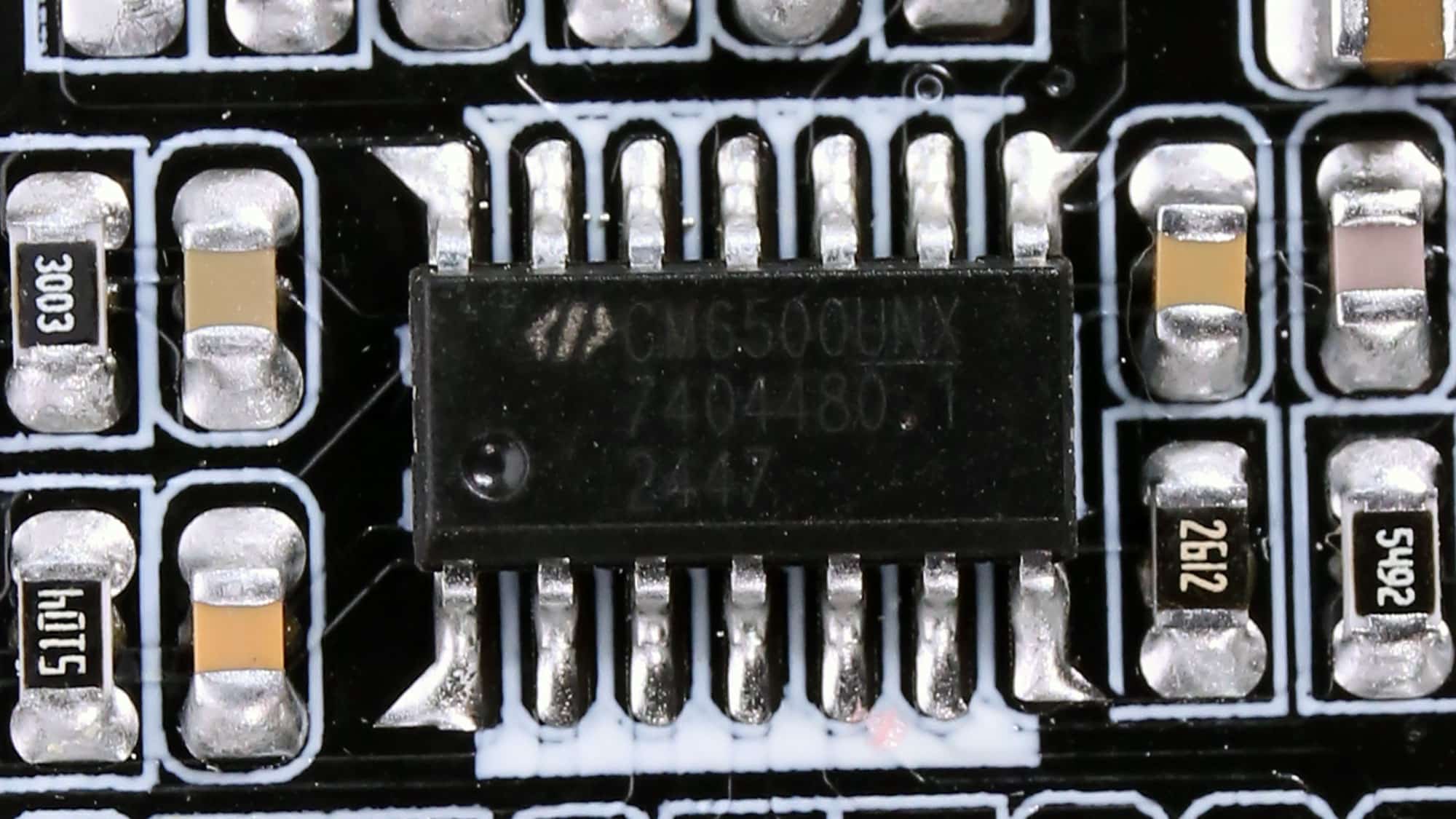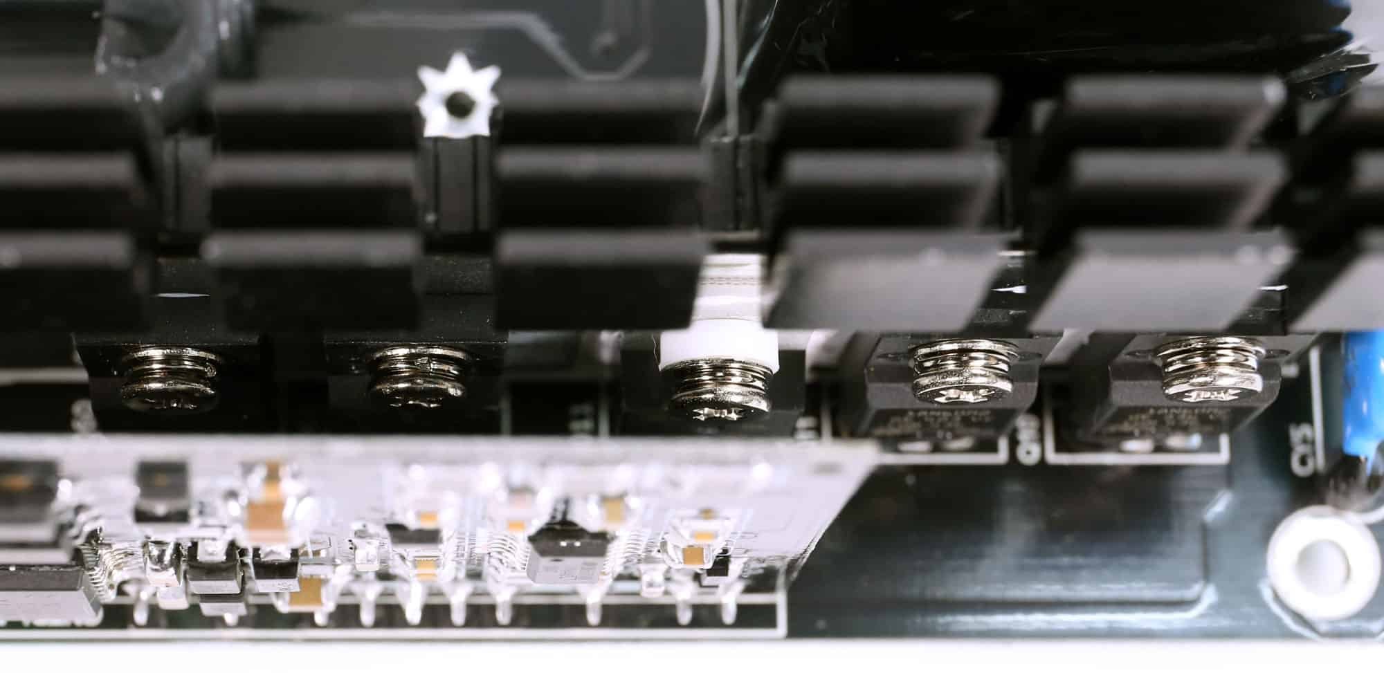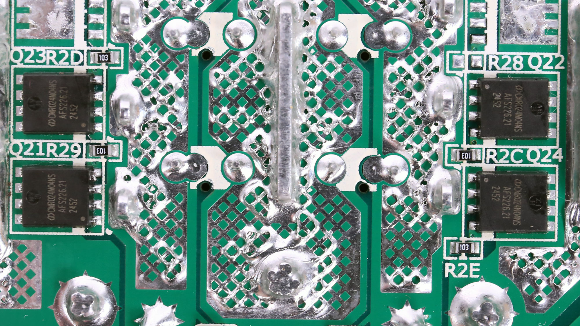 Four CMR024N04NS FETs regulate the 12V rail. They are installed on the solder (rear) side of the main PCB.