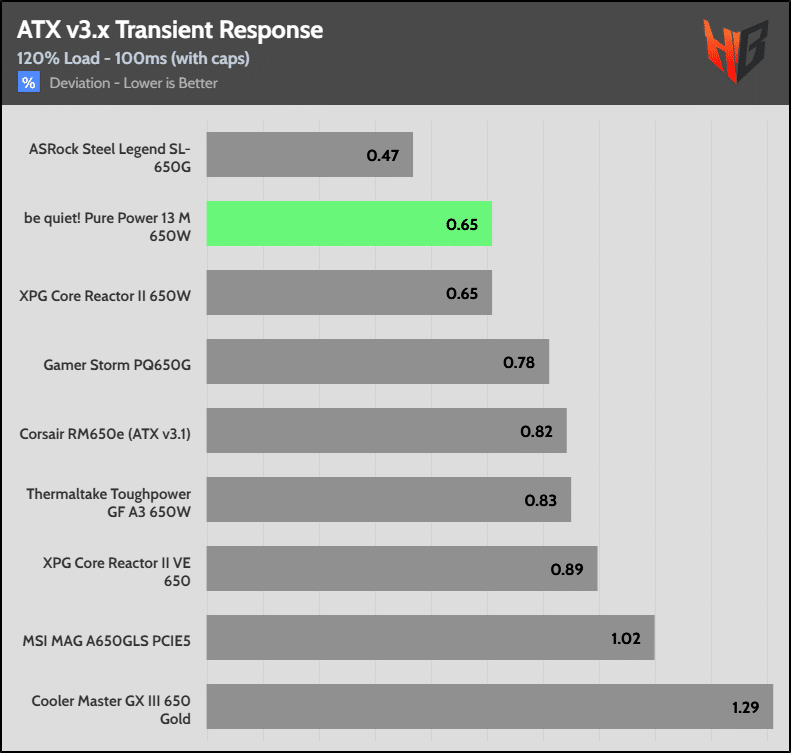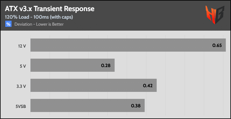 The PSU passes all ATX v3.1 transient response tests, keeping its rails at high voltages. Its relatively low capacity helps in that.