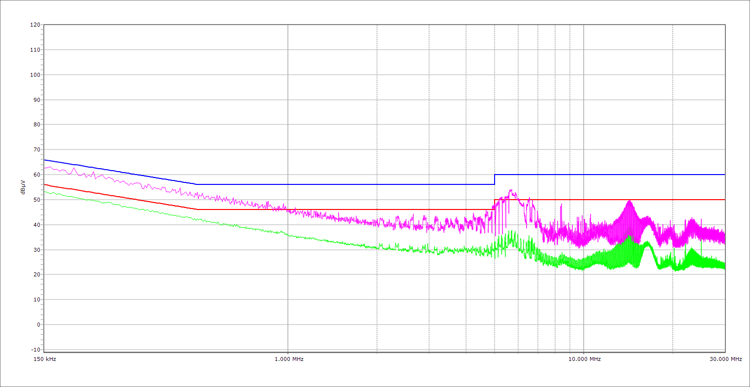 The PSU’s conducted emissions are below the respective limits at both the average and peak EMI detectors.