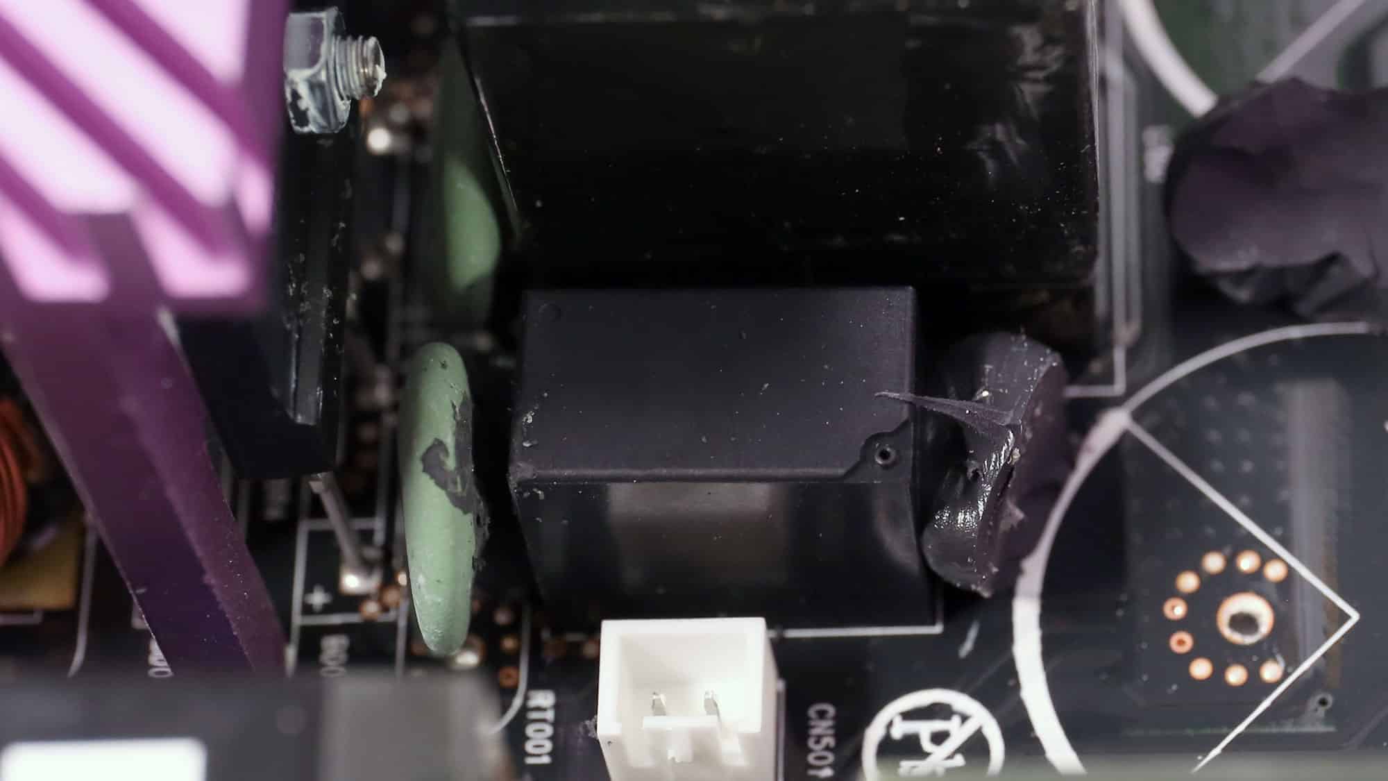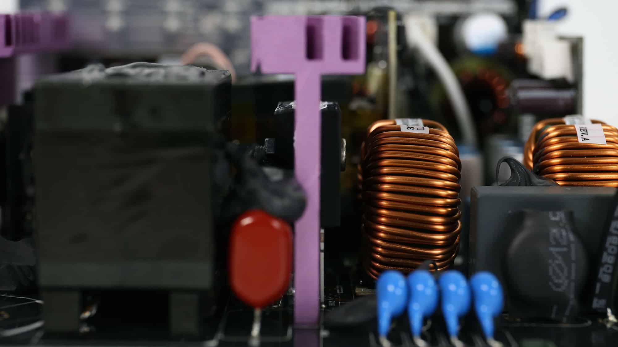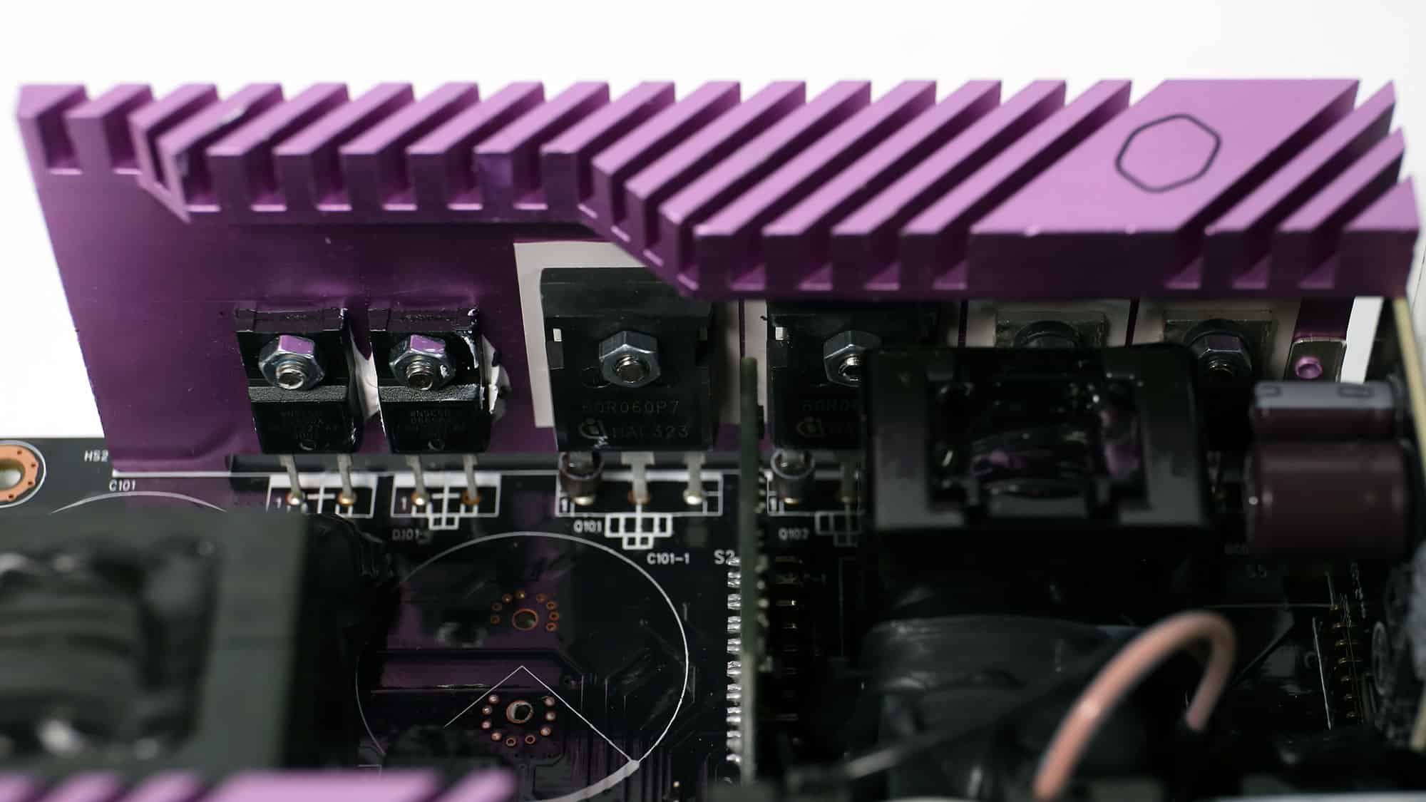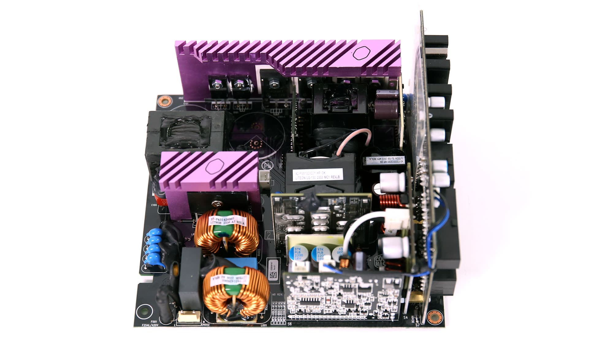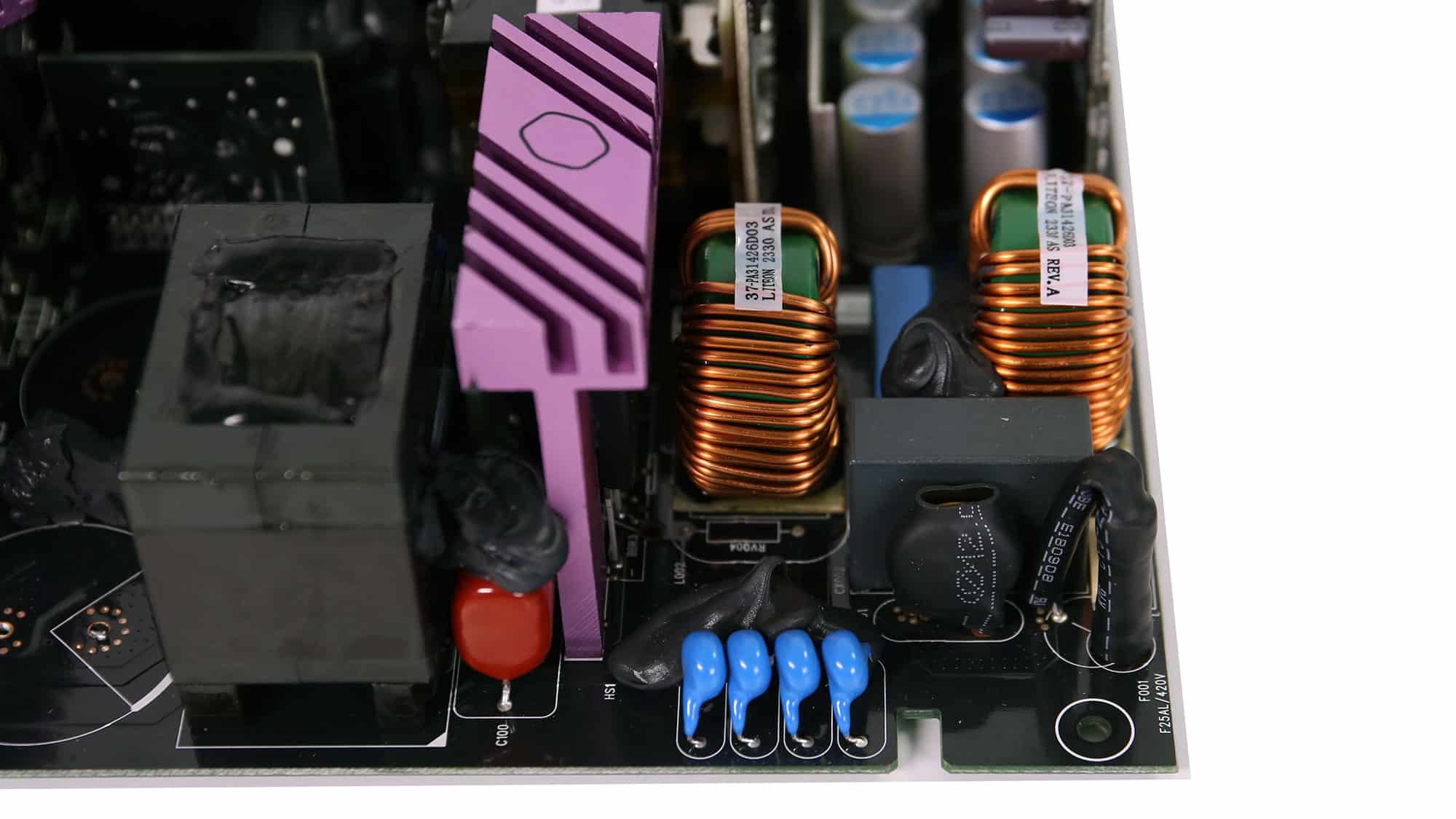The purple heatsinks are eye-catching; I suspect they are made in-house since CM is in the heatsink manufacturing business. The platform’s design is nice, and despite the PSU’s high capacity and the normal-sized PCB, there is still plenty of space among the parts for good airflow. The main transformer looks like the ones used in 750W and 850W units, but thanks to its design, it can deliver way more power without issues. On the primary side, in addition to the APFC converter, two FETs arranged in a half-bridge topology chop the incoming signal to feed the main transformer, which powers the secondary side. An LLC resonant converter is also used to minimize switching losses. Six FETs handle the 12V rail on the secondary side, and two DC-DC converters generate the minor rails.