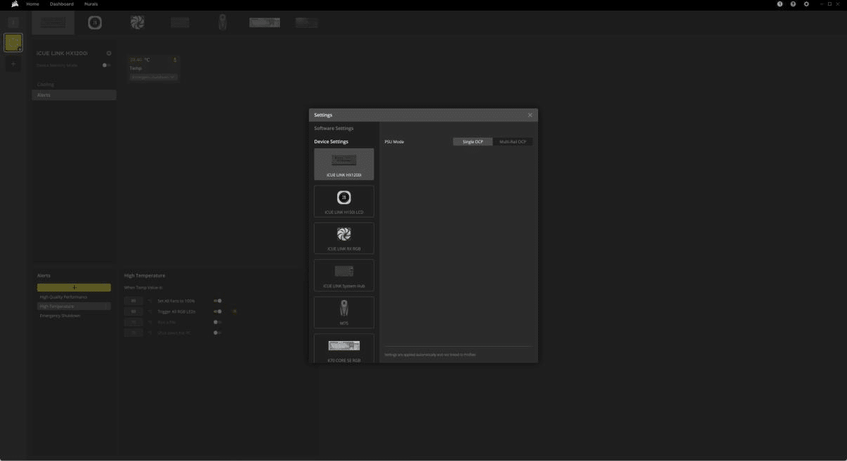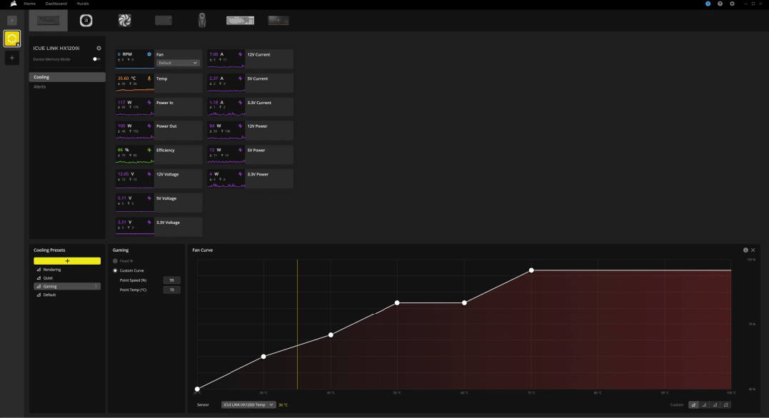 You have to use Corsair’s iCUE software to “talk” to the power supply. Thankfully, this application has been vastly improved through time, although there is still room for improvement. From iCUE, you can monitor power settings, toggle between single and multiple 12V rails on the fly, and also create custom fan speed profiles.