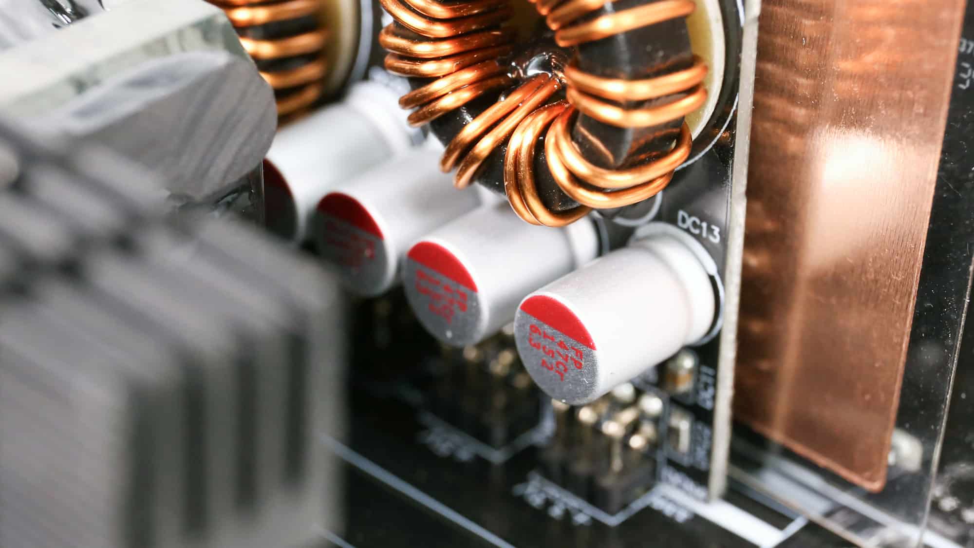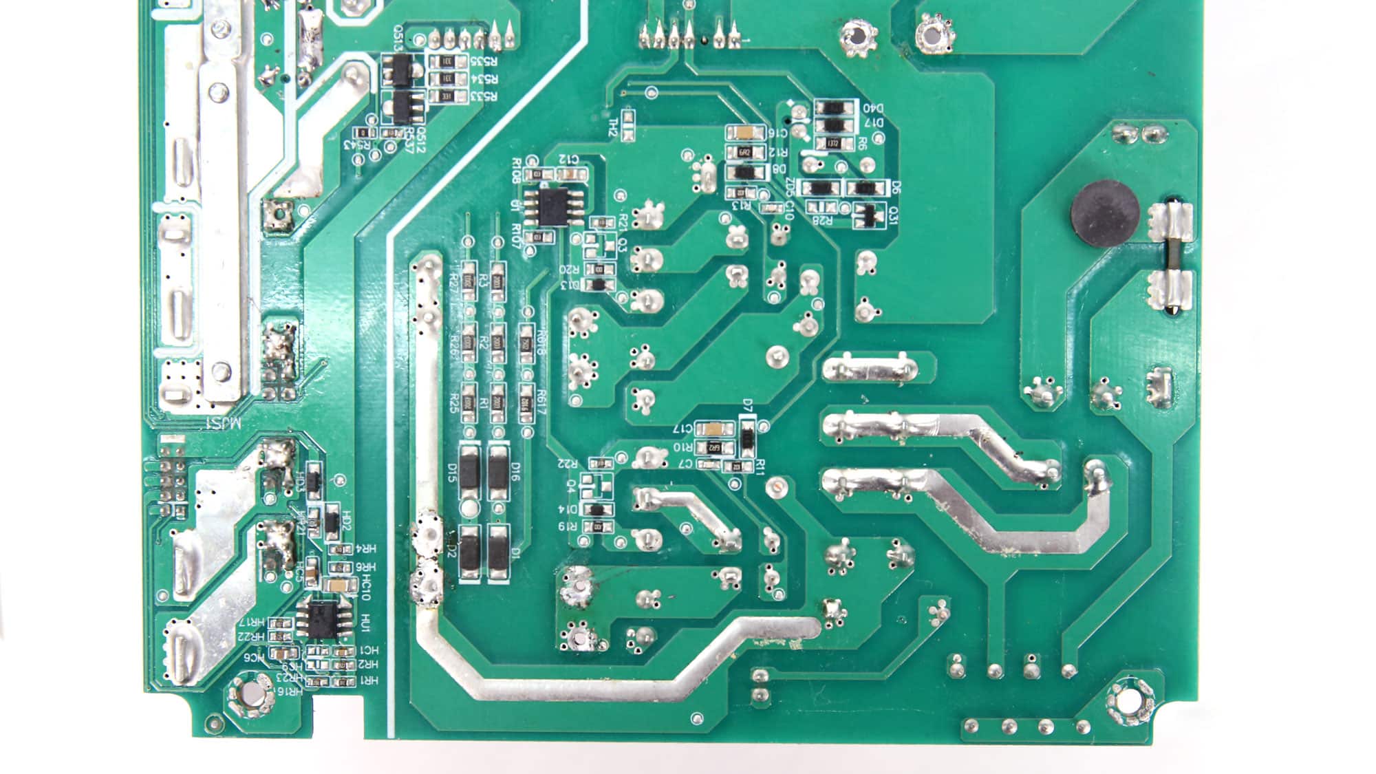 The interleaved APFC converter uses two Infineon IPW60R099P6 FETs and two Infineon IDH08G65C6 boost diodes. Nippon Chemi-Con and Rubycon manufacture the bulk capacitors. Their combined capacity is 890 μF, and both are rated for 2,000 hours at 105 °C. The voltage rating is 420V, which is higher than the APFC’s DC bus voltage (approximately 380-400V DC).