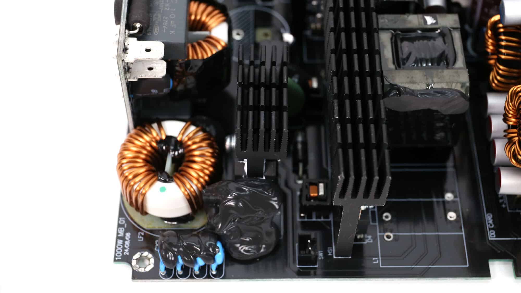 CWT provides the platform, which is semi-digital since the primary side and part of the secondary are handled by digital controllers. Only the minor rails and 5VSB use analog controllers; otherwise, this platform would be fully digital. The HX1000i uses a half-bridge topology on its primary side, while the higher-end models use a full-bridge topology, which is better suited to high-power output. The heatsinks on the primary side are large enough for a modern, efficient platform, while those on the secondary side are tiny. CWT typically uses small heatsinks on the secondary sides of its high-end implementations to lower production costs and save valuable PCB space.