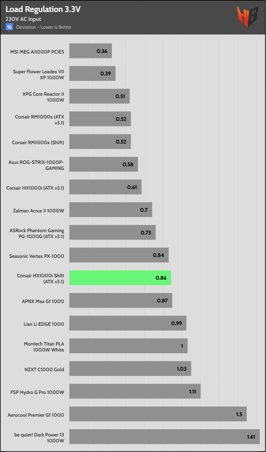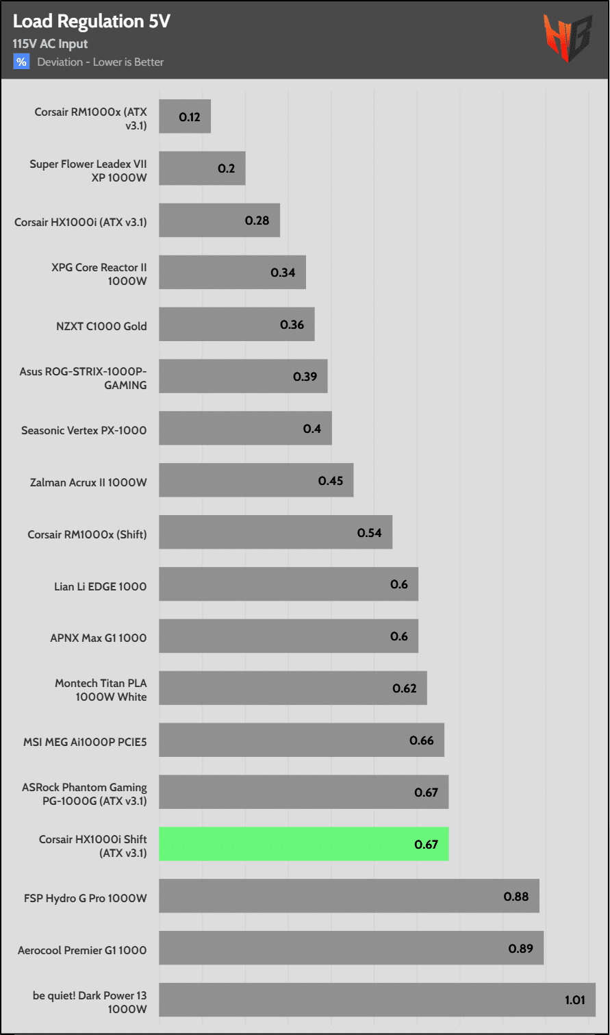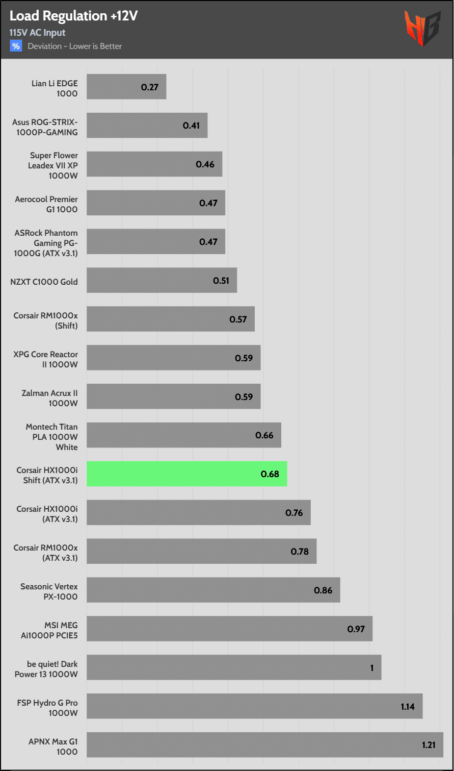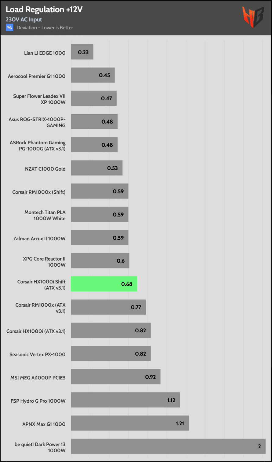 Load regulation is within 1% on all primary rails. I would like to see a tighter load regulation at 12V, given the digital control.
