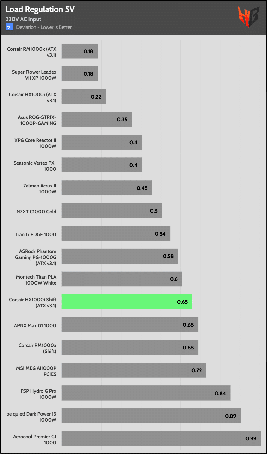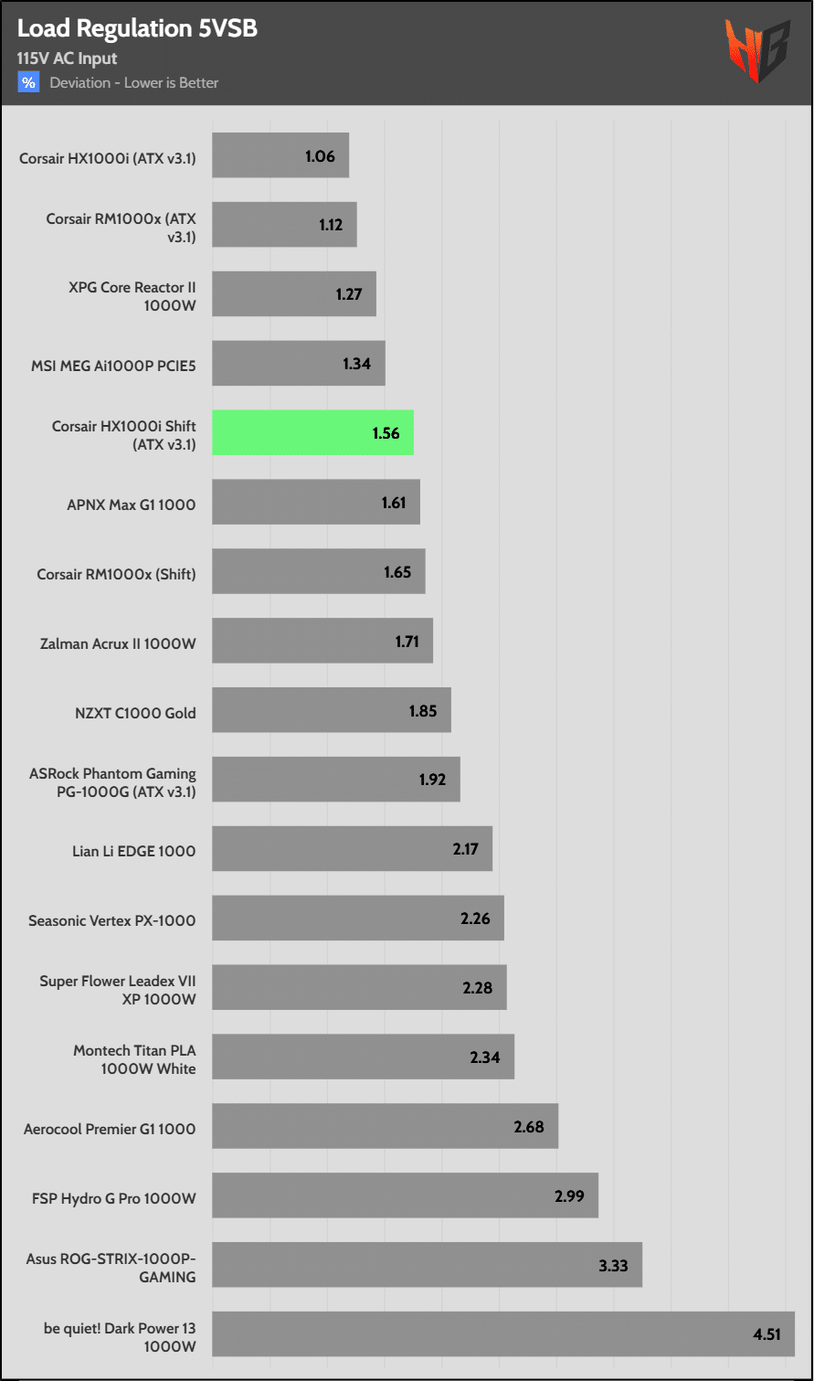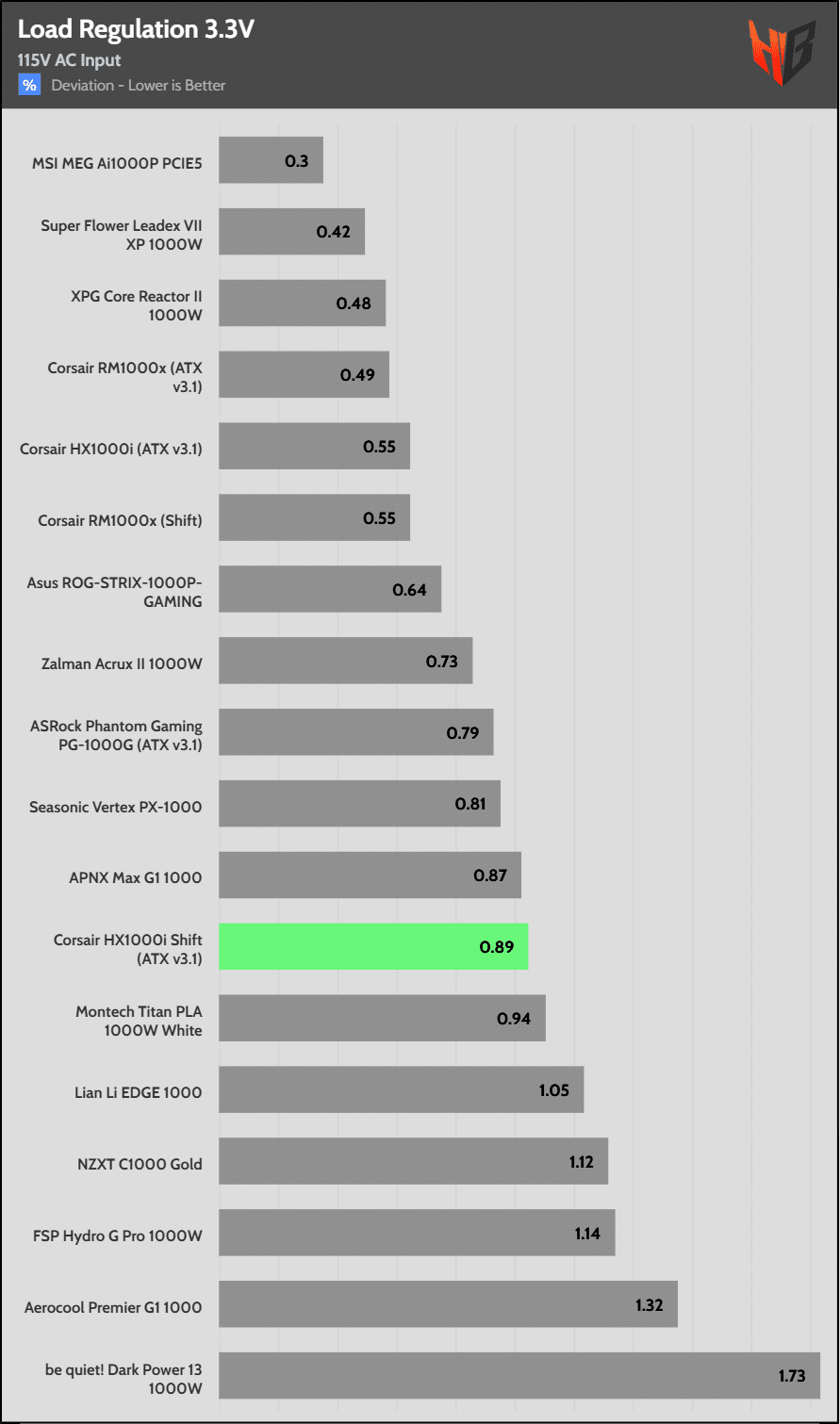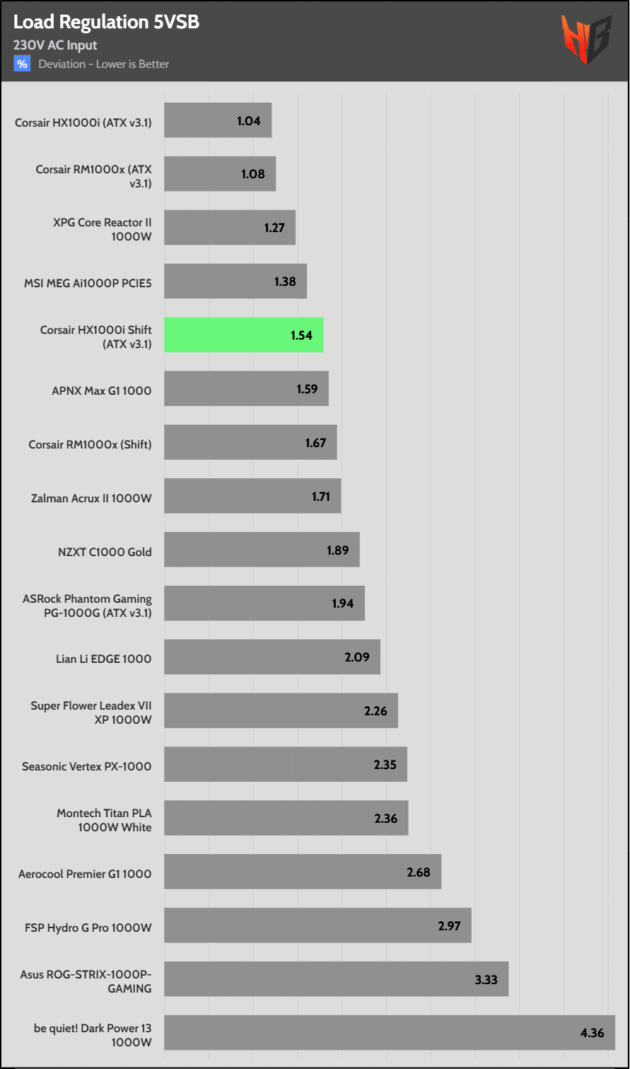 Load regulation is within 1% on all primary rails. I would like to see a tighter load regulation at 12V, given the digital control.