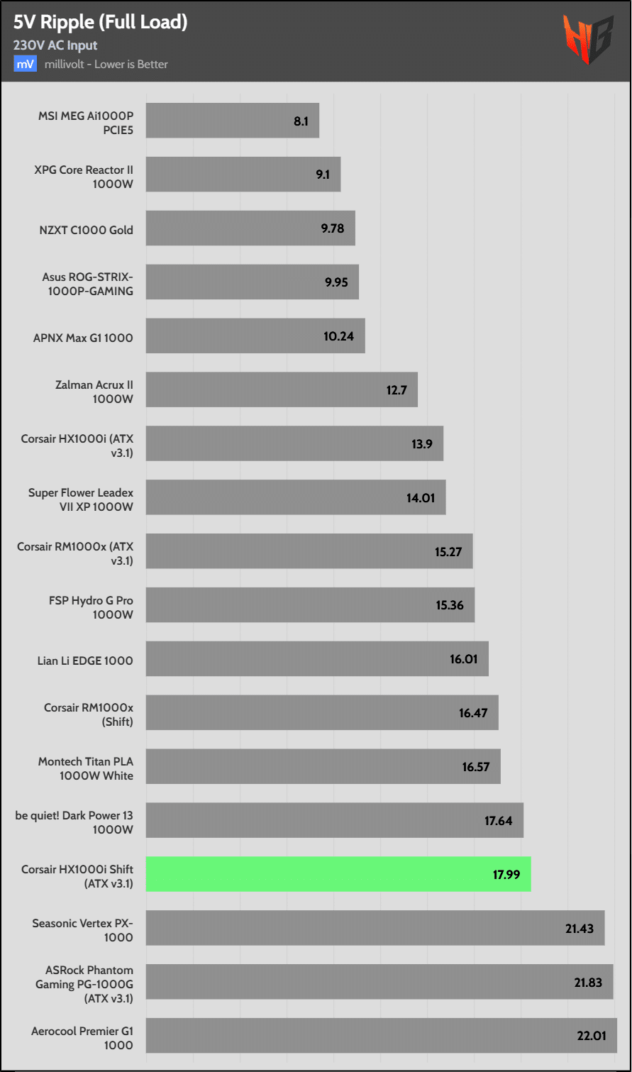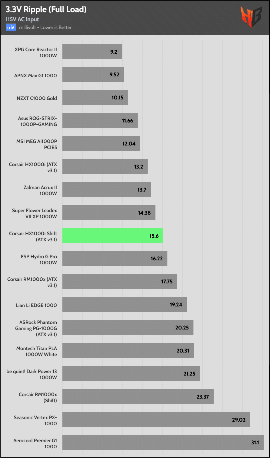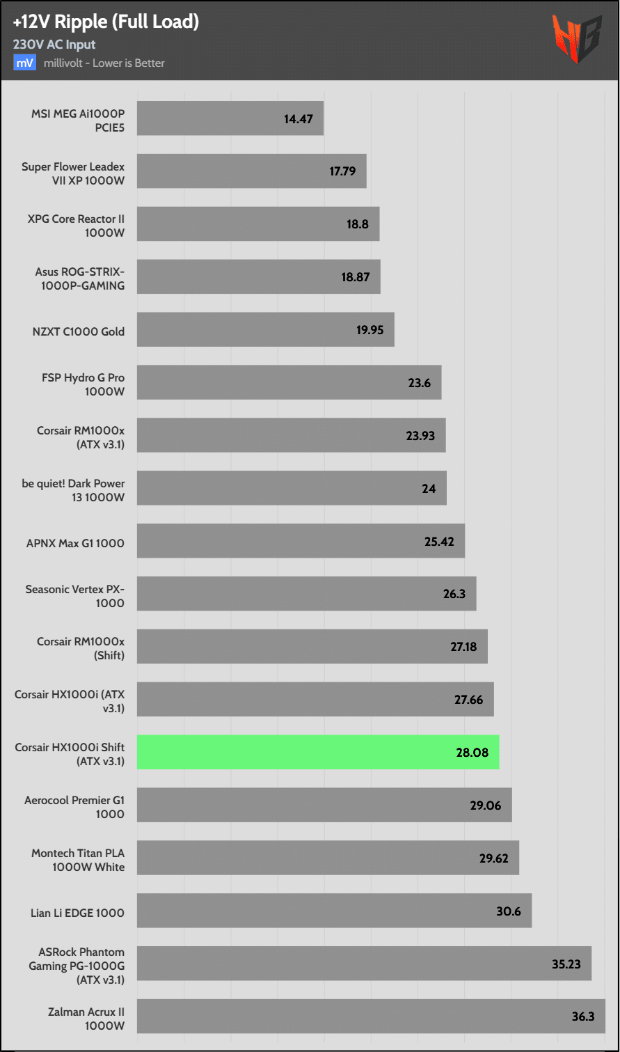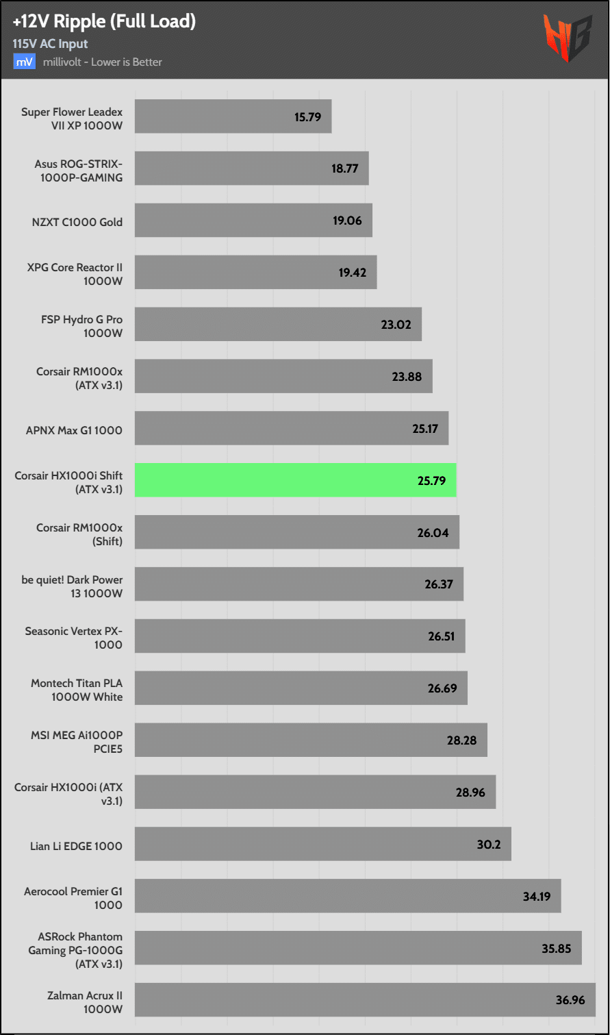 Load regulation is within 1% on all primary rails. I would like to see a tighter load regulation at 12V, given the digital control.