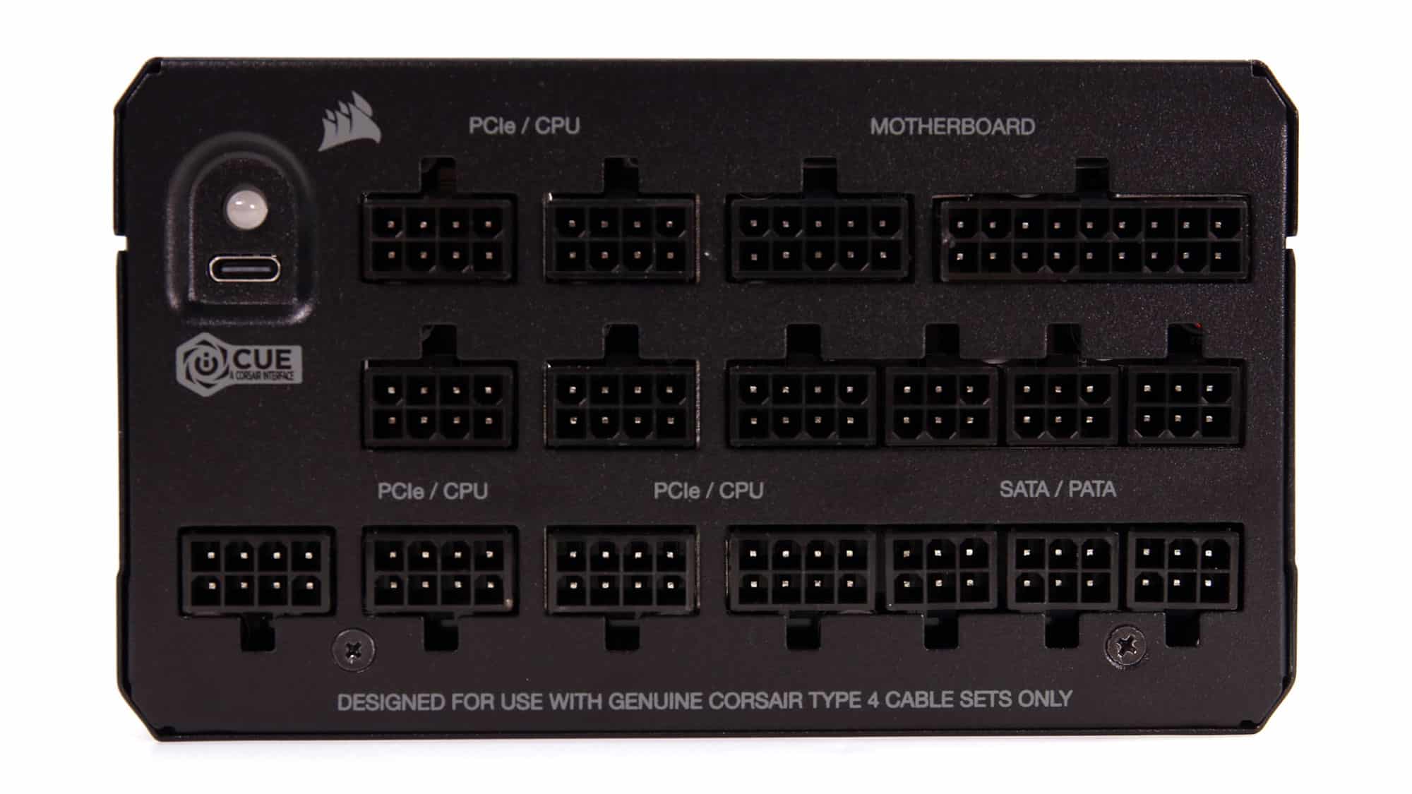 The modular panel around the back includes 17 sockets. The unit doesn’t use a native 12+4-pin header. It uses two 8-pin connectors instead, which are, if not the same, even safer since they allow the cable to flex more, and the larger space between the pins also provides higher tolerance to increased operating temperatures. There is also a Type-C port here for those who want to monitor the PSU through iCUE. I don’t belong to this group, so don’t expect to find any relevant information in this review.