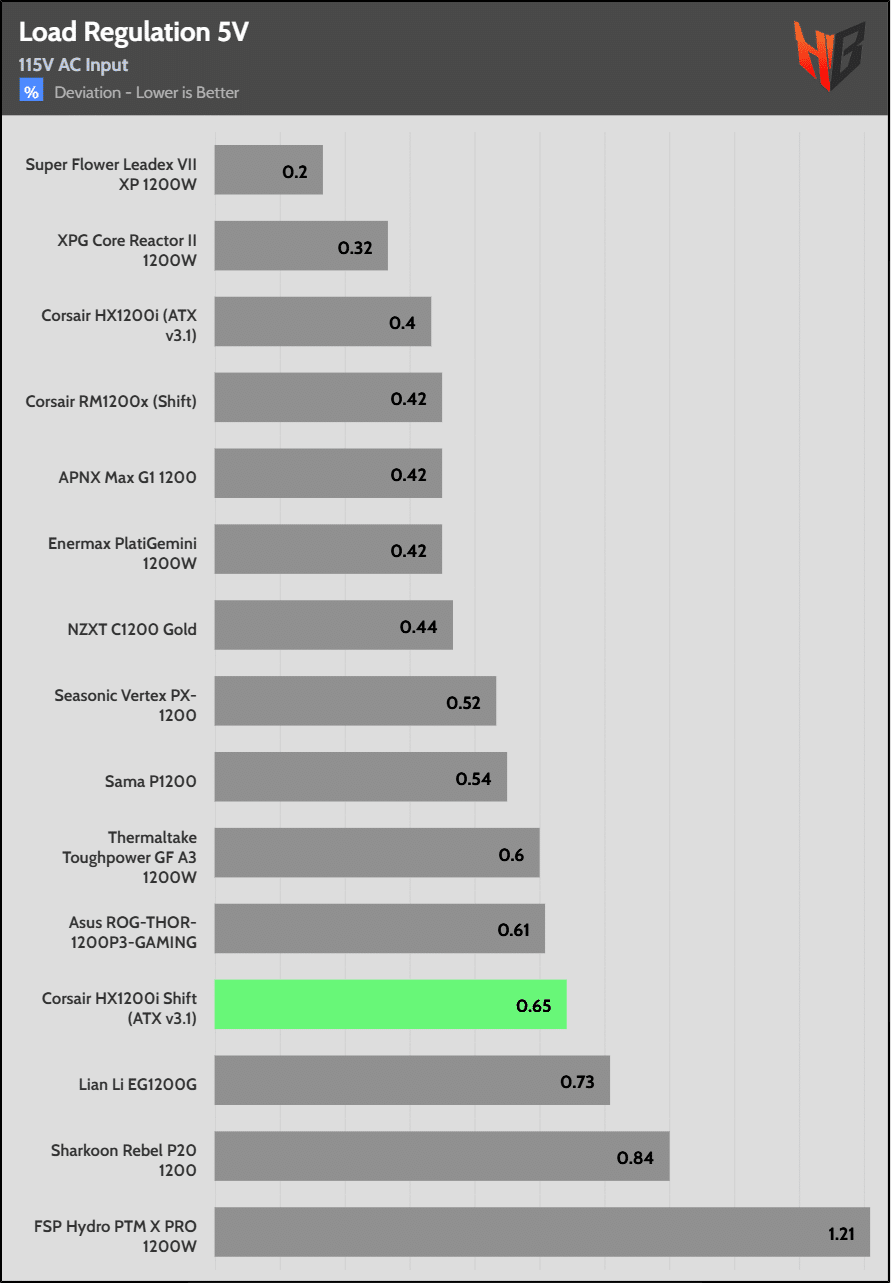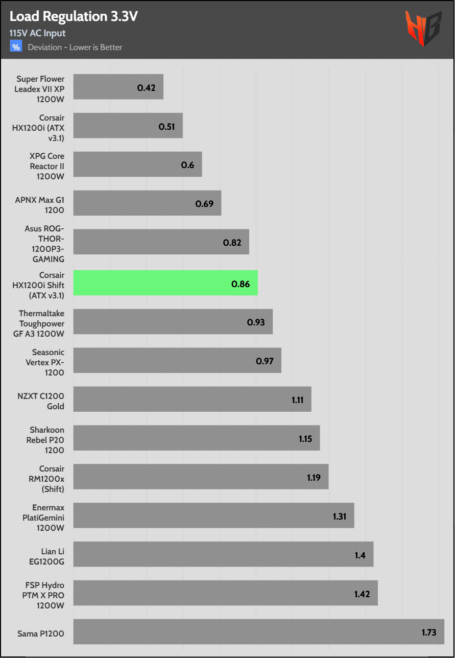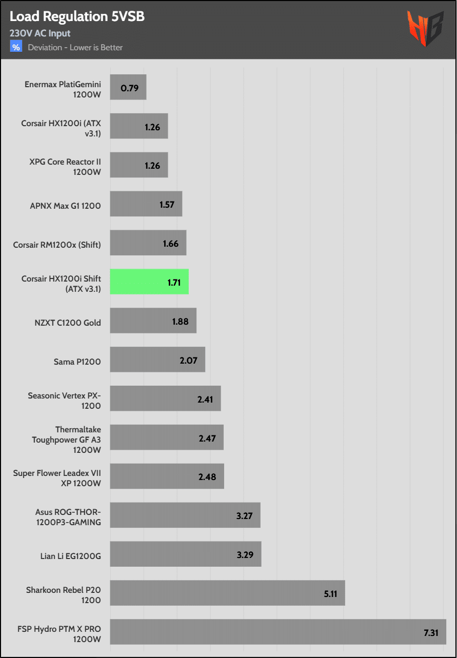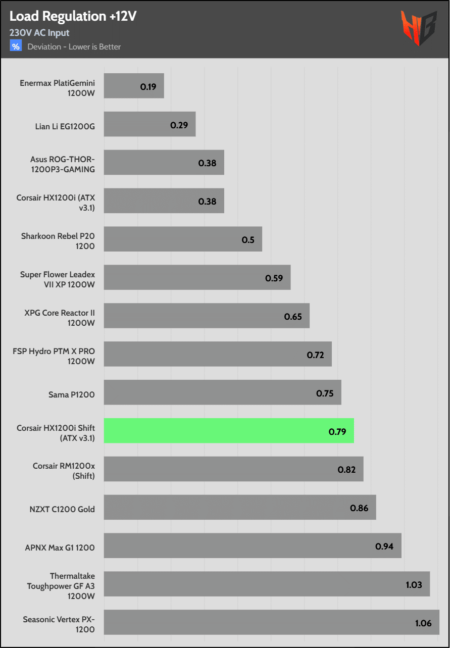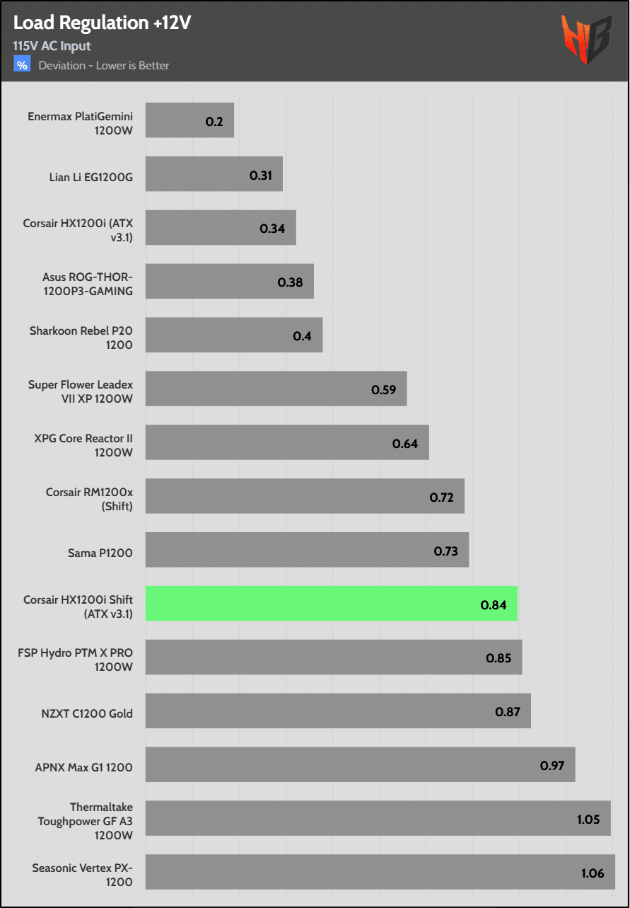 Load regulation is within 1% on all primary rails. I would like to see a tighter load regulation at 12V, given the digital control.