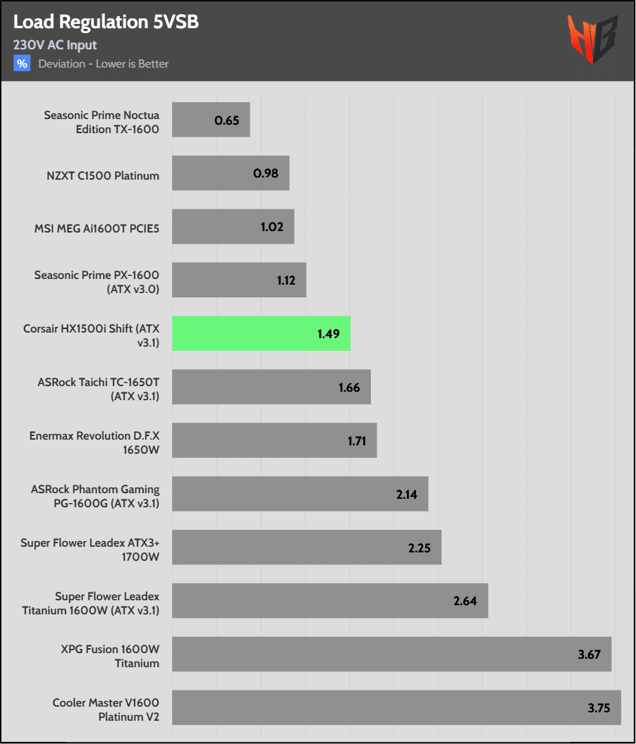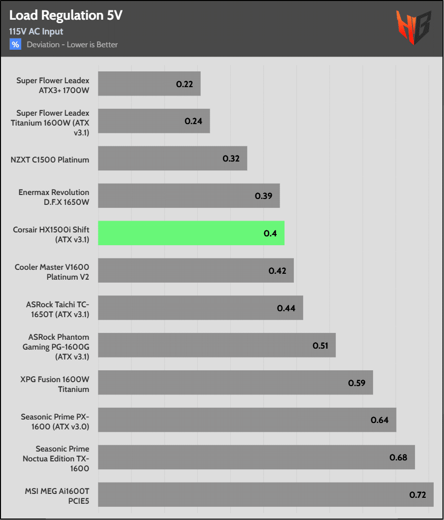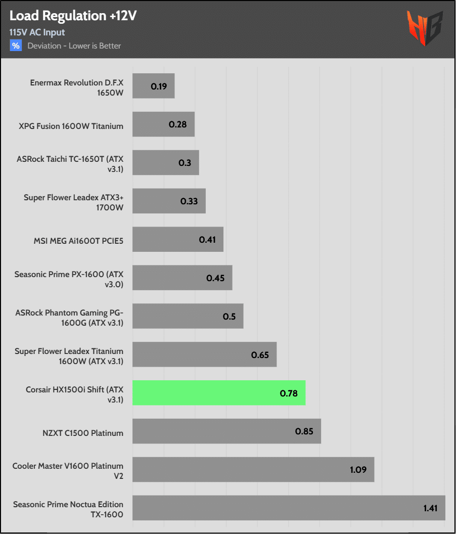 Load regulation is within 1% on all primary rails. I would like to see a tighter load regulation at 12V, given the digital control.