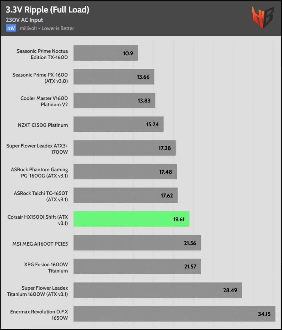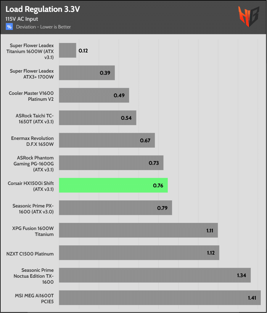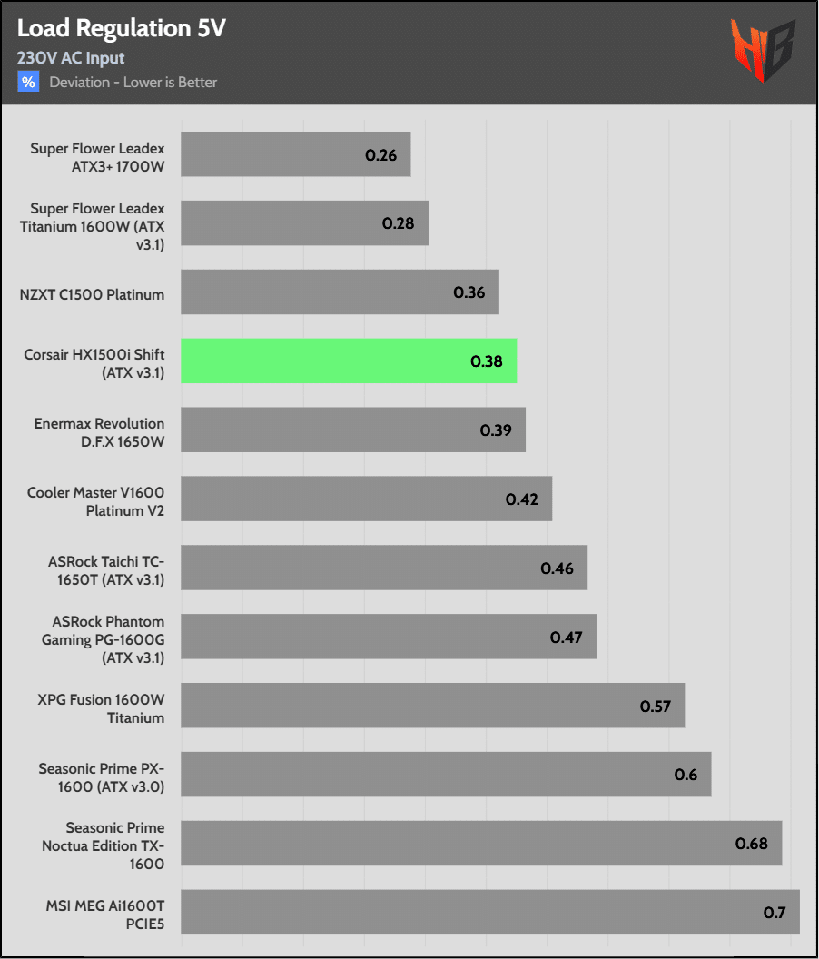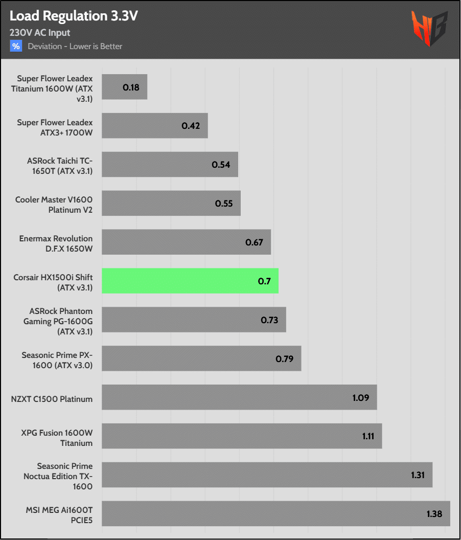 Load regulation is within 1% on all primary rails. I would like to see a tighter load regulation at 12V, given the digital control.