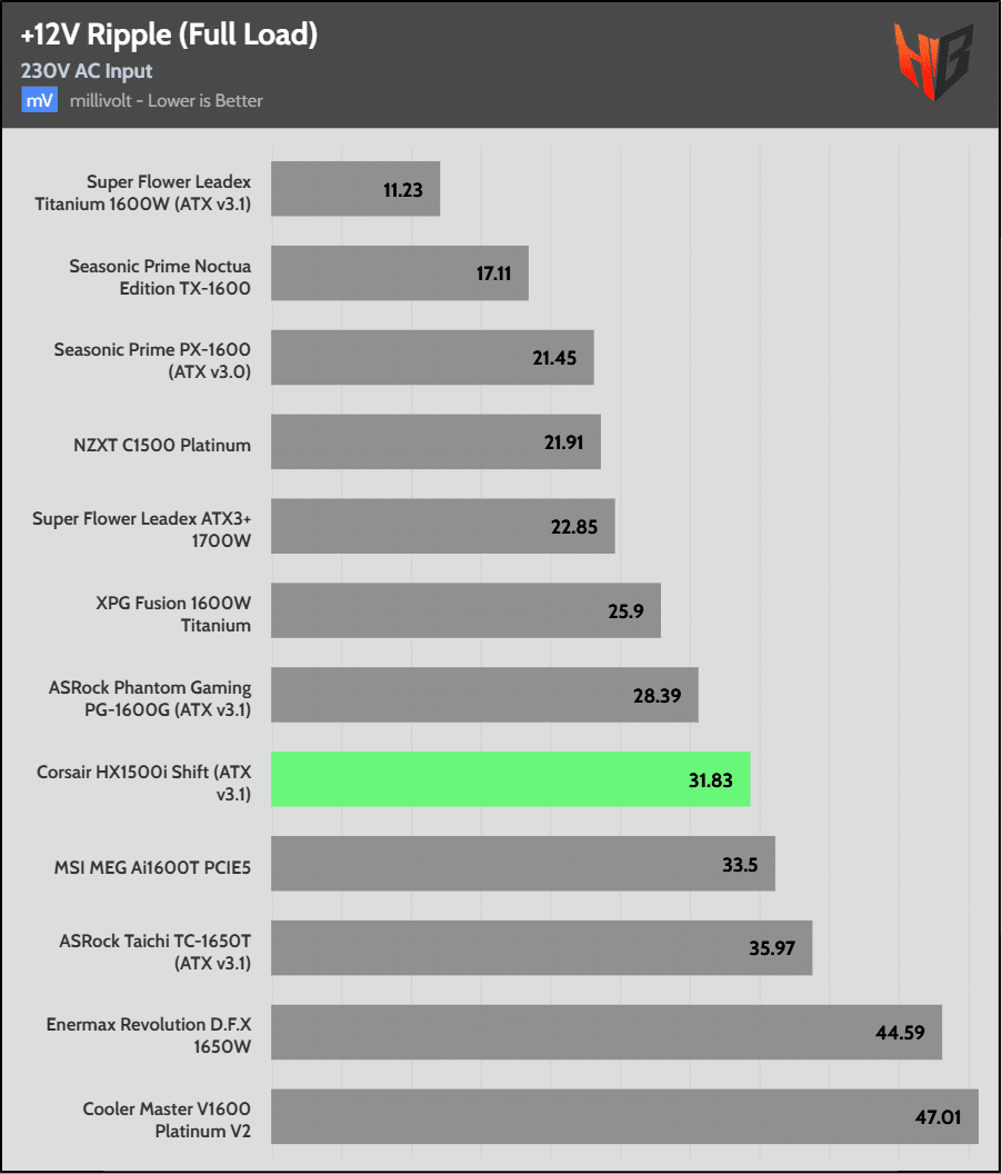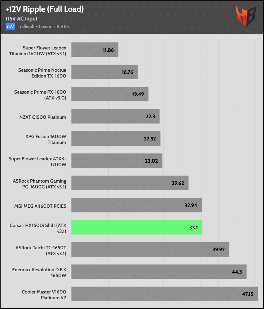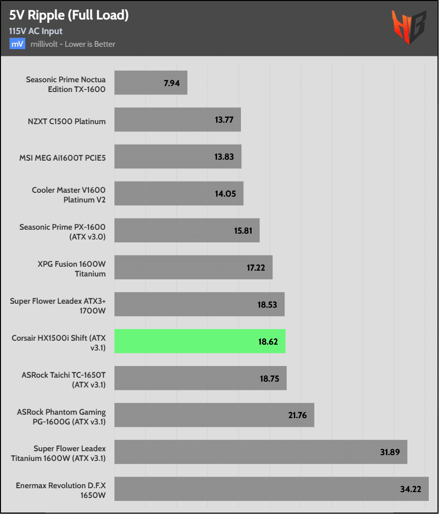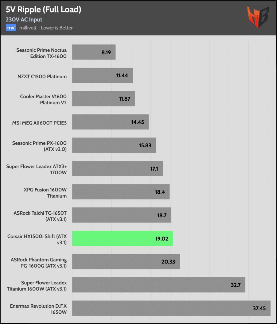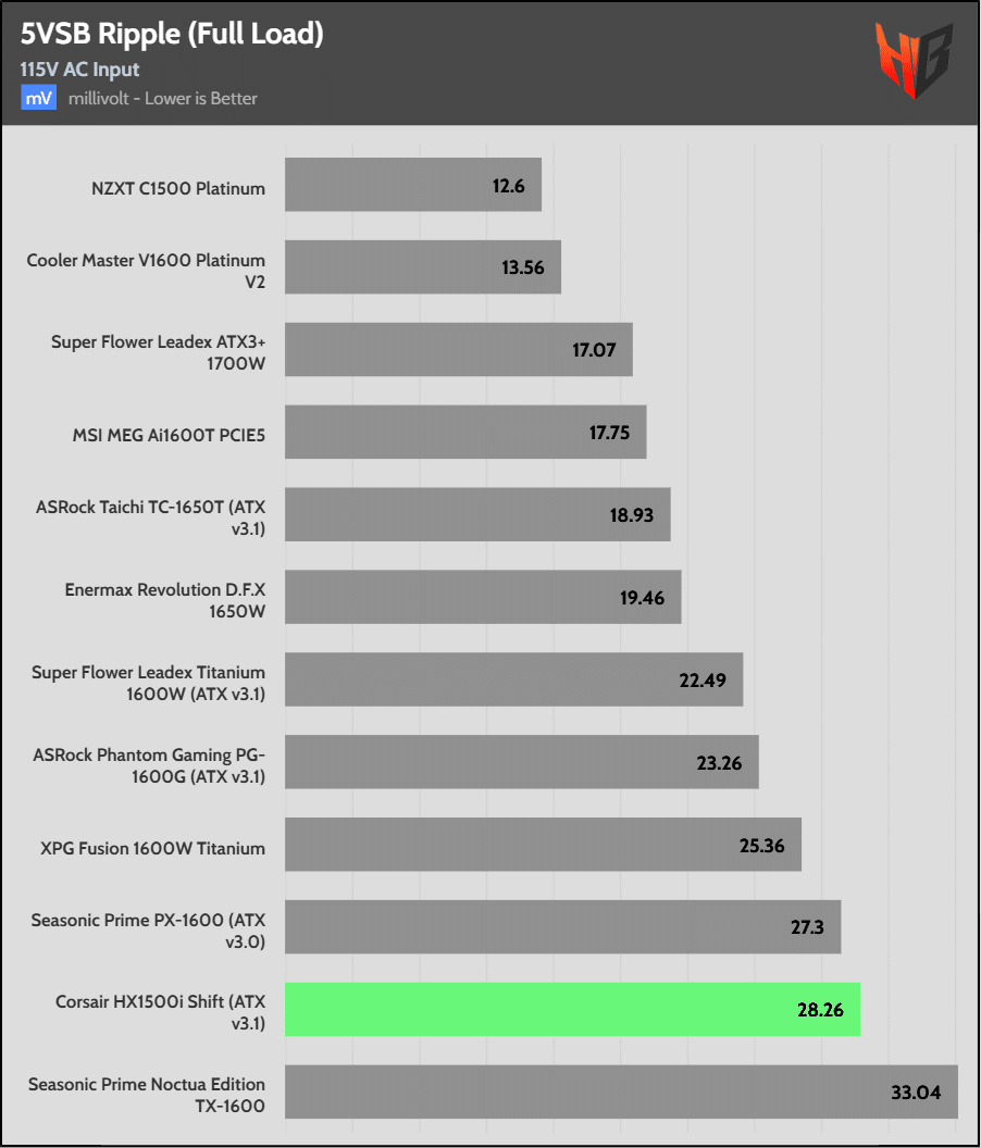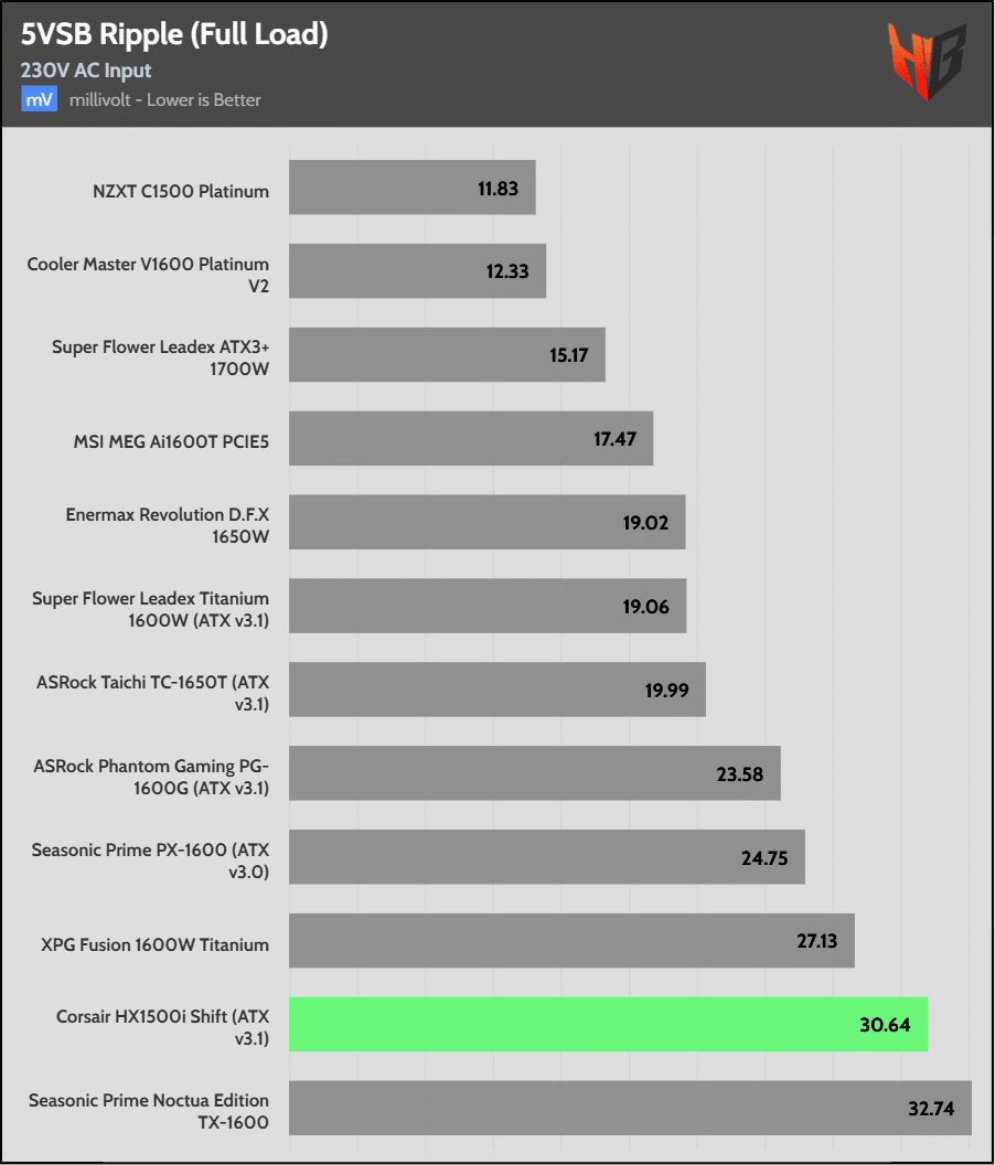 Ripple suppression is good overall, with only the 5VSB rail being away from the rest rails.