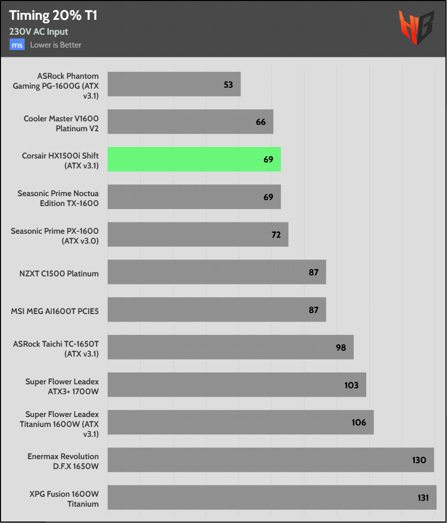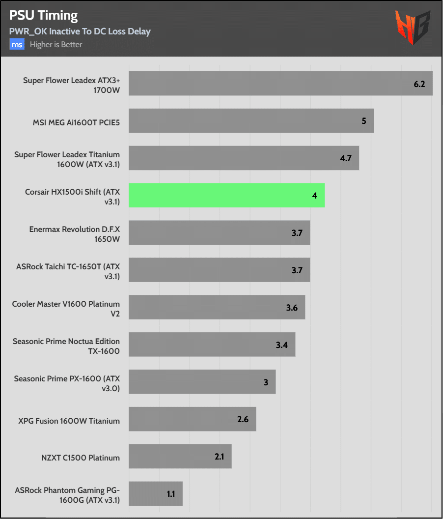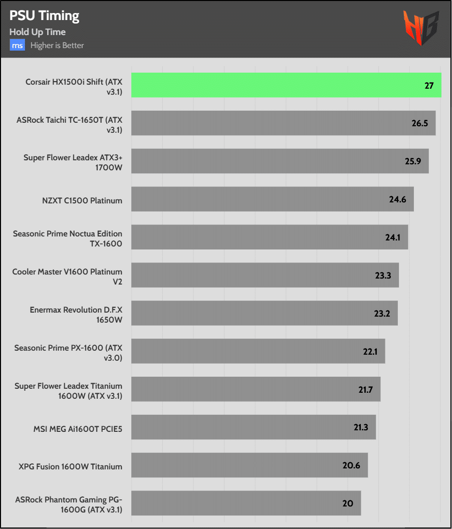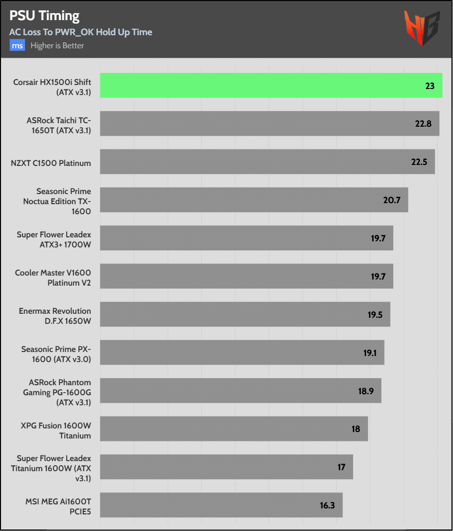 With three high-capacity bulk caps, it isn’t a surprise that the PSU achieves first place in hold-up time.