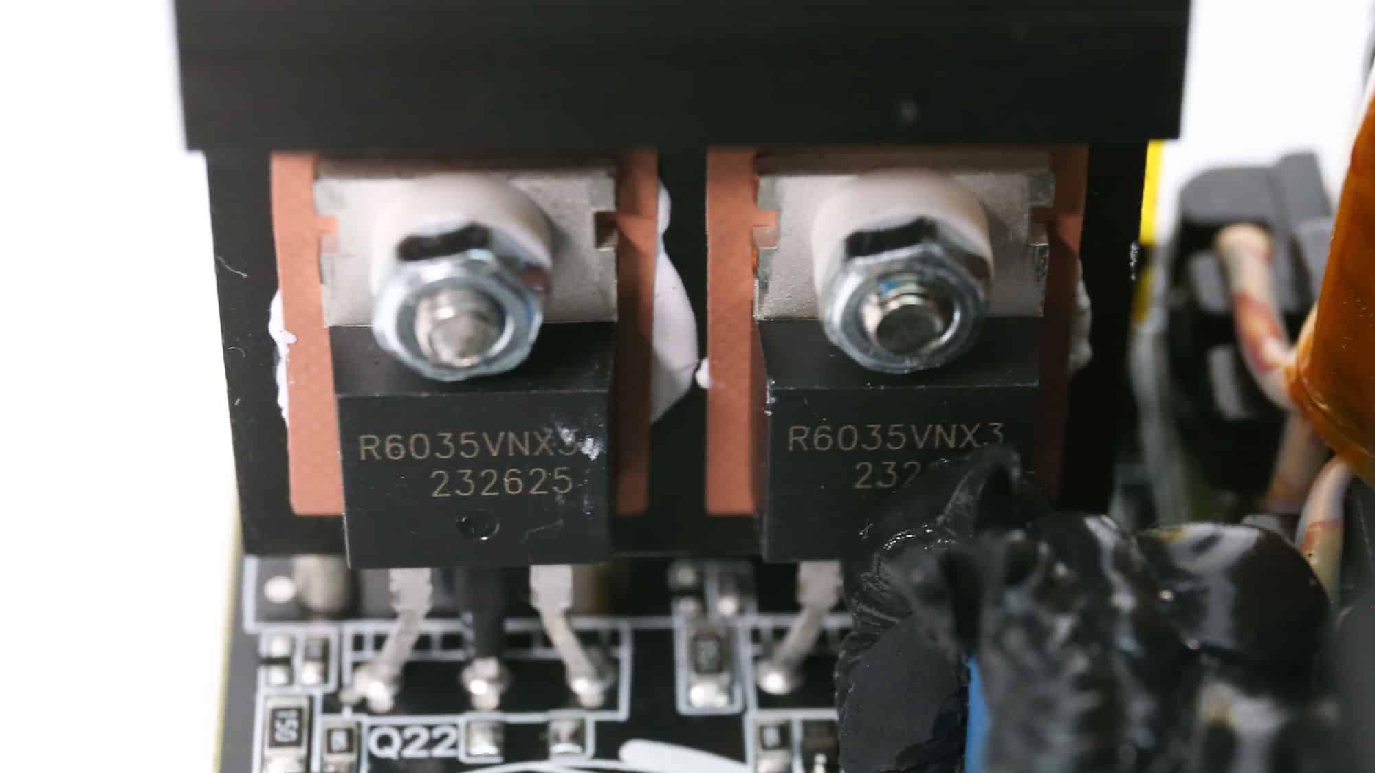 The APFC converter uses Infineon IPW60R060P7 FETs and a single ROHM SCS310AH boost diode. Rubycon and Nichicon manufacture the bulk capacitors. Their combined capacity is 860 μF, and both are rated for 2,000 hours at 105 °C. The voltage rating is 420V, which is well above the APFC’s DC bus voltage (approximately 380-400V DC).