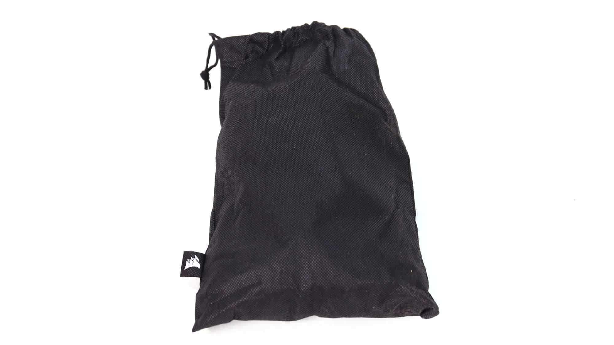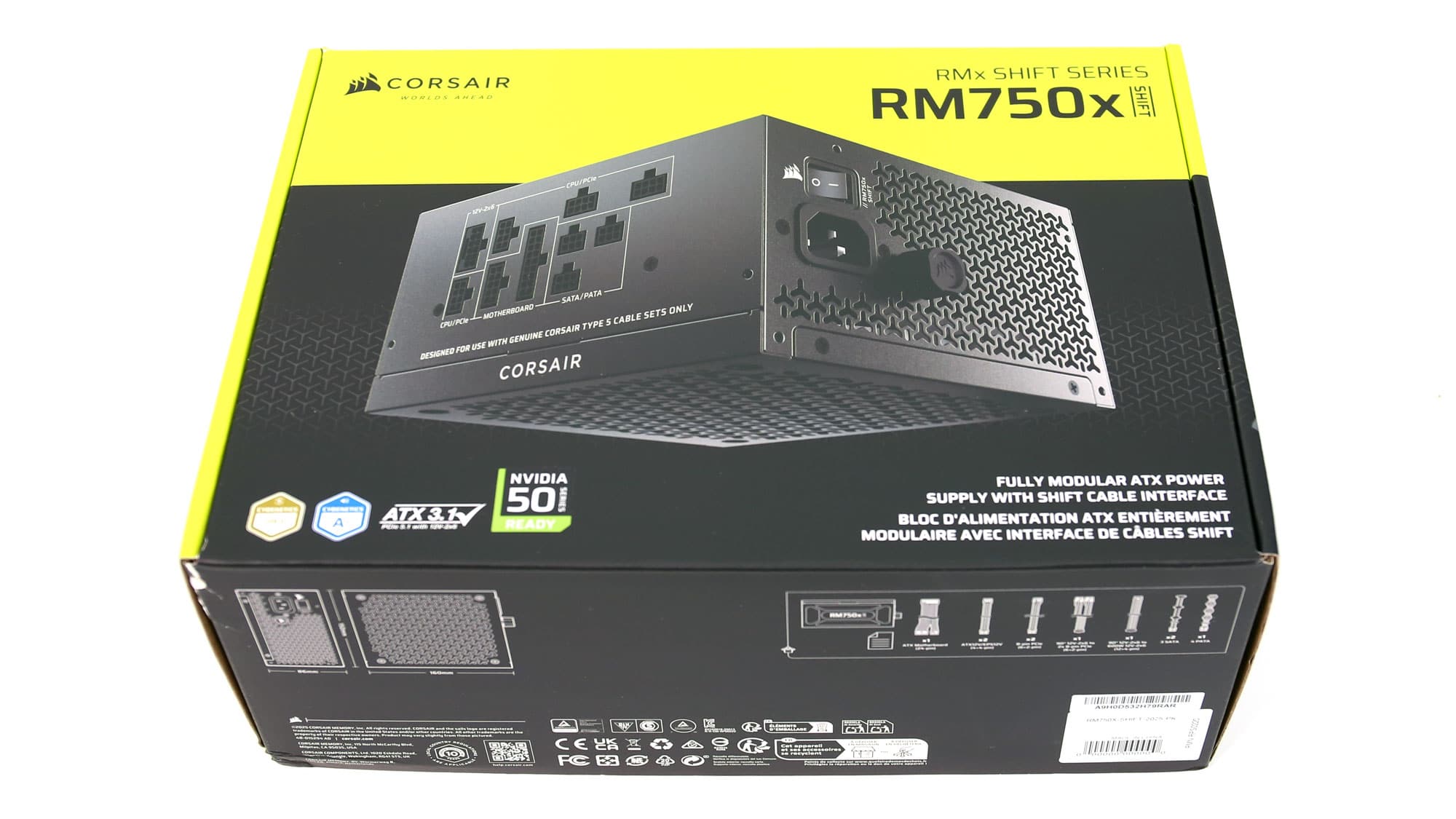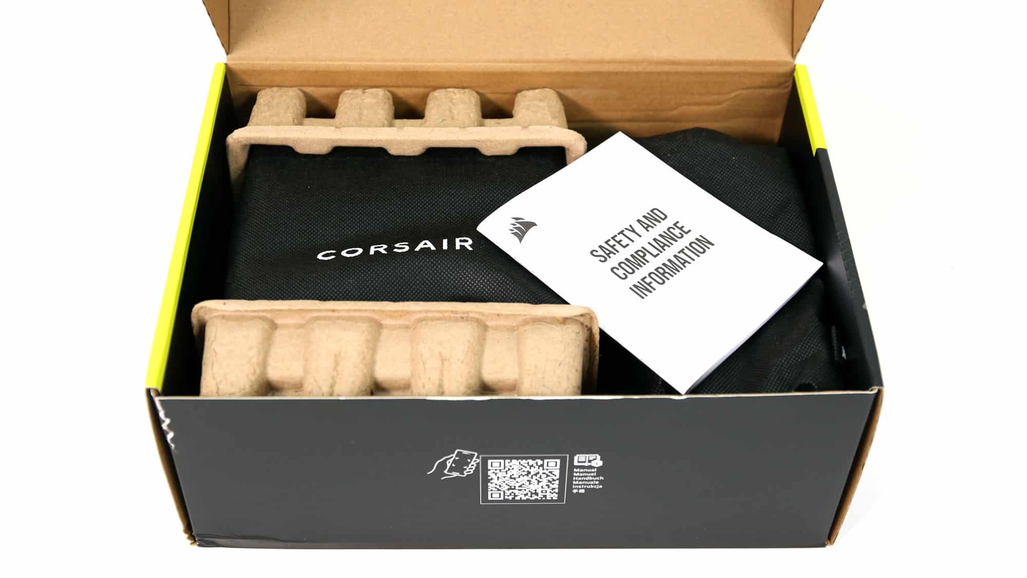 The box features a photo of the PSU on the front, along with badges showcasing its ATX v3.1 compliance and Cybenetics efficiency and noise ratings. Inside, Corsair uses recyclable packing materials—more eco-friendly, though less protective than foam. The PSU comes in a soft bag for extra protection, and there’s also a separate pouch for the modular cables to help keep unused ones neatly organized.