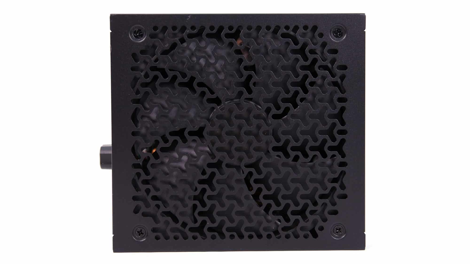 The PSU has standard dimensions, and its punched fan grille offers ample ventilation, even if the perforations are on the smaller side. The front panel includes the AC inlet, power switch, and a fan-speed control knob, allowing users to adjust cooling performance to their liking.
