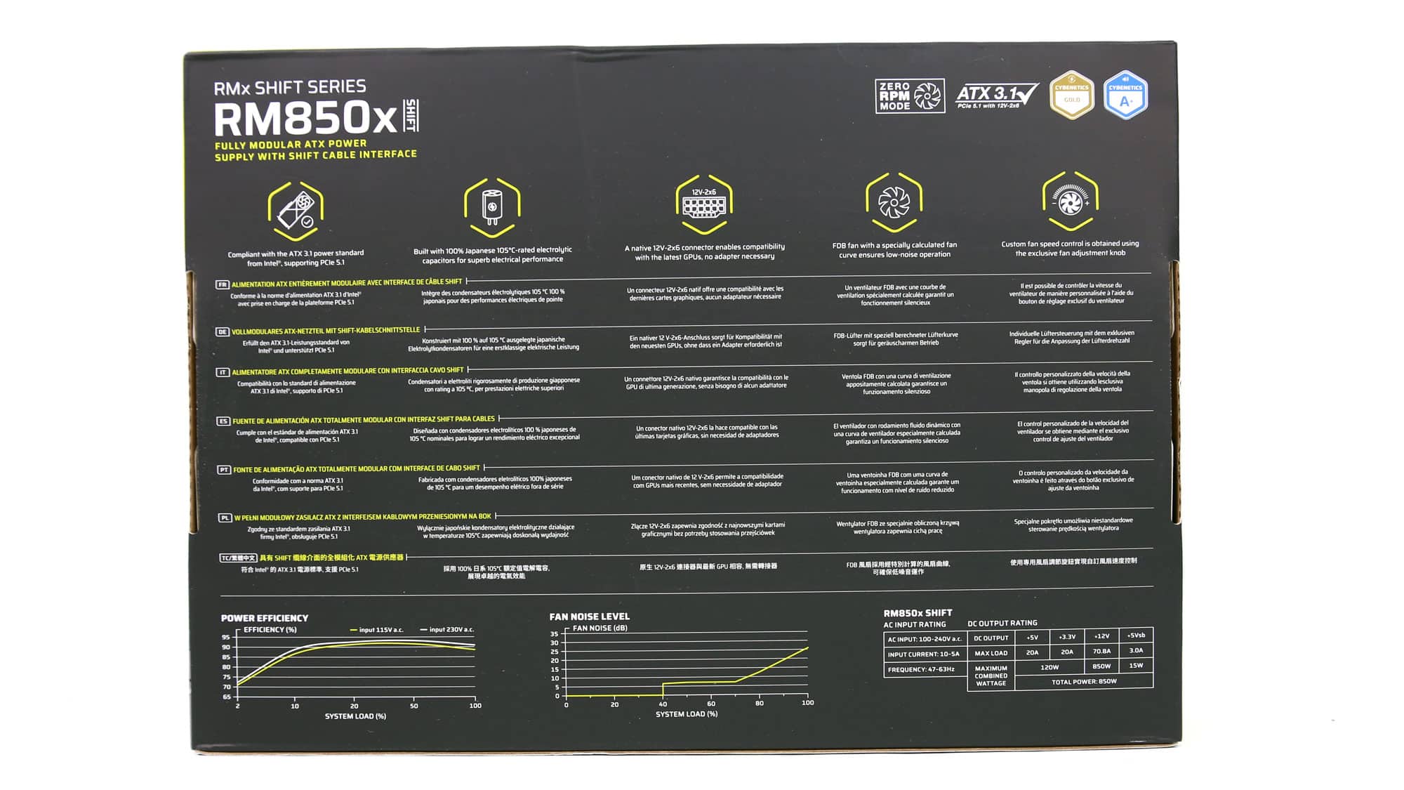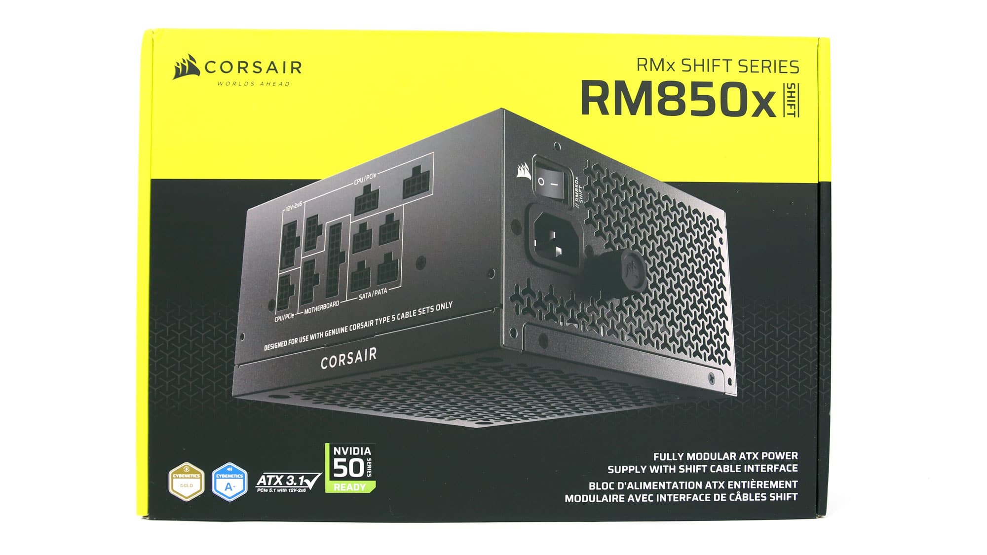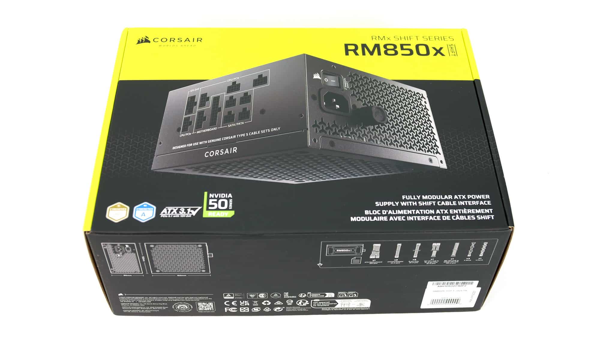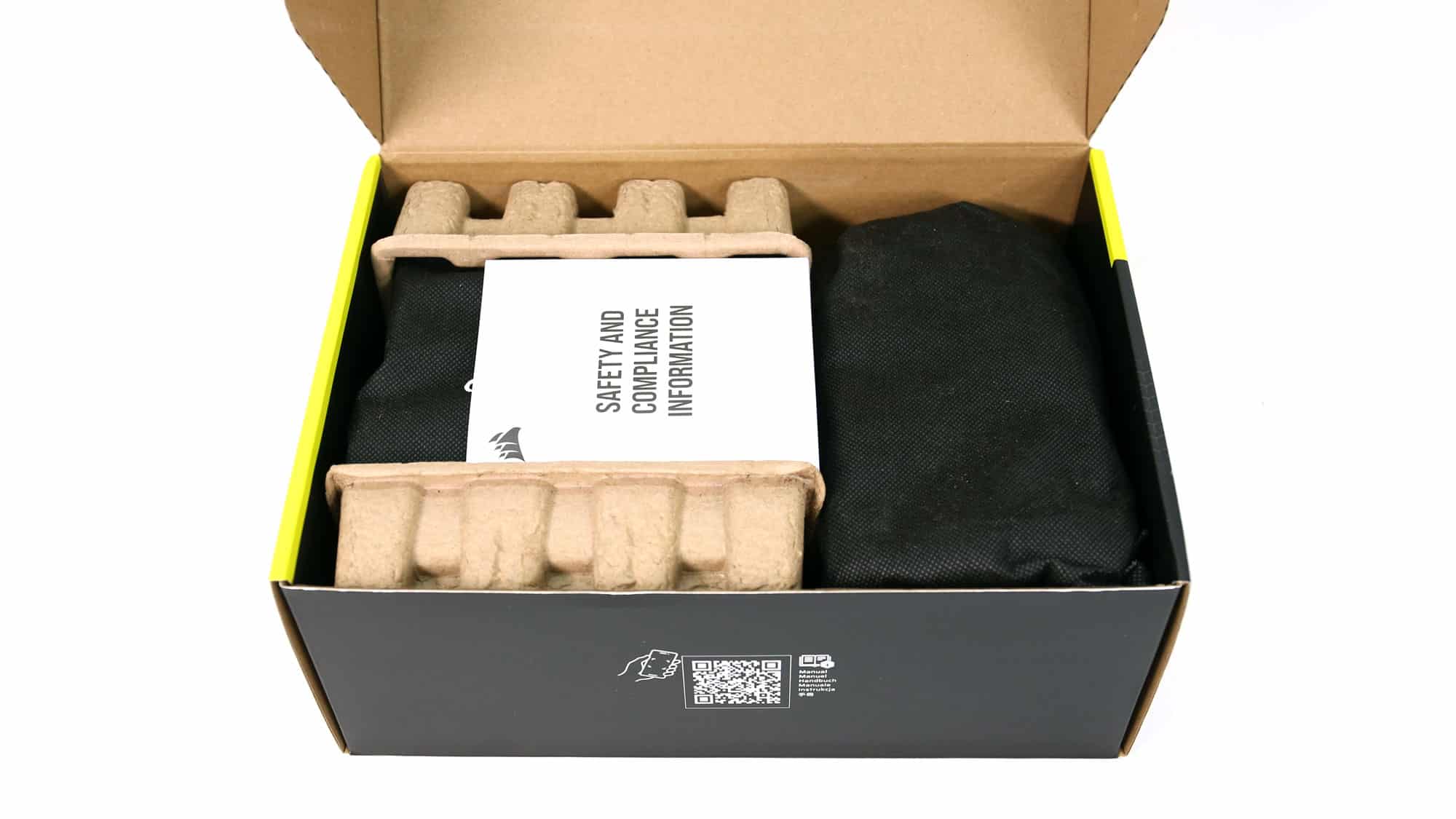 The box displays a photo of the PSU on the front, along with four feature badges highlighting ATX v3.1 compliance and its Cybenetics efficiency and noise ratings. Inside, Corsair uses recyclable packing material—better for the environment, though not as protective as foam. The PSU is placed in a soft bag for added safety, and a separate pouch is included to organize and store the modular cables, helping keep any unused ones tidy.