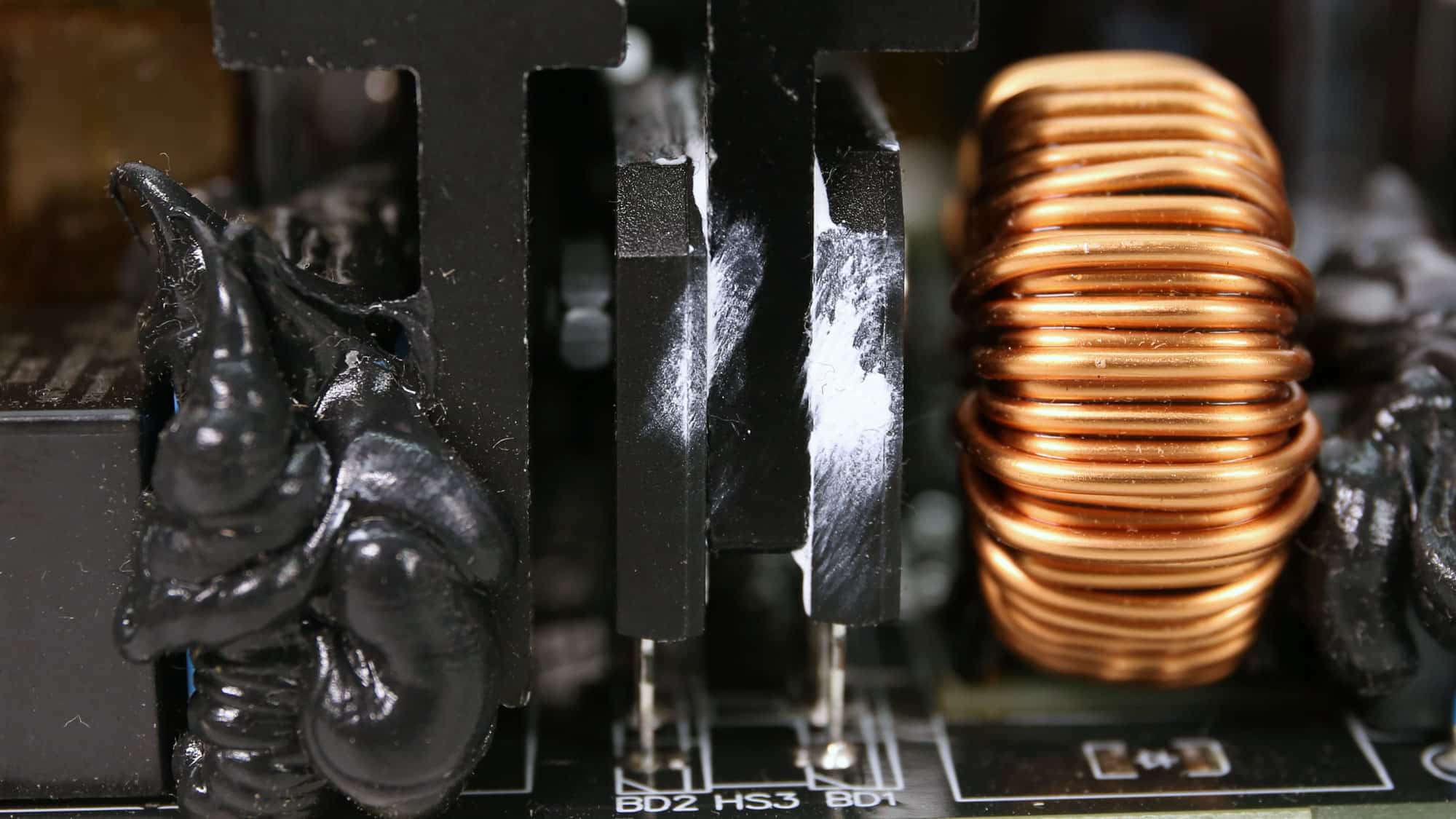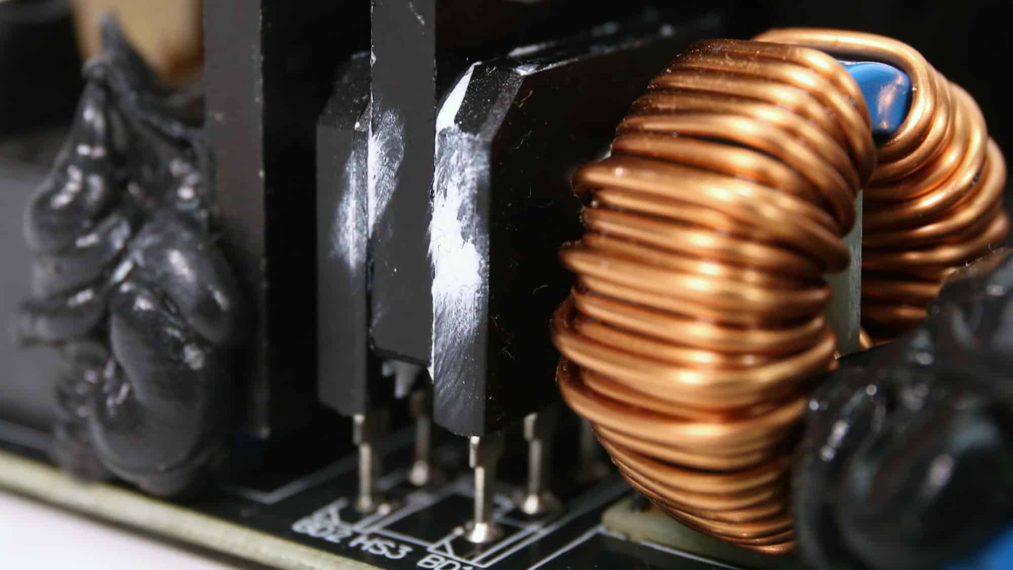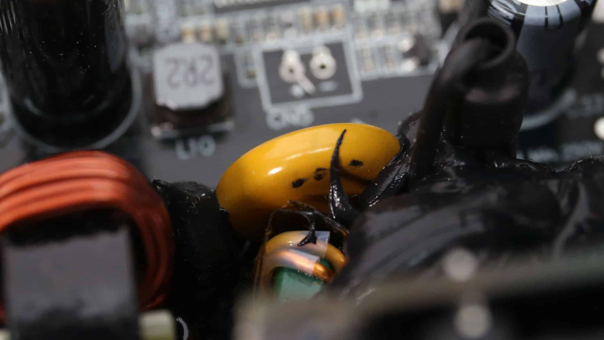 The PSU’s main transformer. One of its main functions is to isolate the primary and secondary sides electrically.