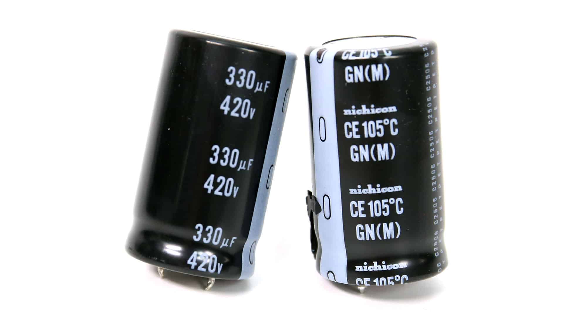 The APFC converter uses two STMicroelectronics STW33N60DM2 FETs and a single ROHM SCS308AH boost diode. Nichicon manufactures the bulk capacitors. Their combined capacity is 720 μF, and both are rated for 2,000 hours at 105 °C. The voltage rating is 420V, which is well above the APFC’s DC bus voltage (approximately 380-400V DC).