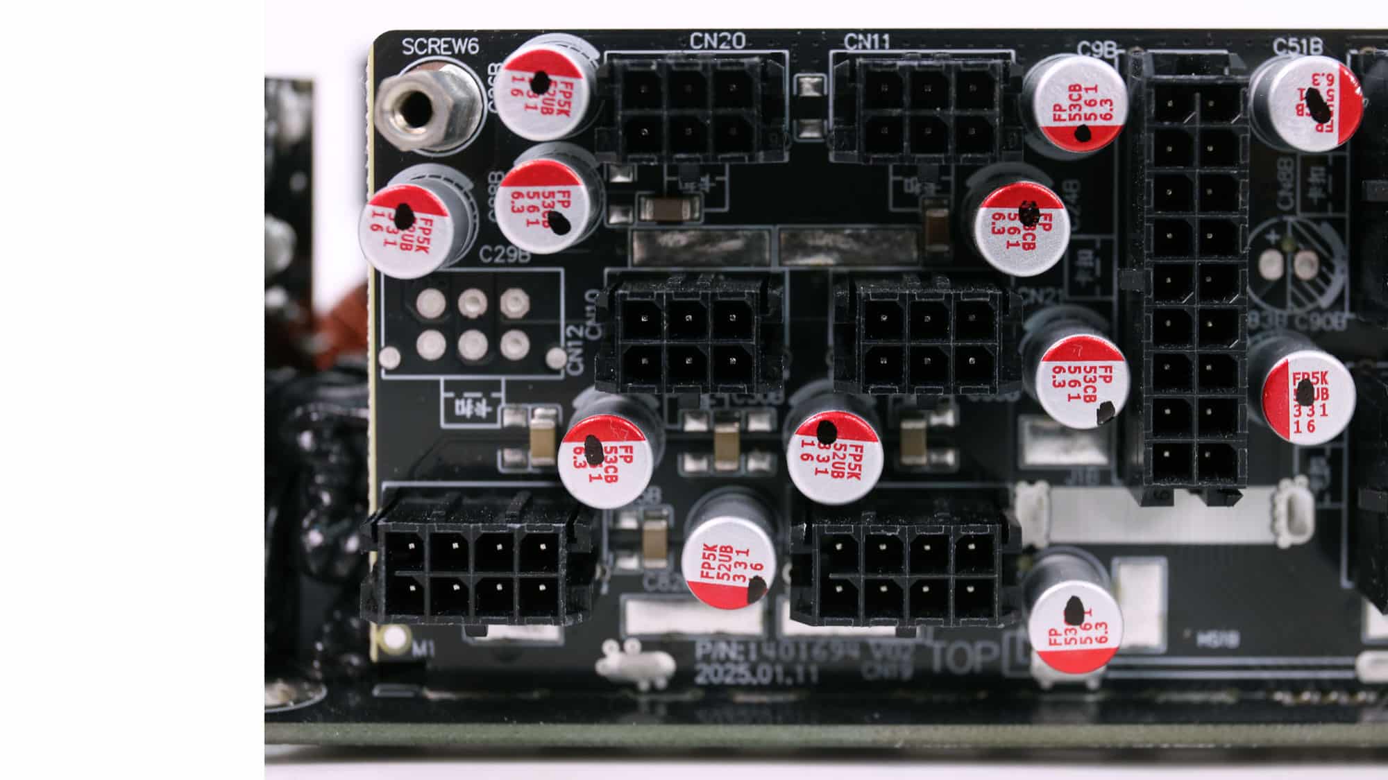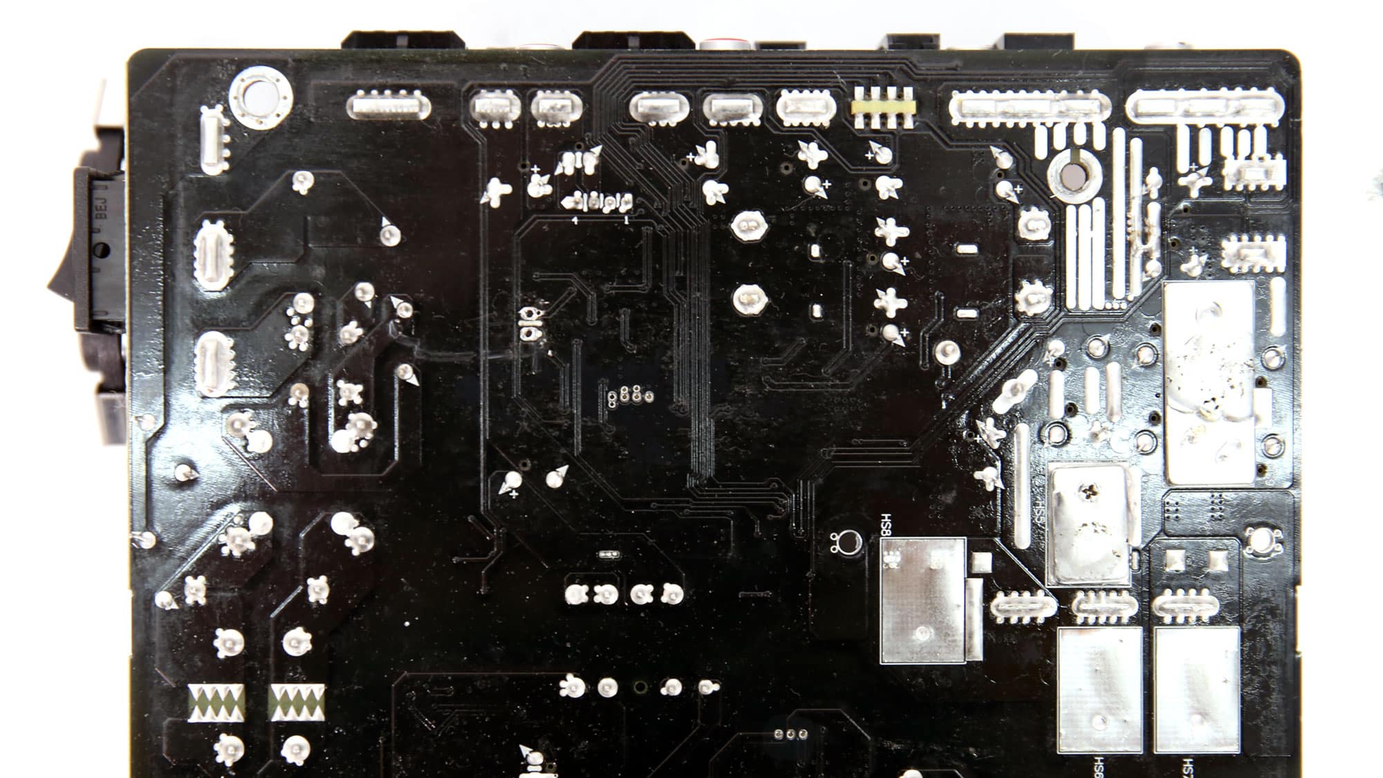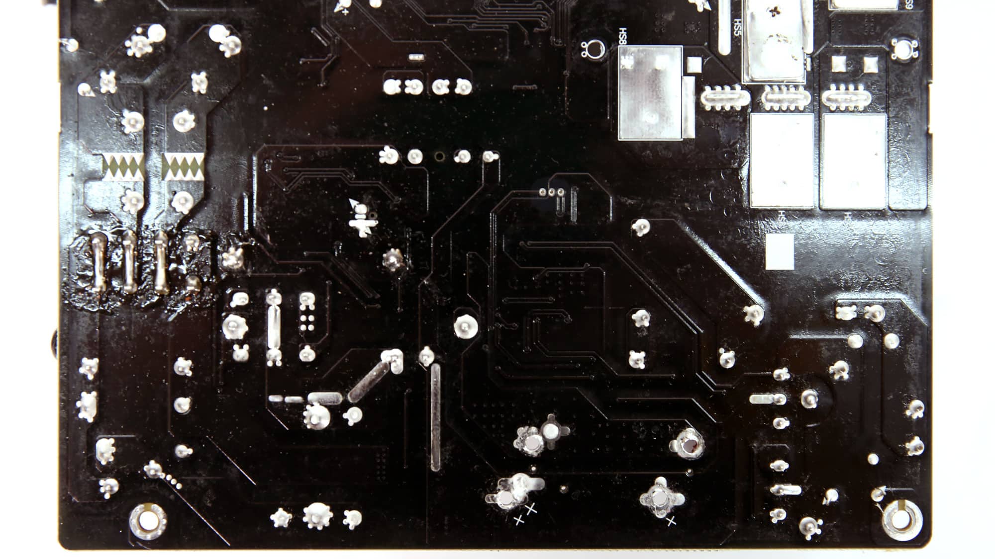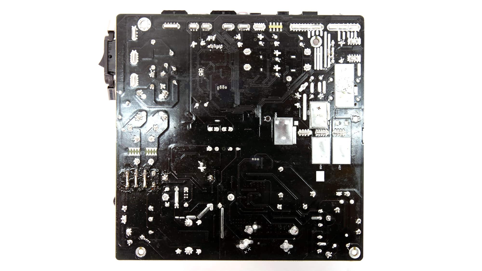 There are no parts installed on the PCB’s solder side. Under the bridge rectifiers, the PCB’s surface was overheated, which notably affected its finish.
