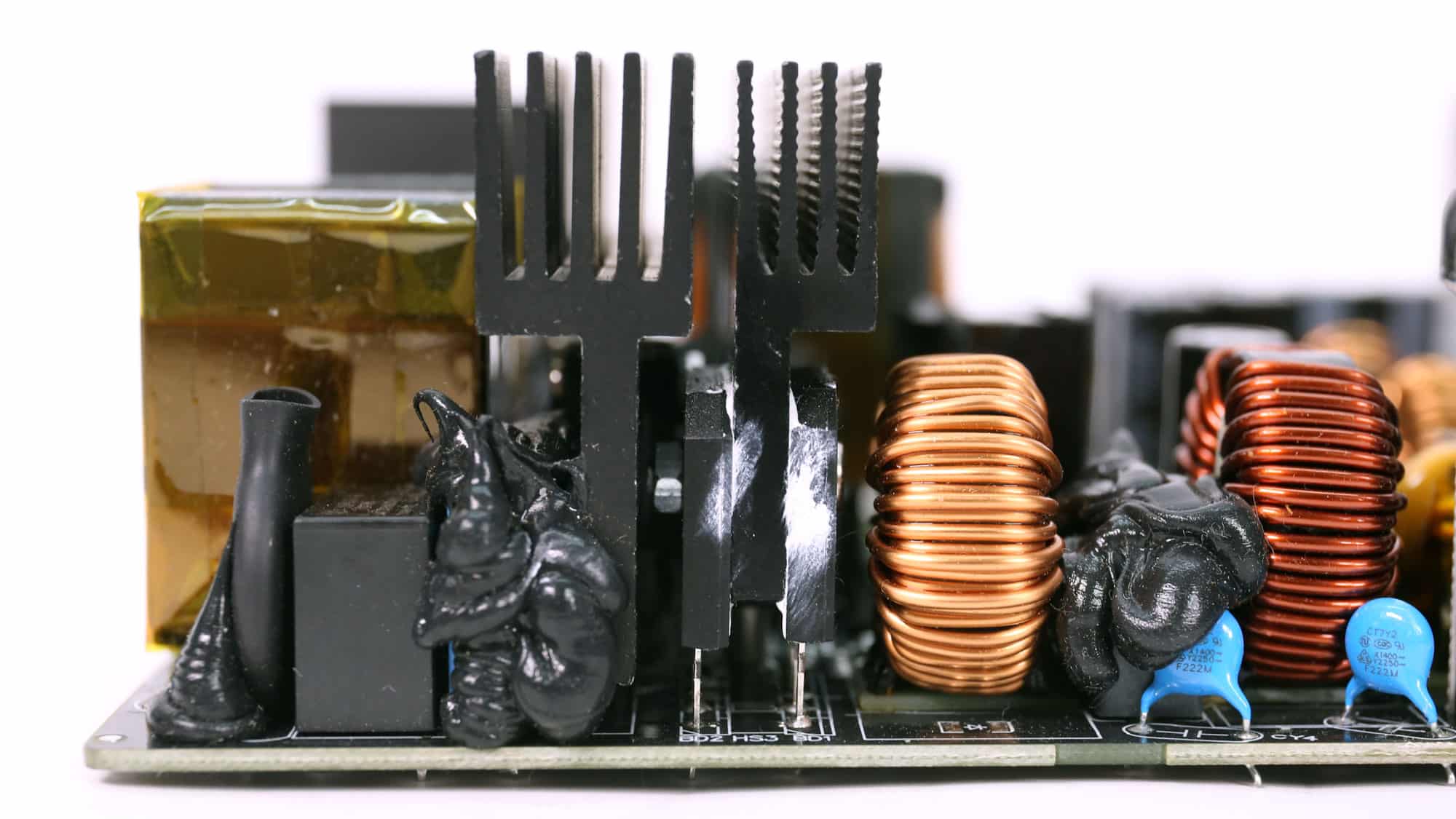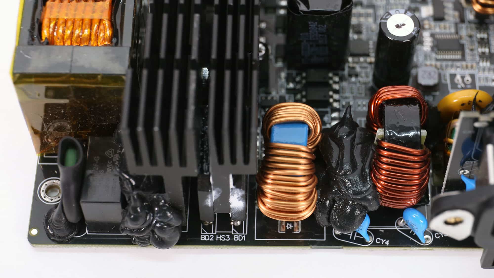 Great Wall manufactures this platform, built around the MPS HR1200 controller, which combines a digital PFC stage and a half-bridge resonant controller in one chip. The compact layout uses adequately sized heatsinks, and the secondary side is spacious enough to ensure good airflow, allowing the fan to run at lower speeds while still removing heat effectively—resulting in reduced noise. Another noteworthy aspect is that the minor-rail regulation circuits are mounted directly on the main PCB rather than on a daughterboard, placing them in the path of the fan’s airflow. This improves cooling and prevents minor rail load changes from noticeably increasing fan speed, unlike in many other designs, particularly those from CWT.