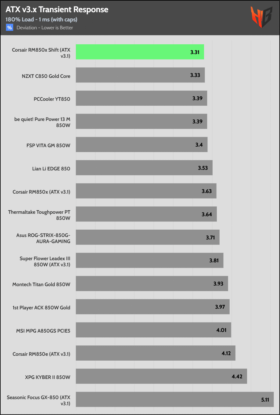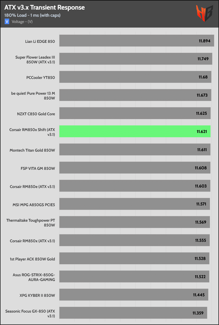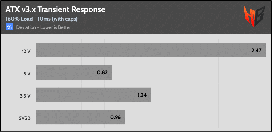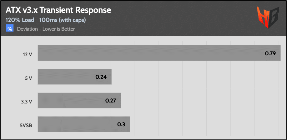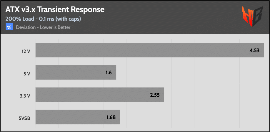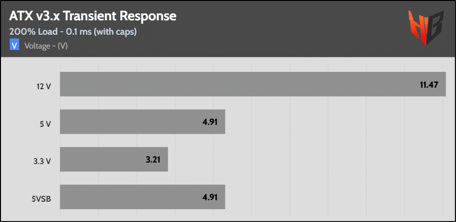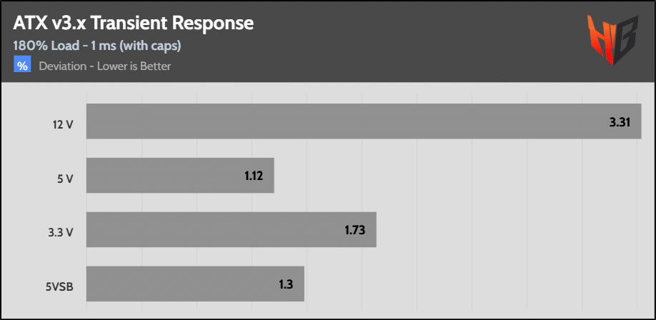 [Note] For PSUs without a 12+4 pin connector, the maximum applied load for the transient response tests is 150%, rather than 200%.The PSU passes all ATX v3.1 transient response tests, but the 3.3V rail drops below 3.2V at the 200% load test.