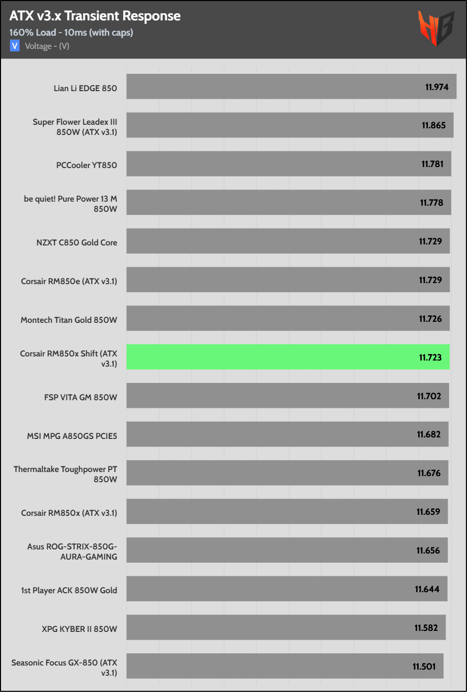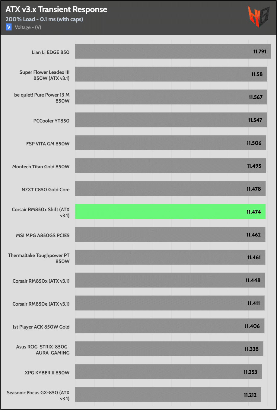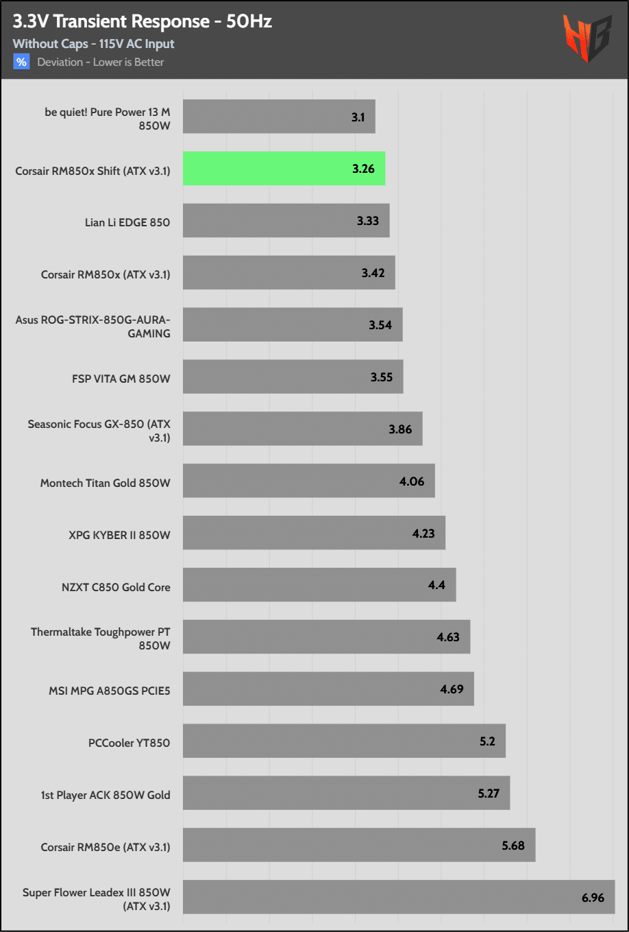 [Note] For PSUs without a 12+4 pin connector, the maximum applied load for the transient response tests is 150%, rather than 200%.The PSU passes all ATX v3.1 transient response tests, but the 3.3V rail drops below 3.2V at the 200% load test.