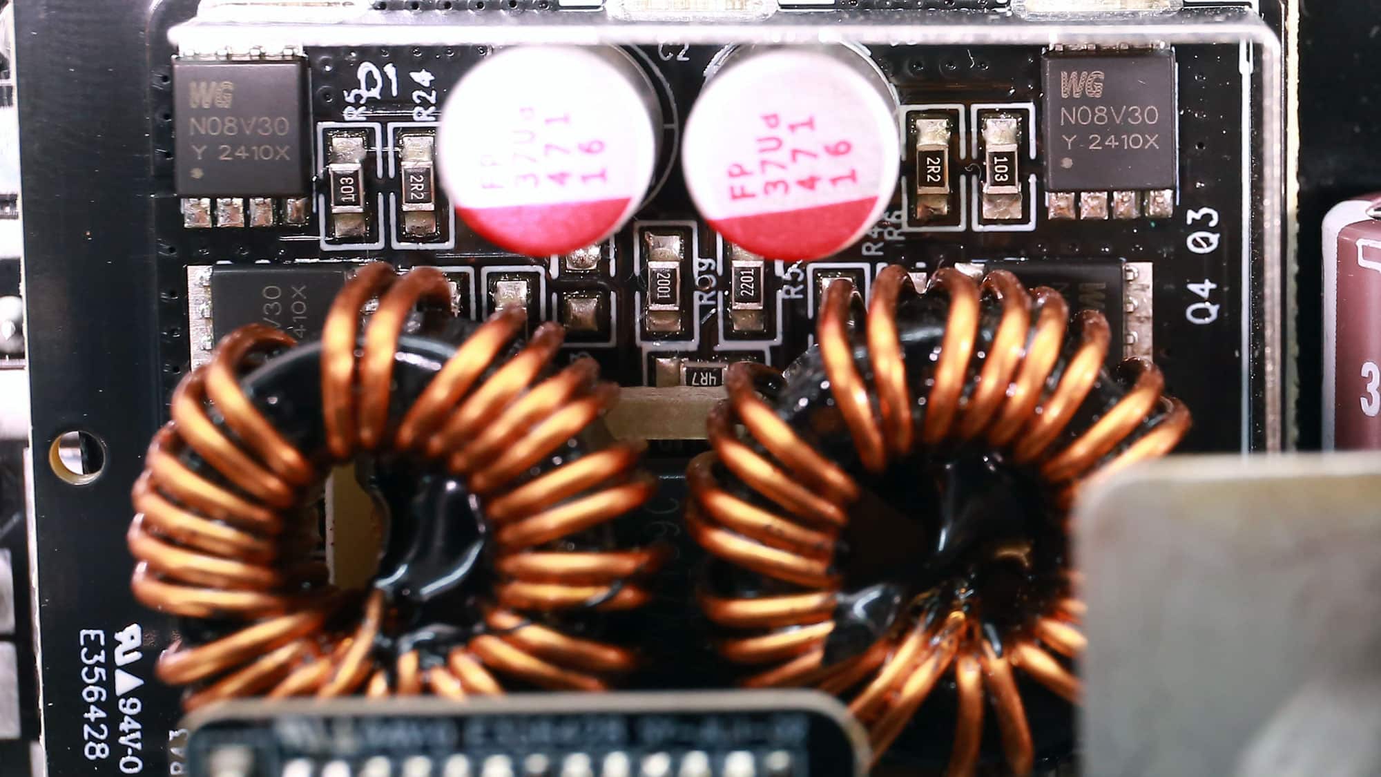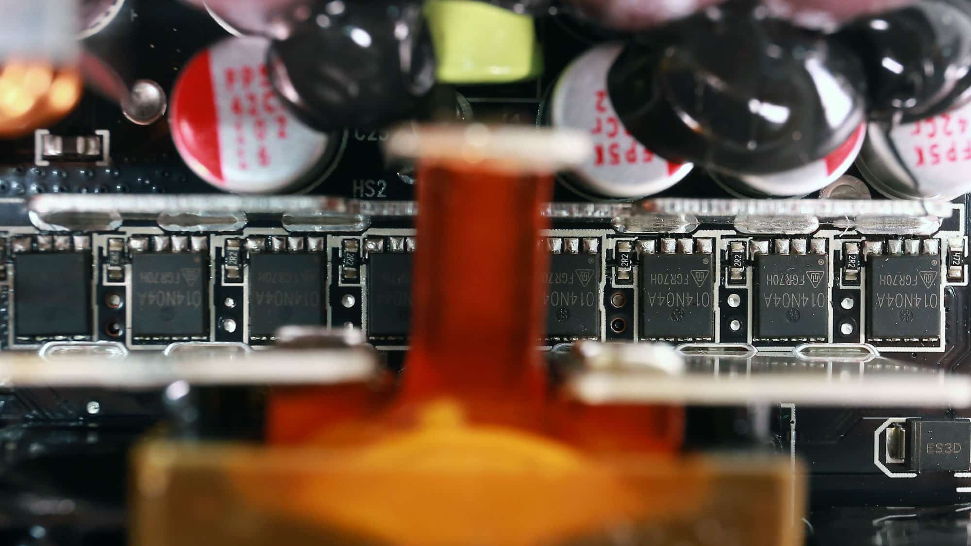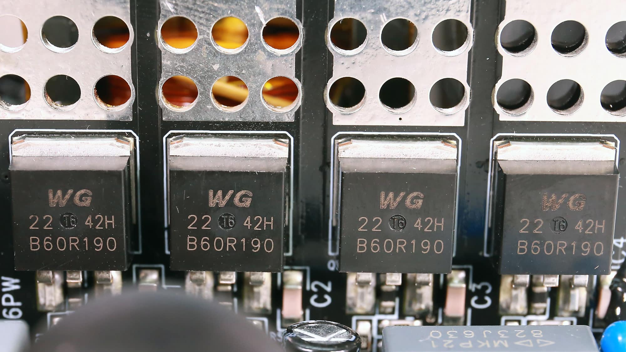 Eight 014N04A FETs regulate the 12V rail. They are installed on the business side of the PCB, and several vertical heatsinks cool them.