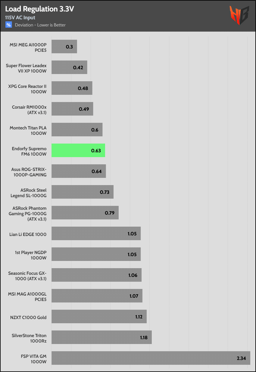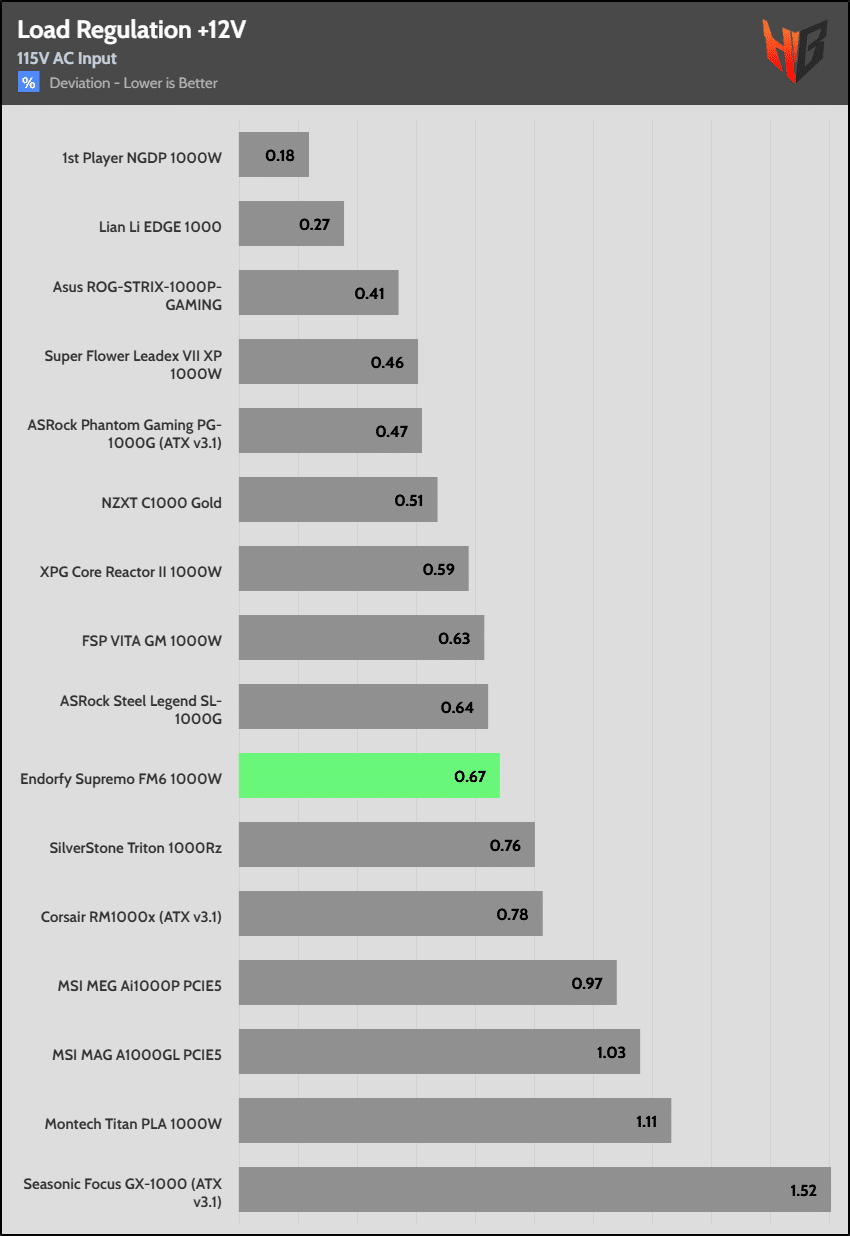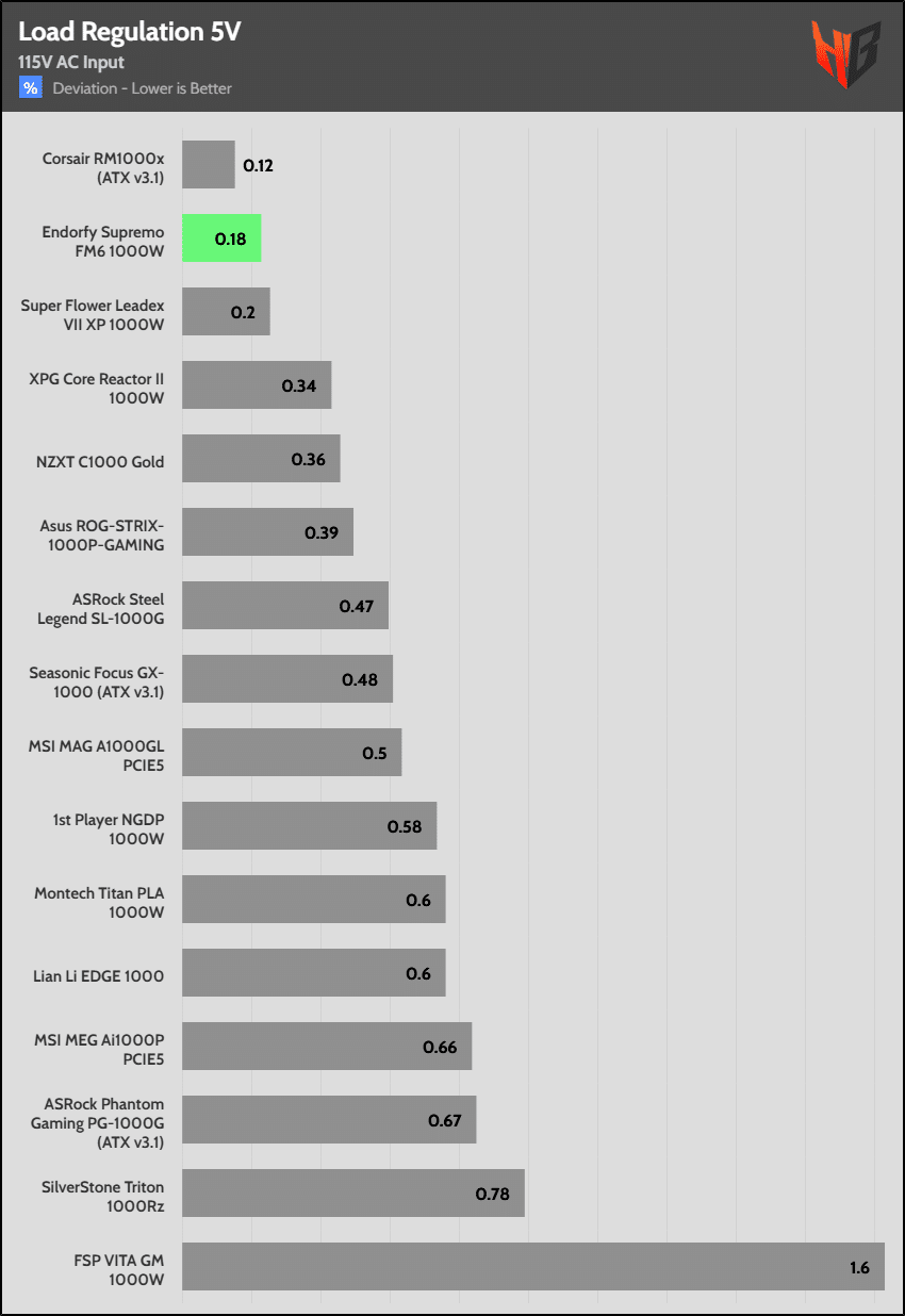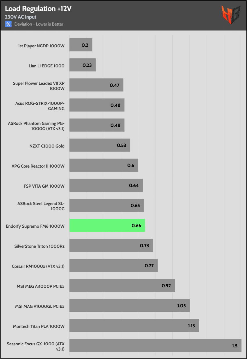Test | 12V | 5V | 3.3V | 5VSB | DC/AC (Watts) | Efficiency | Fan Speed (RPM) | PSU Noise (dB[A]) | Temps (In/Out) | PF/AC Volts |