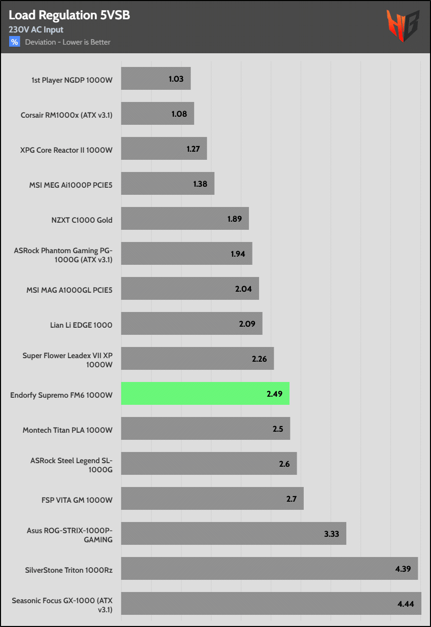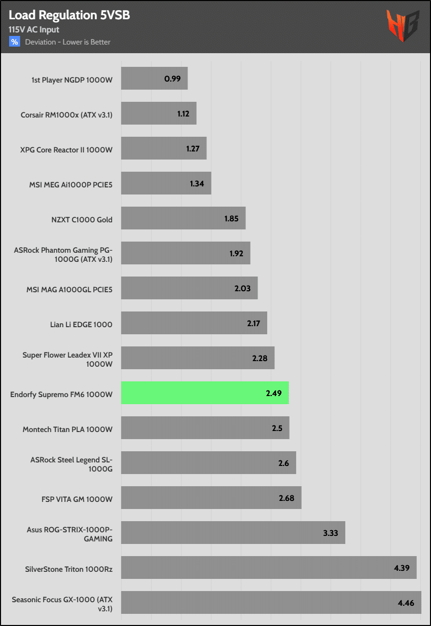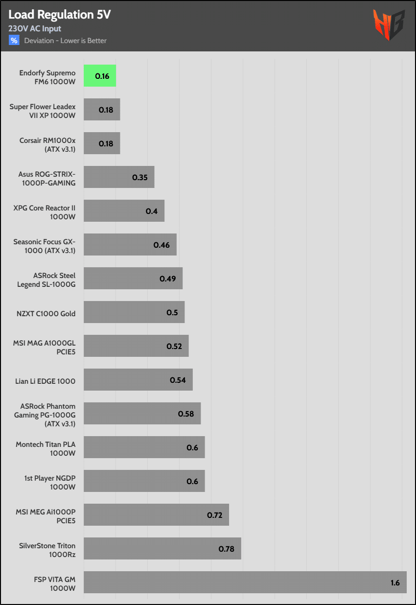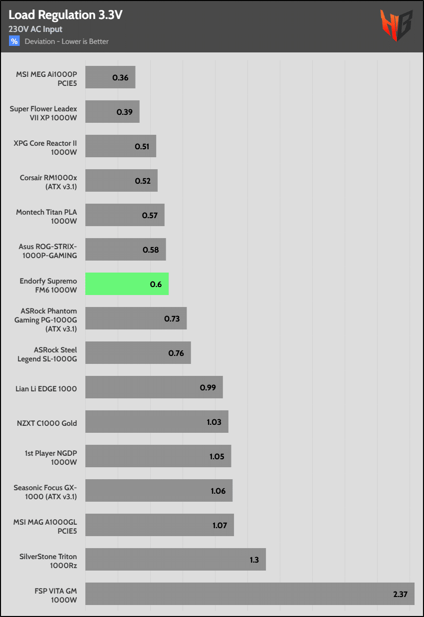 Test | 12V | 5V | 3.3V | 5VSB | DC/AC (Watts) | Efficiency | Fan Speed (RPM) | PSU Noise (dB[A]) | Temps (In/Out) | PF/AC Volts |