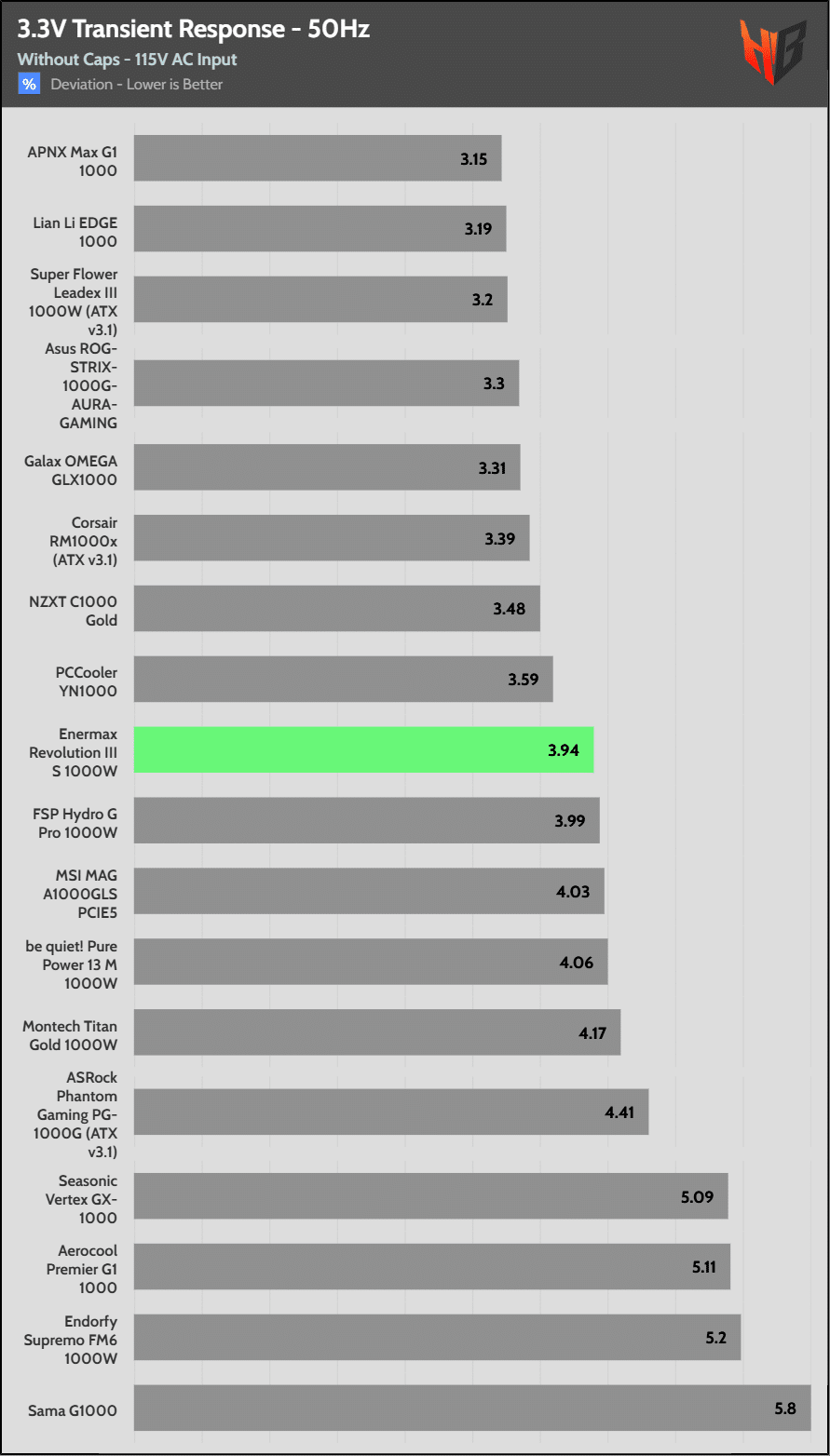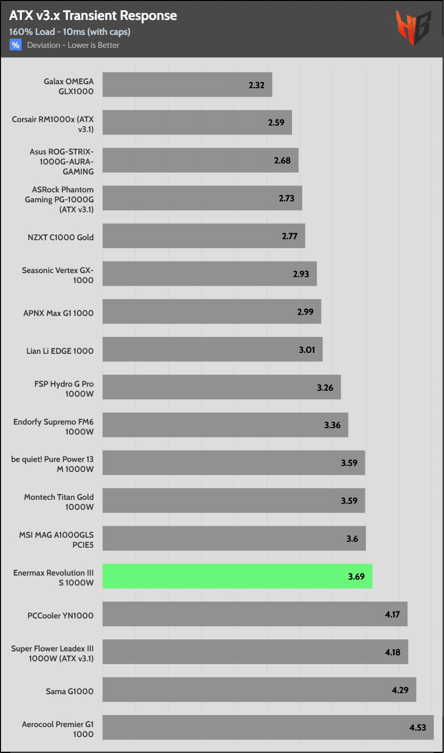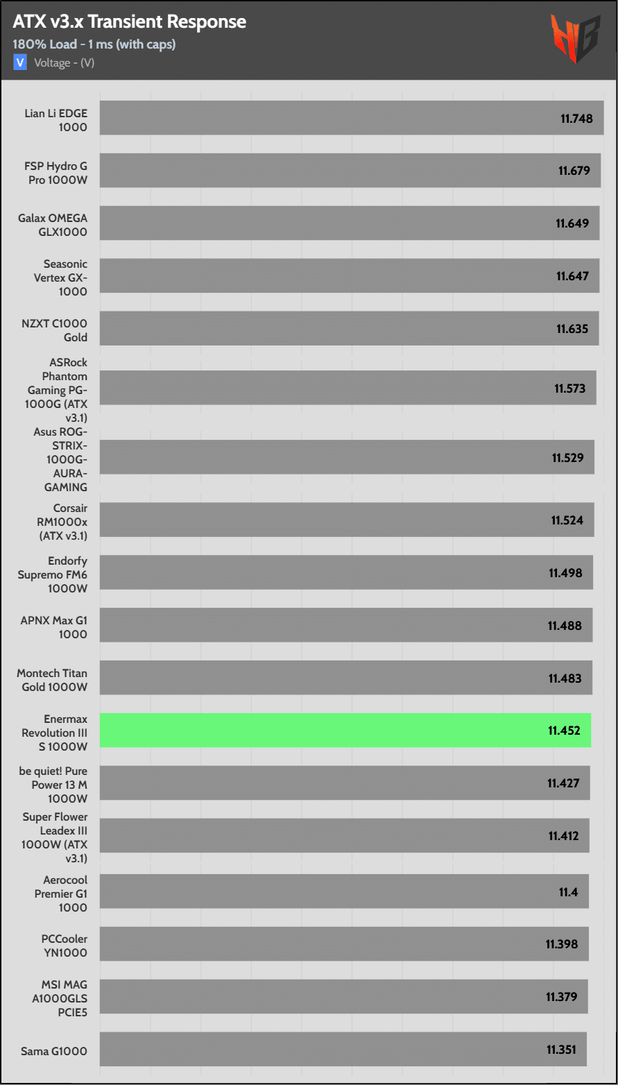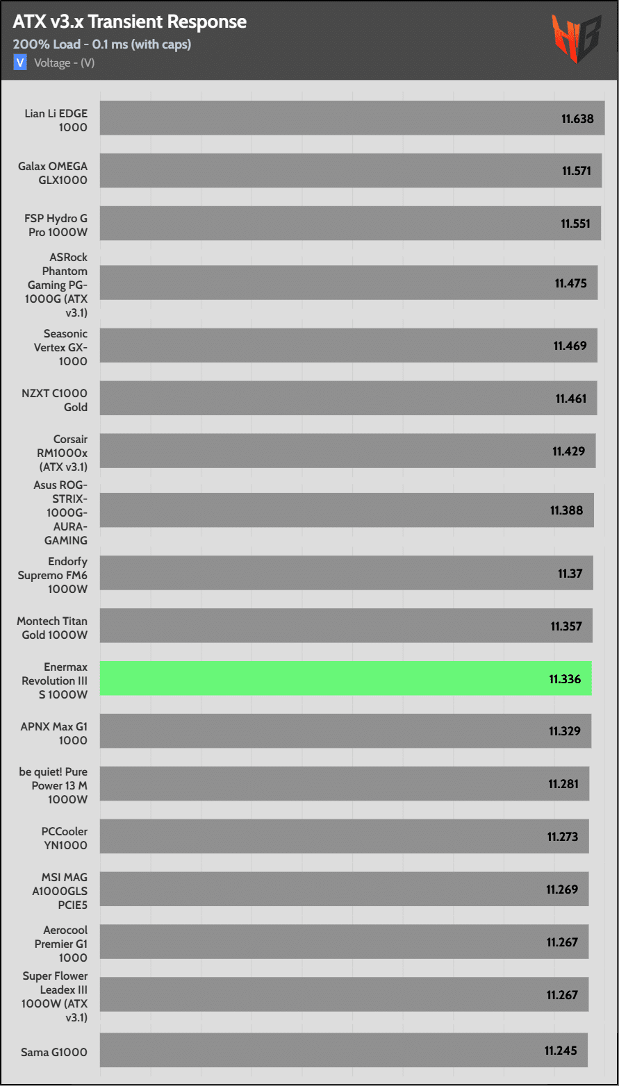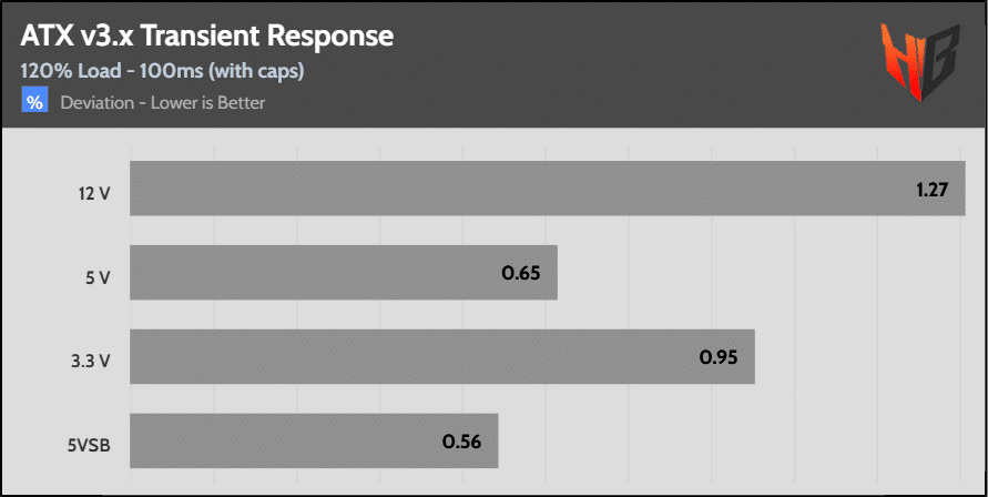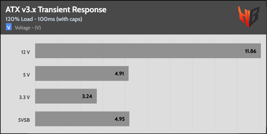 [Note] For PSUs without a 12+4 pin connector, the maximum applied load for the transient response tests is 150%, rather than 200%.The PSU passes all ATX v3.1 transient response tests, but the 3.3V rail drops low.