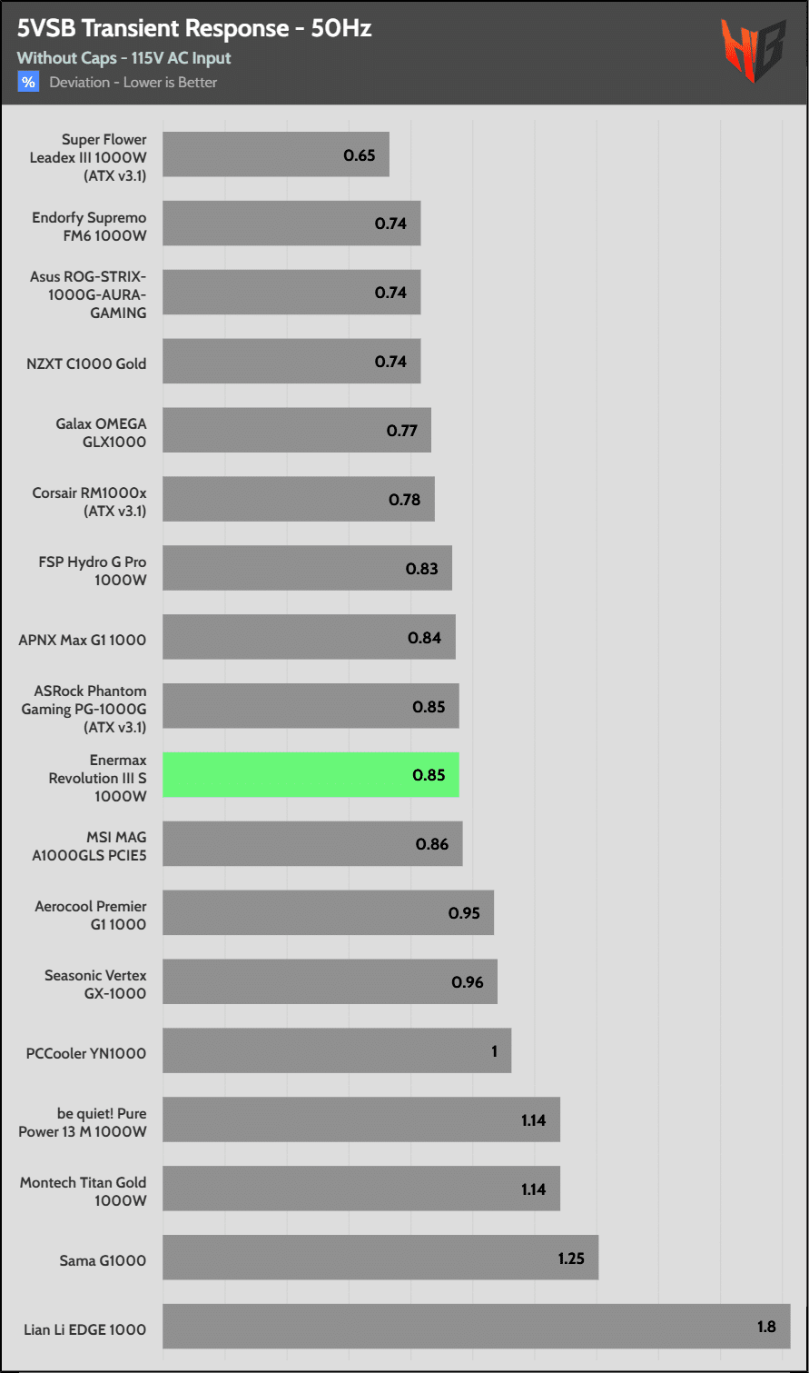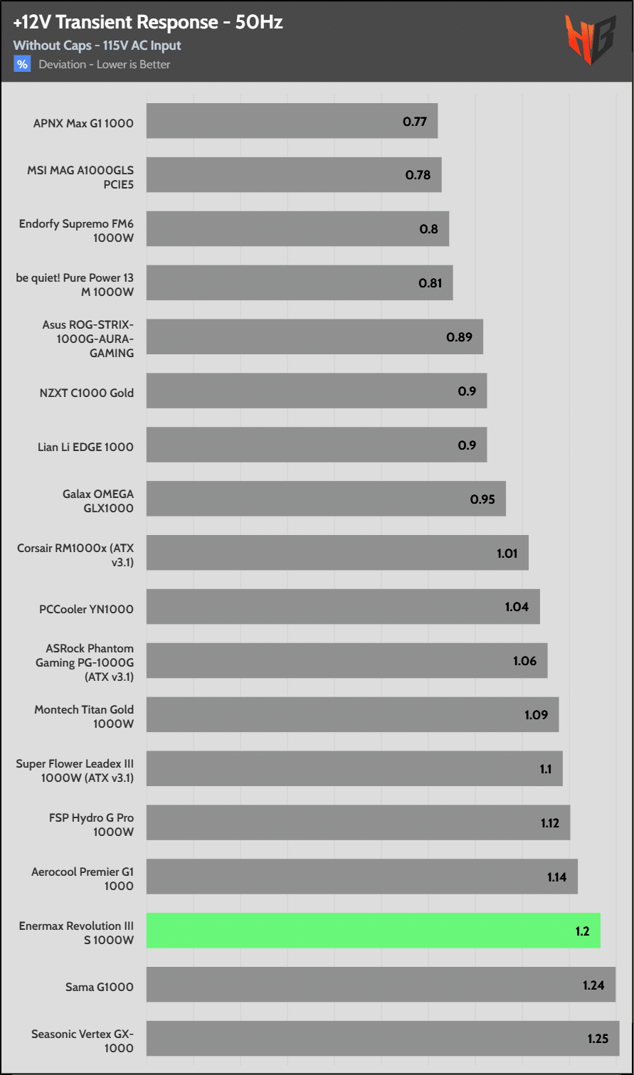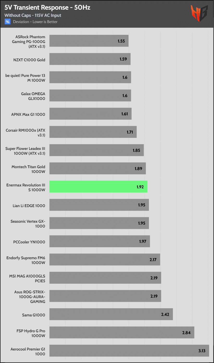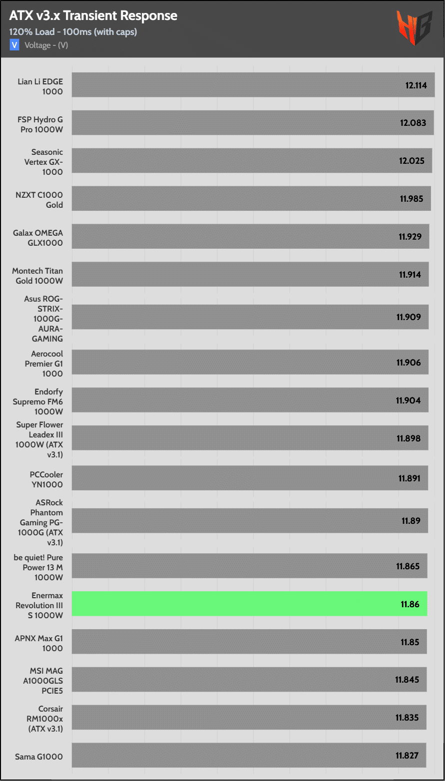 Which transient response results are you referring to? The transient response tests with normal loads, which I do, and without capacitors? These are my tests; they are not included in any ATX spec. I have been conducting these for many years now, and they are there to compare all PSUs with load on all rails directly.