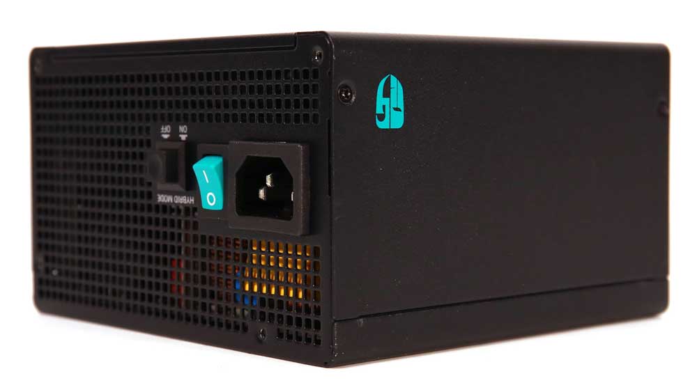 The punched fan grille is not restrictive but could be larger for better airflow. The unit’s dimensions are compact, with only 140mm depth. At the front side, you can find the AC receptacle and the power switch, and around the back, the modular panel hosts ten sockets, including a native 12V-2×6.