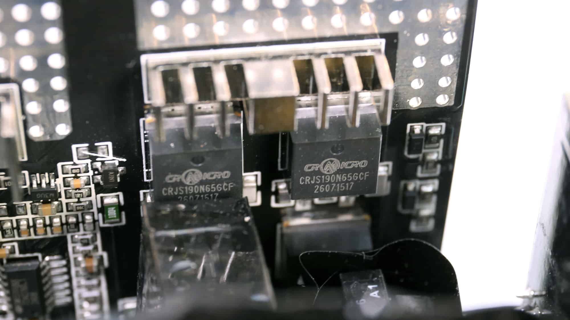 The four CRMicro CRJS190N65GCF primary switching FETs are installed in a full-bridge topology, and an LLC resonant converter is used for higher efficiency.
