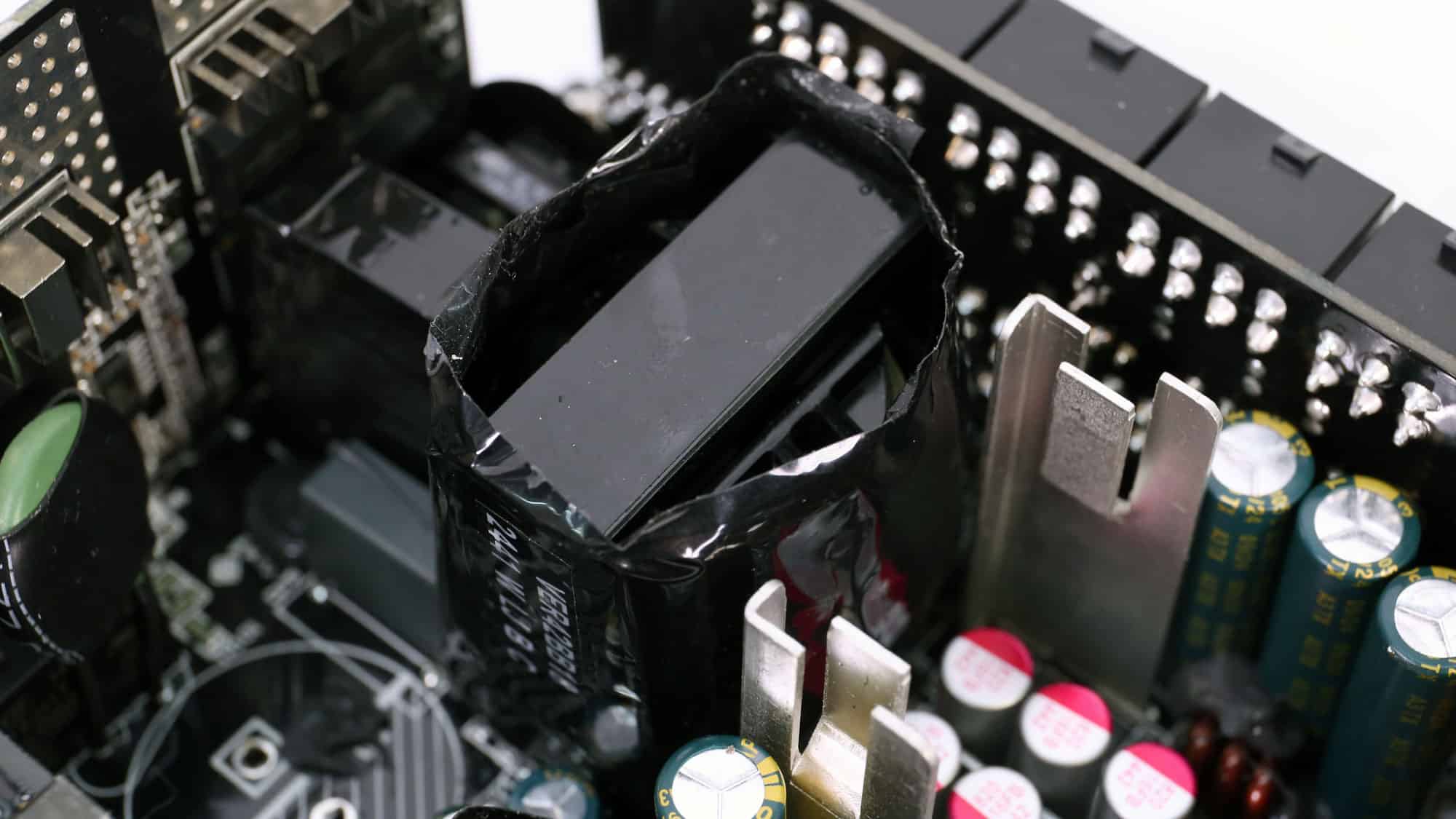 The PSU’s main transformer. One of its main functions is to isolate the primary and secondary sides electrically.