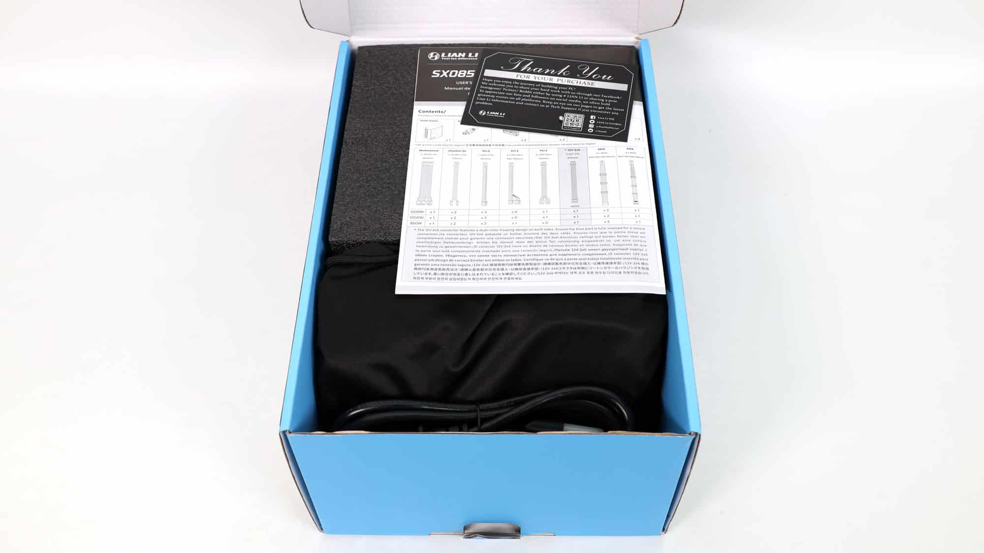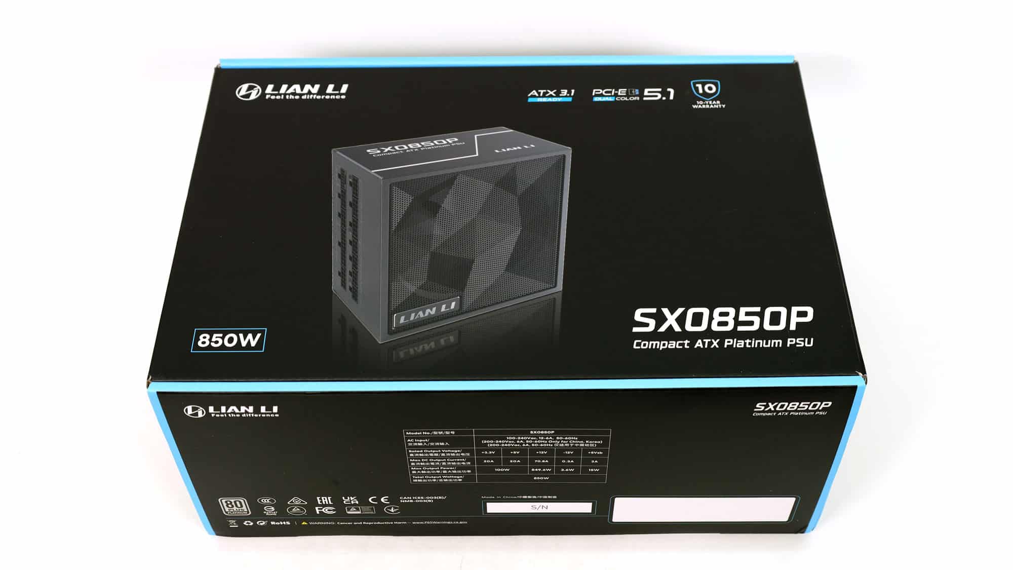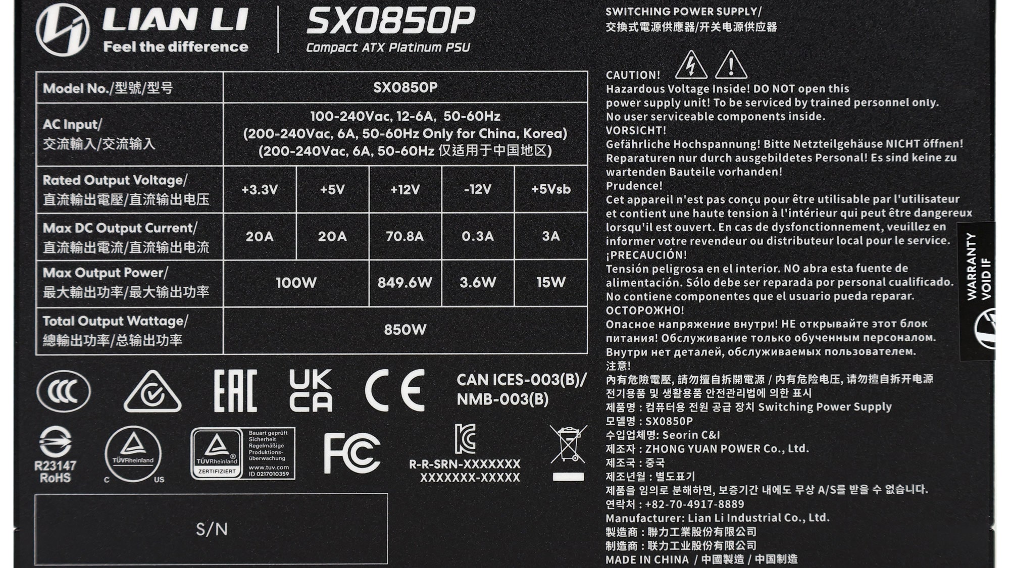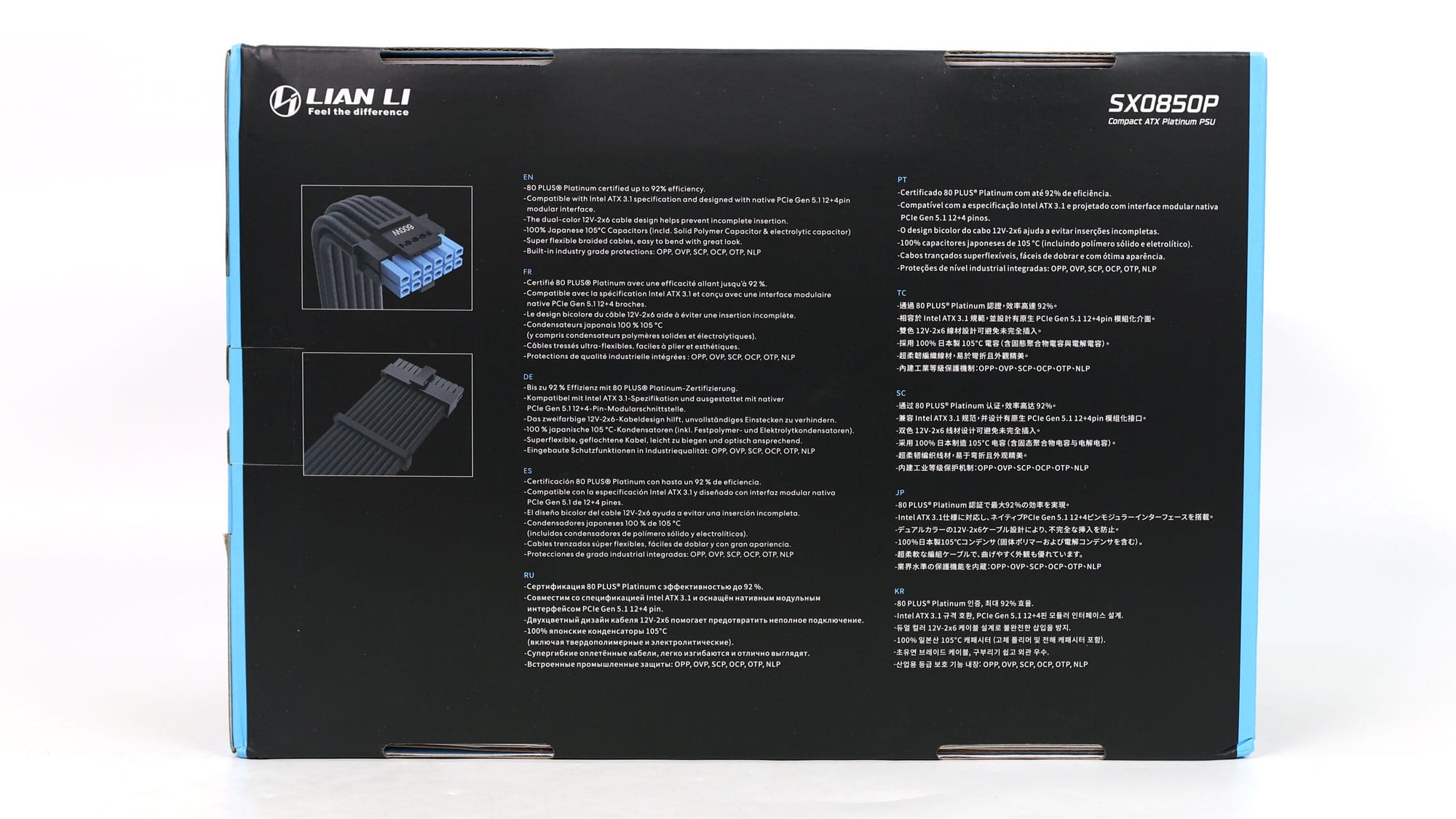 Overall, the dimensions are compact, with only 140mm in depth, making this PSU one of the smallest in the category (in footprint). This is why a 135-140mm fan couldn’t be installed; Lian Li opted for a 120mm fan instead.