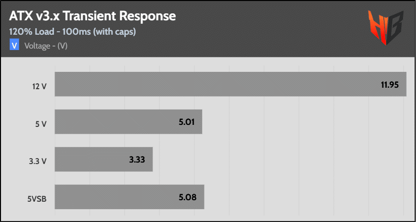 Note that the ATX spec requires additional capacitance for these tests, which helps boost voltage levels. In contrast, the results you see above are without any additional capacitance on any of the rails, so the stress is way higher.