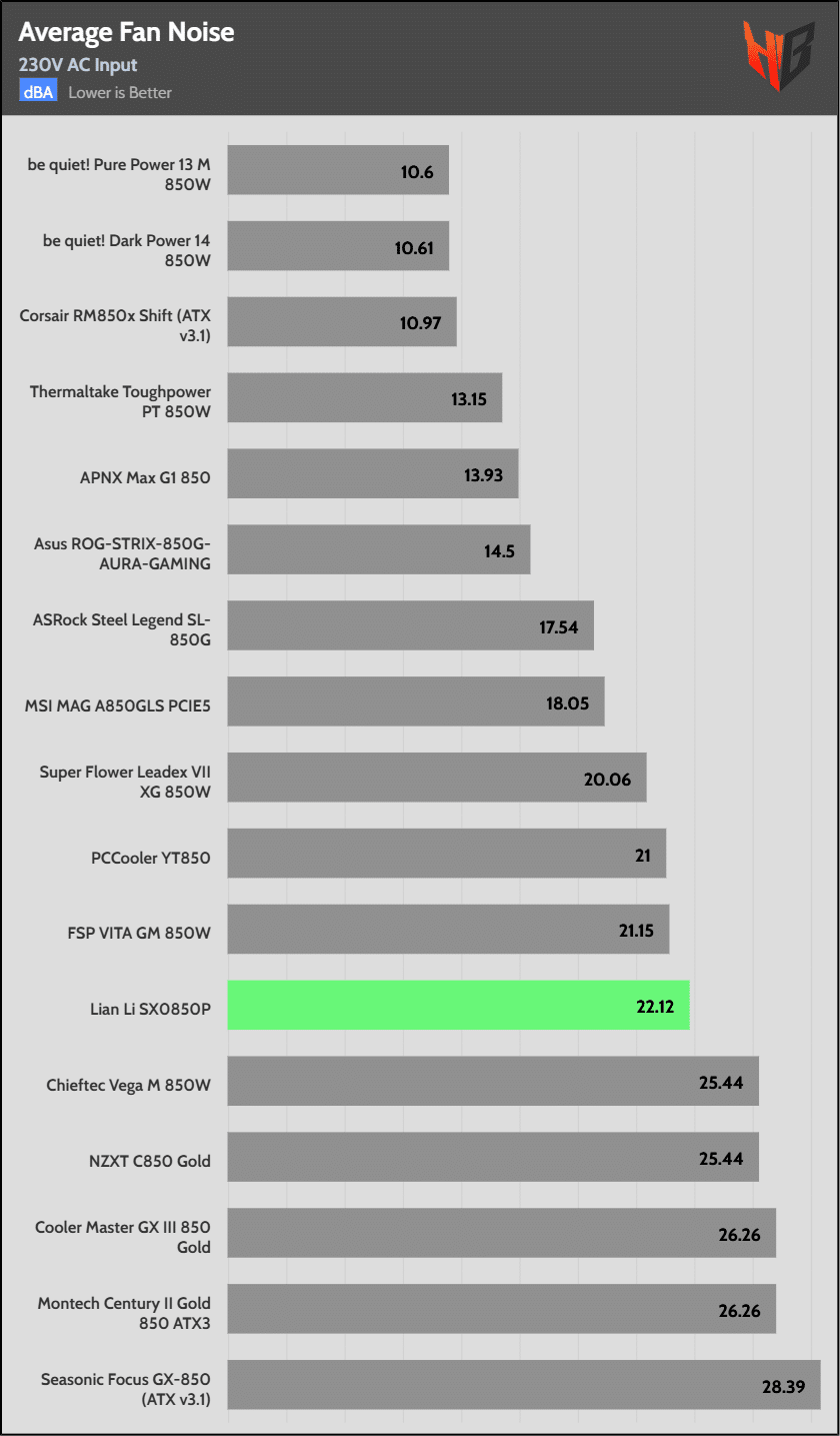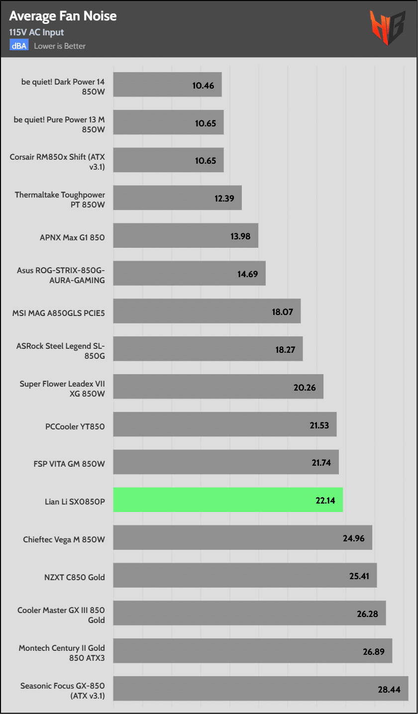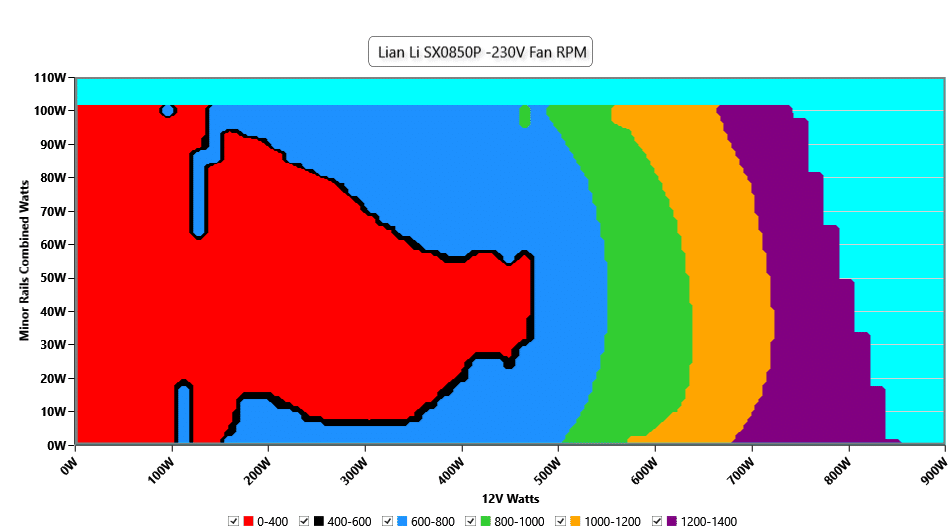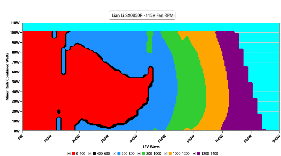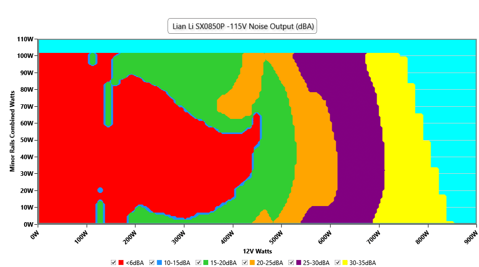 The fan’s passive mode is affected by the load on the minor rails when the load at 12V exceeds 125W. In general, the fan’s noise remains low below 500W, with the 25 dBA level reached at 550W at 12V. With more than 690W, the fan’s noise is within the 30-35 dBA range. Given the platform’s compact PCB and the lack of large heatsinks, the fan speed profile is tuned to balance quiet operation without jeopardizing long-term reliability.