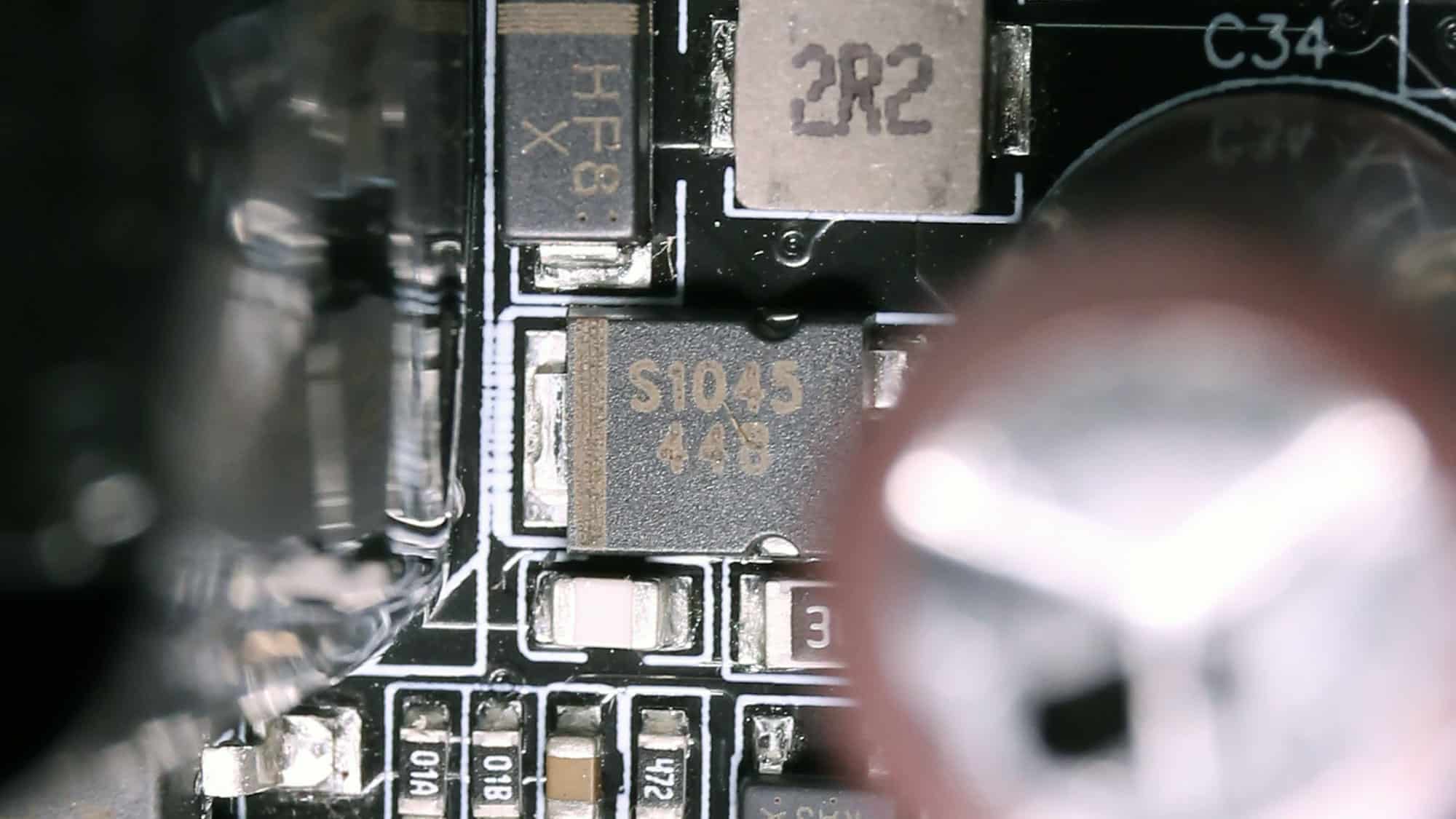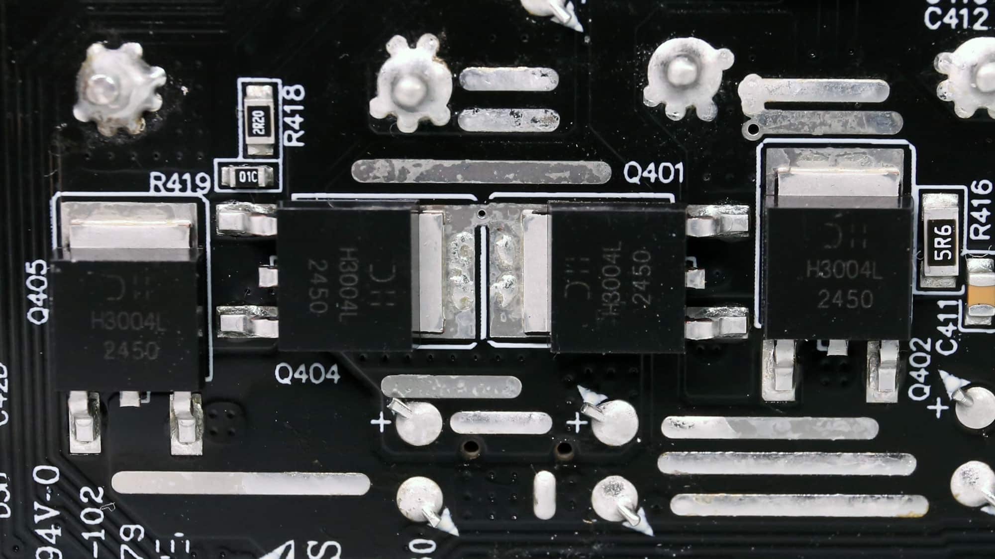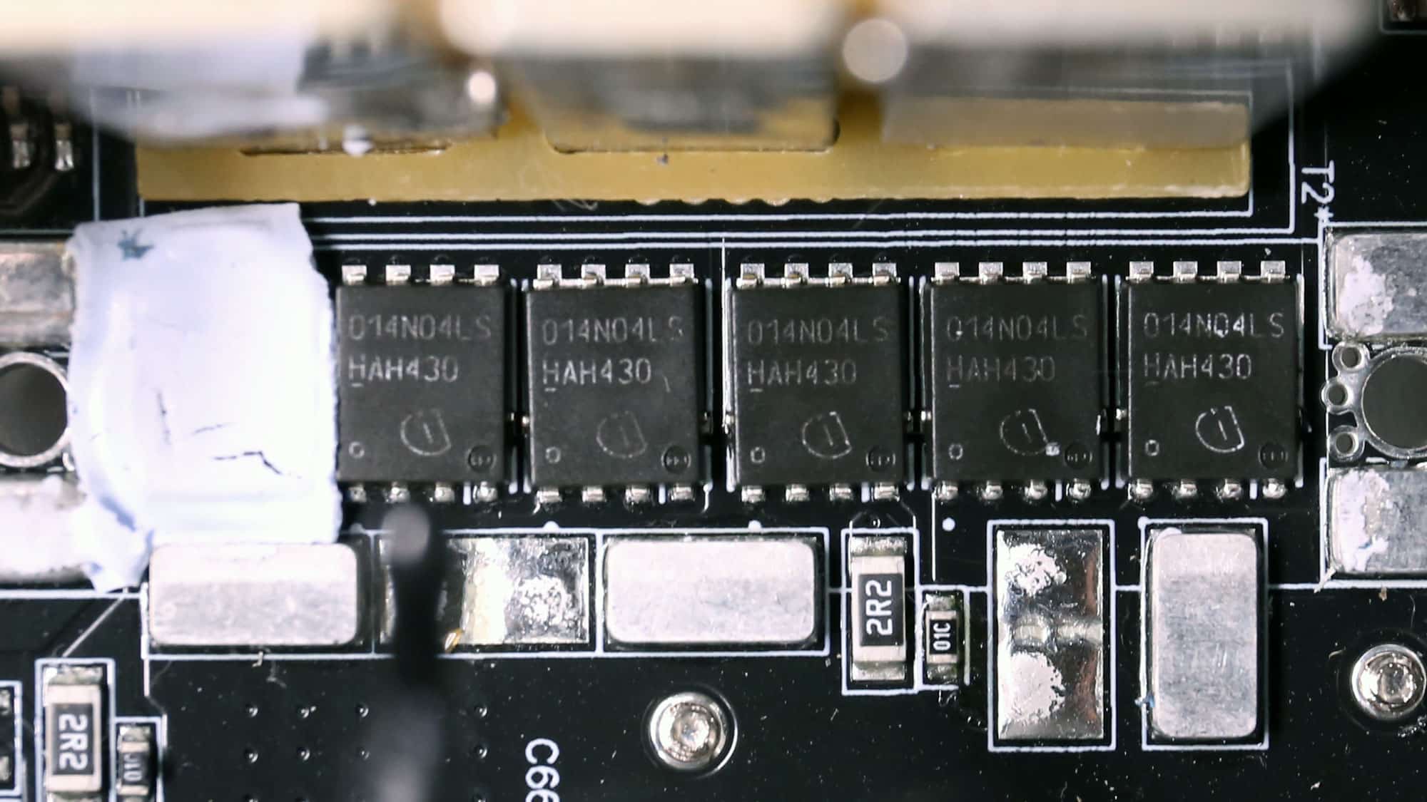 Six Infineon BSC014N04LS FETs regulate the 12V rail. They are installed on the business (top) side of the main PCB.