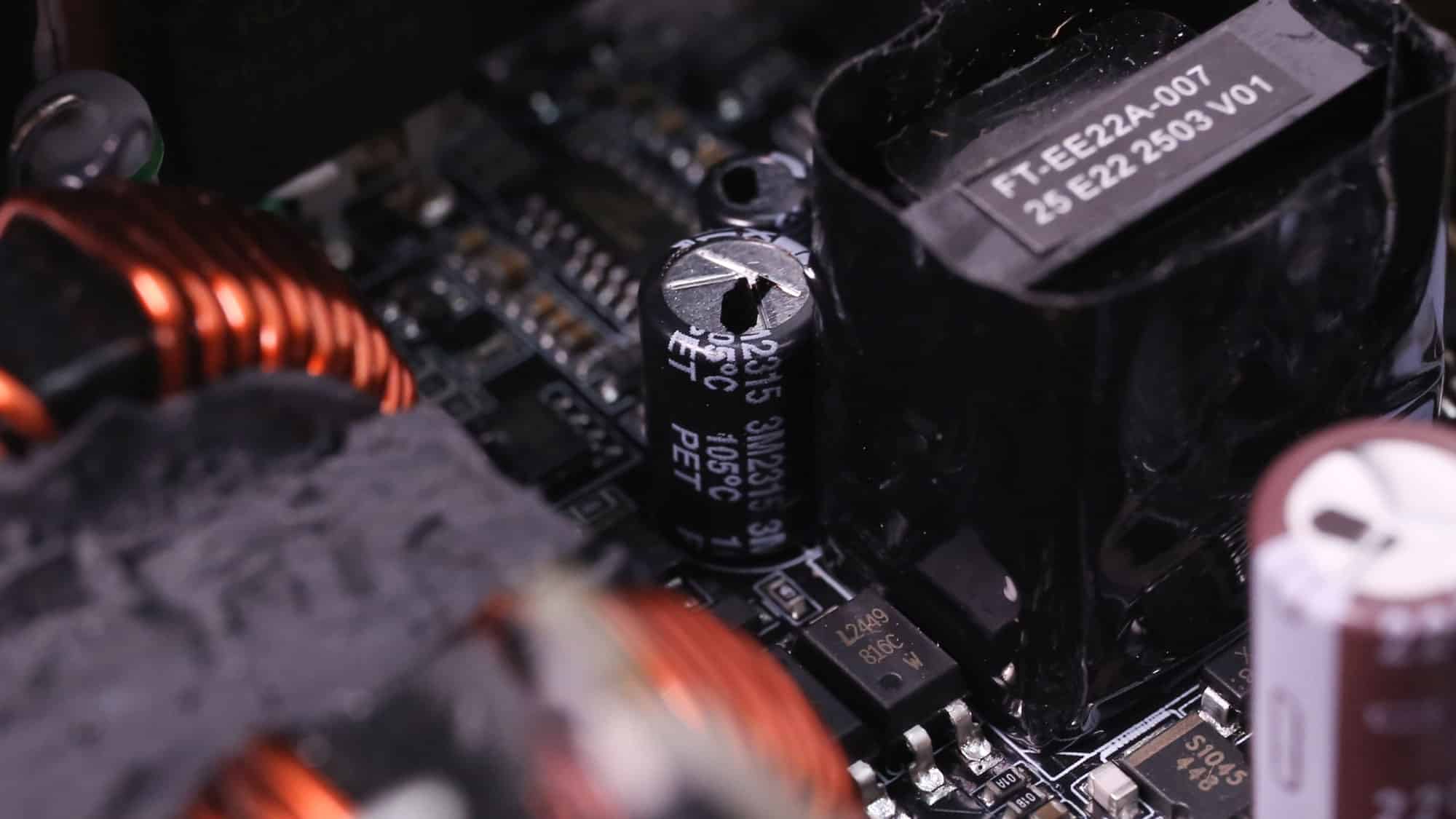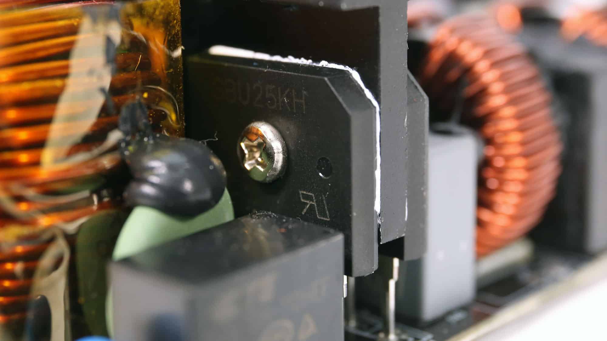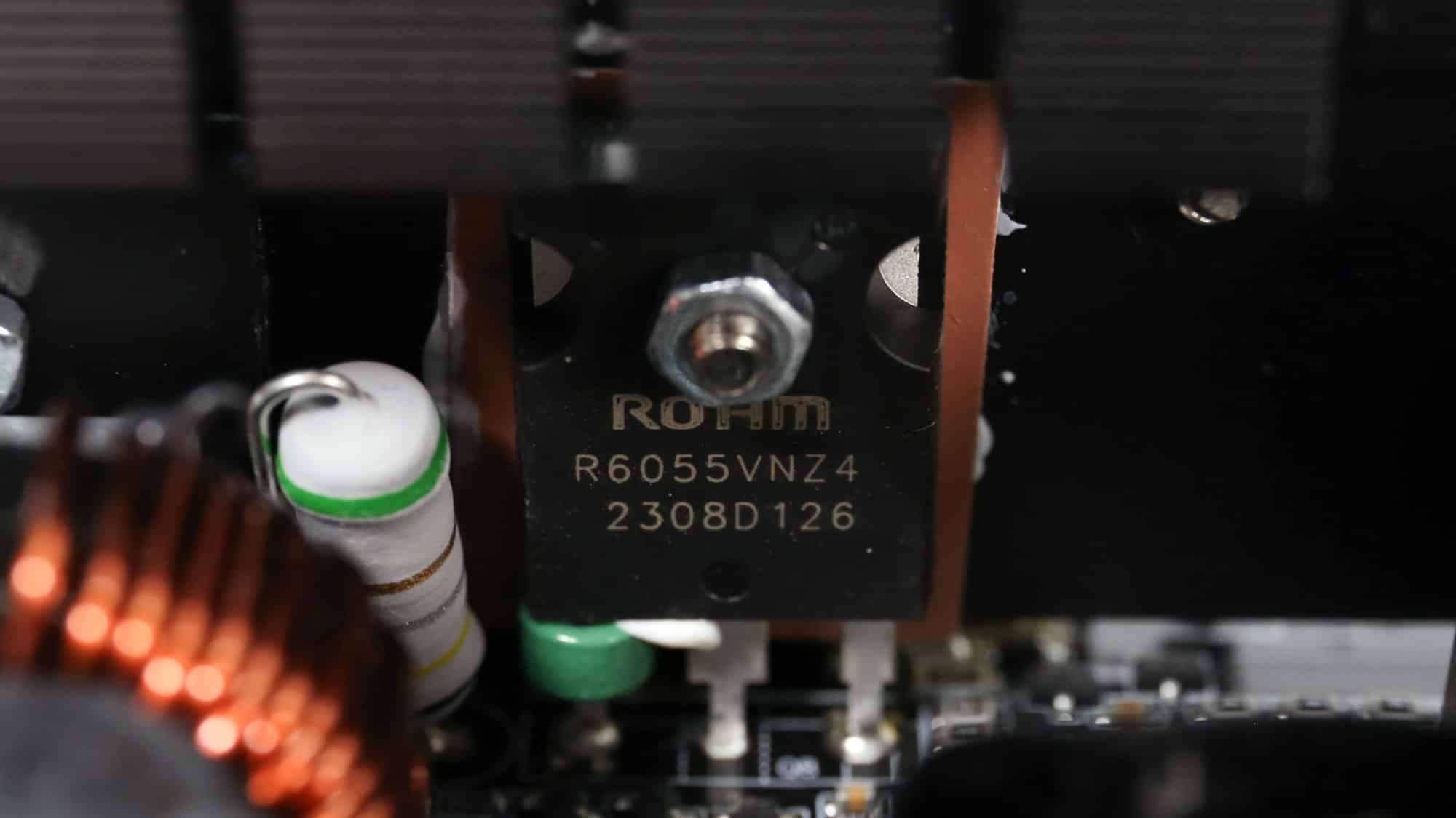 The APFC converter uses two Rohm Semiconductor R6055VNZ4 FETs and one WeEn Semiconductor WNSC6D06650 diode. Rubycon manufactures the bulk capacitors. Their combined capacity is 1150 μF, and both are rated for 3,000 hours at 105 °C. Voltage ratings are 420V and 450V, which are far enough from the APFC’s DC bus voltage (approximately 380-400V DC).