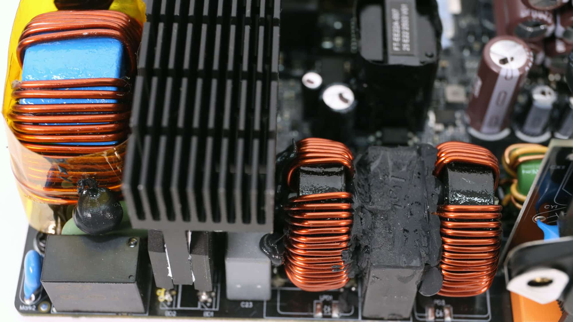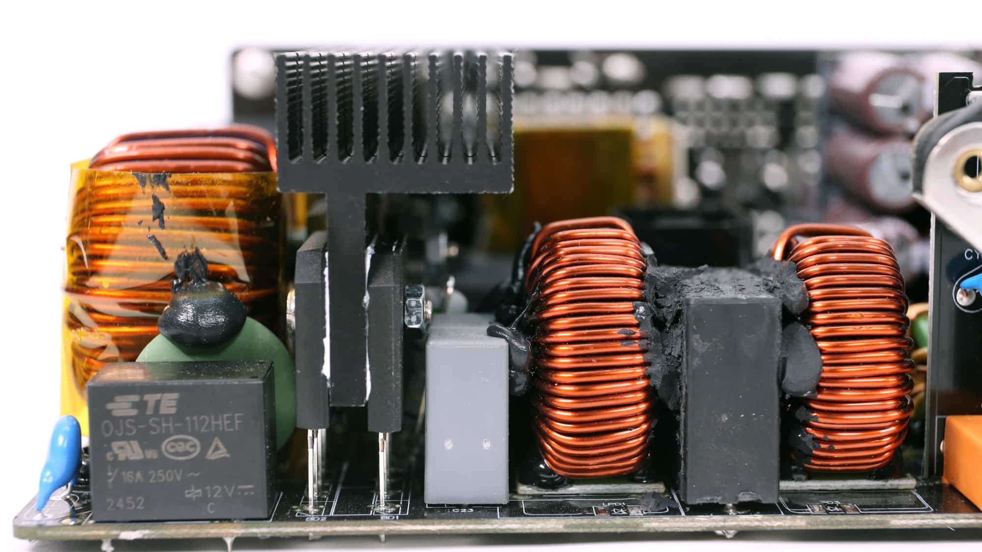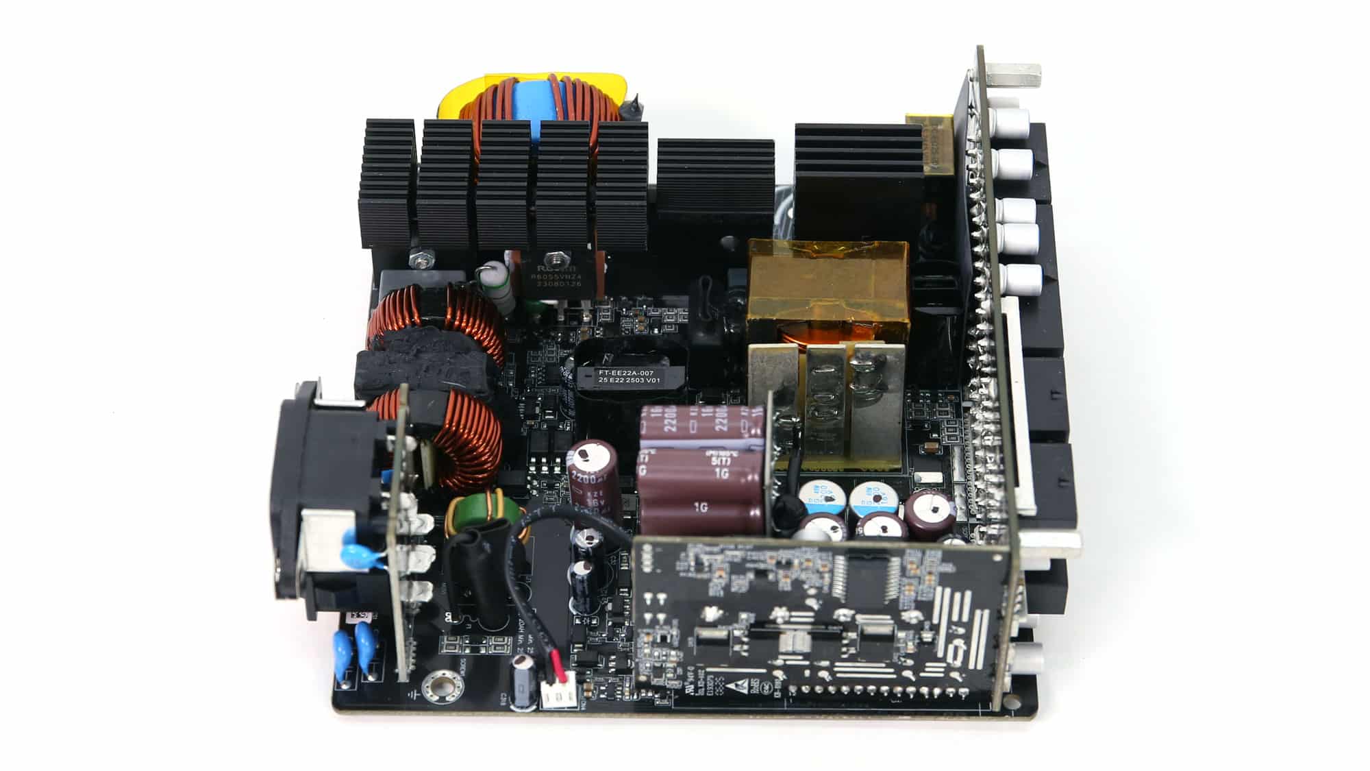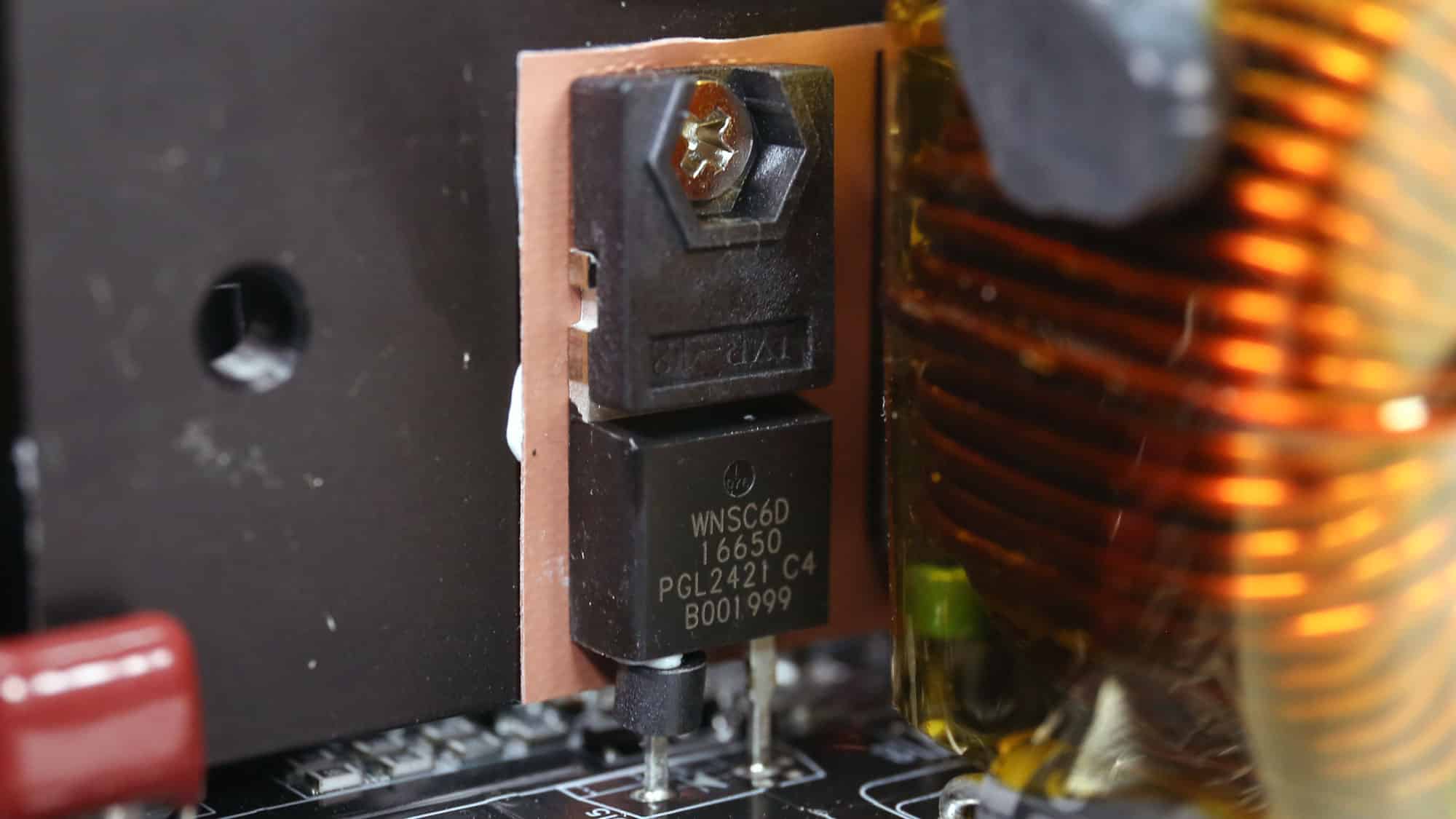 The APFC converter uses two Rohm Semiconductor R6055VNZ4 FETs and one WeEn Semiconductor WNSC6D06650 diode. Rubycon manufactures the bulk capacitors. Their combined capacity is 1150 μF, and both are rated for 3,000 hours at 105 °C. Voltage ratings are 420V and 450V, which are far enough from the APFC’s DC bus voltage (approximately 380-400V DC).