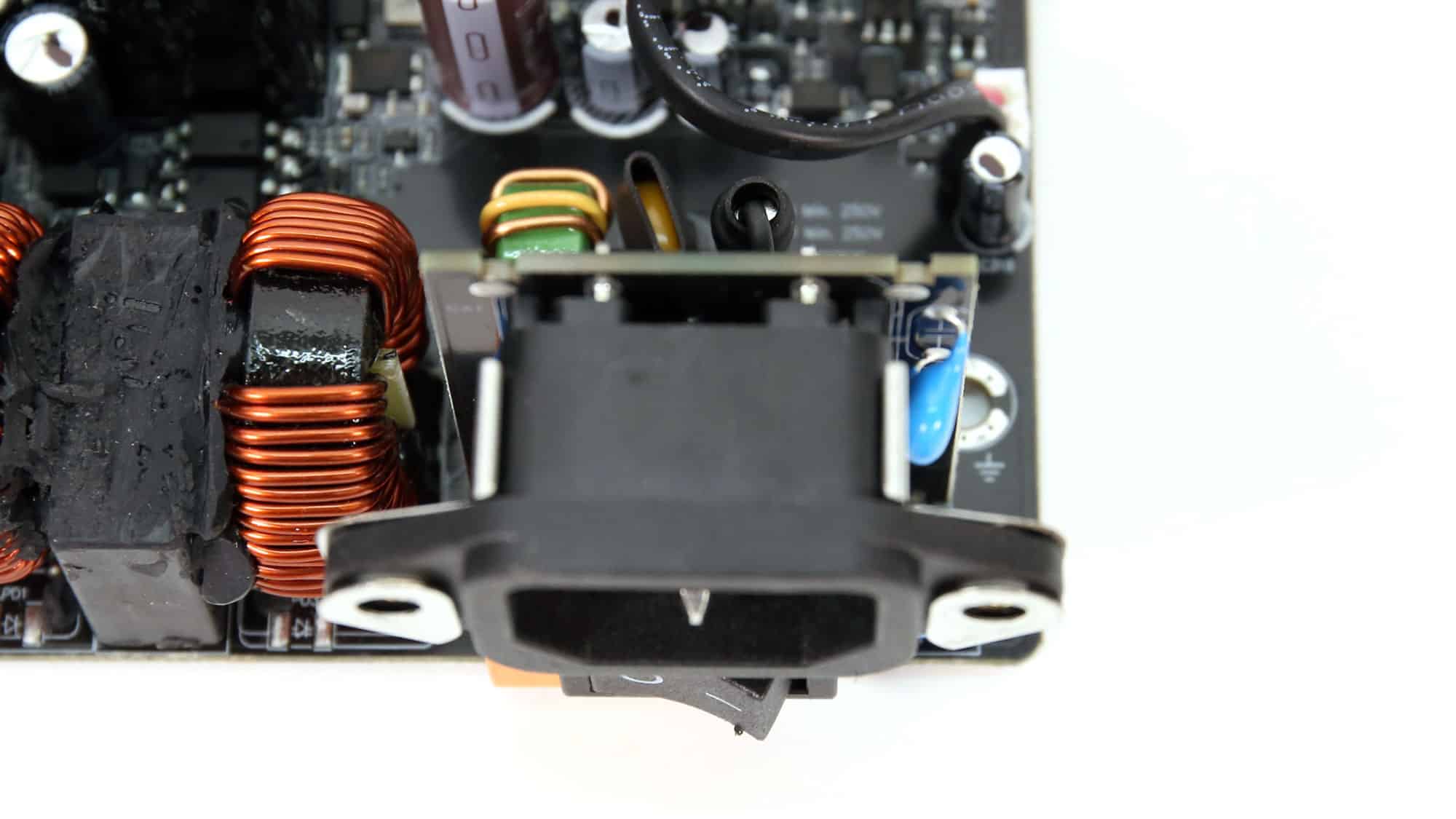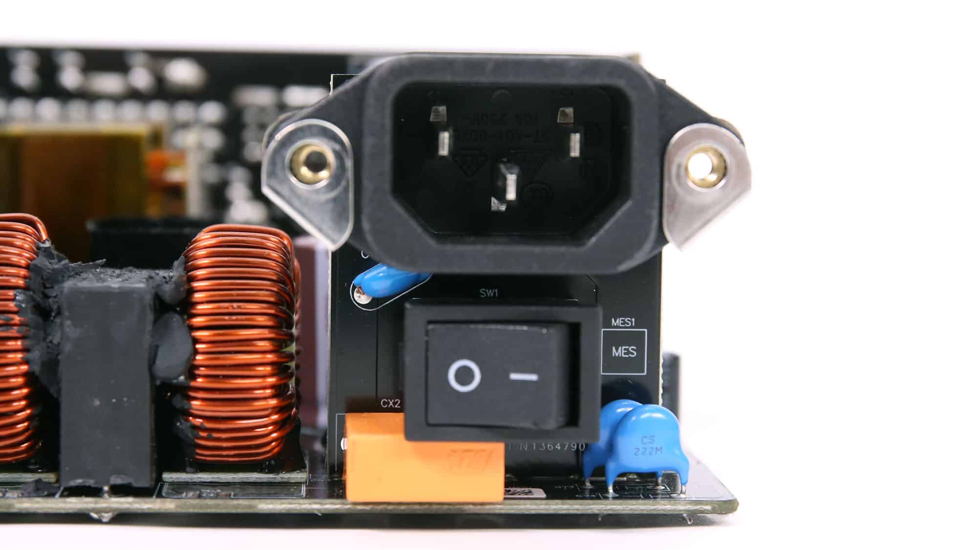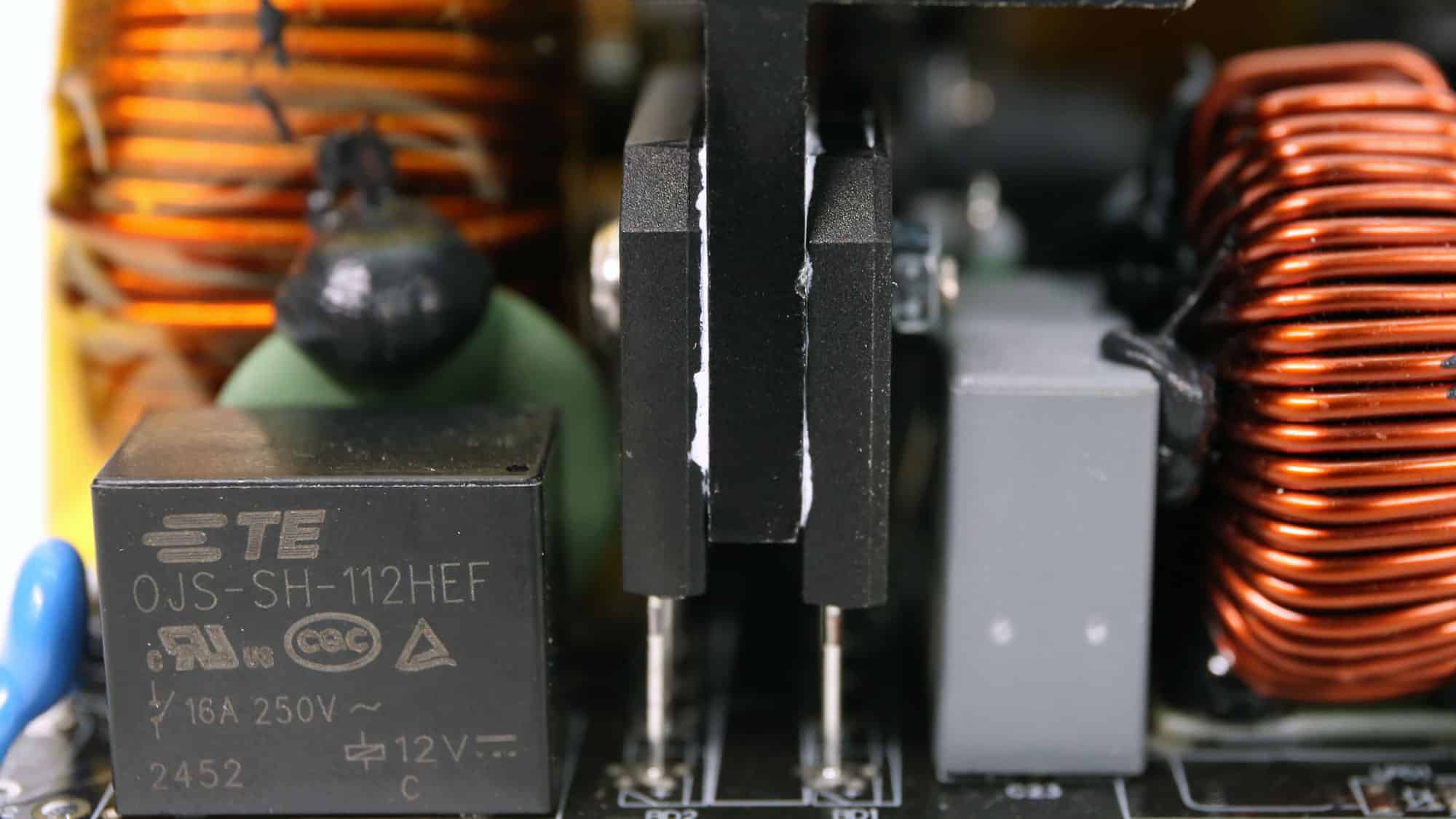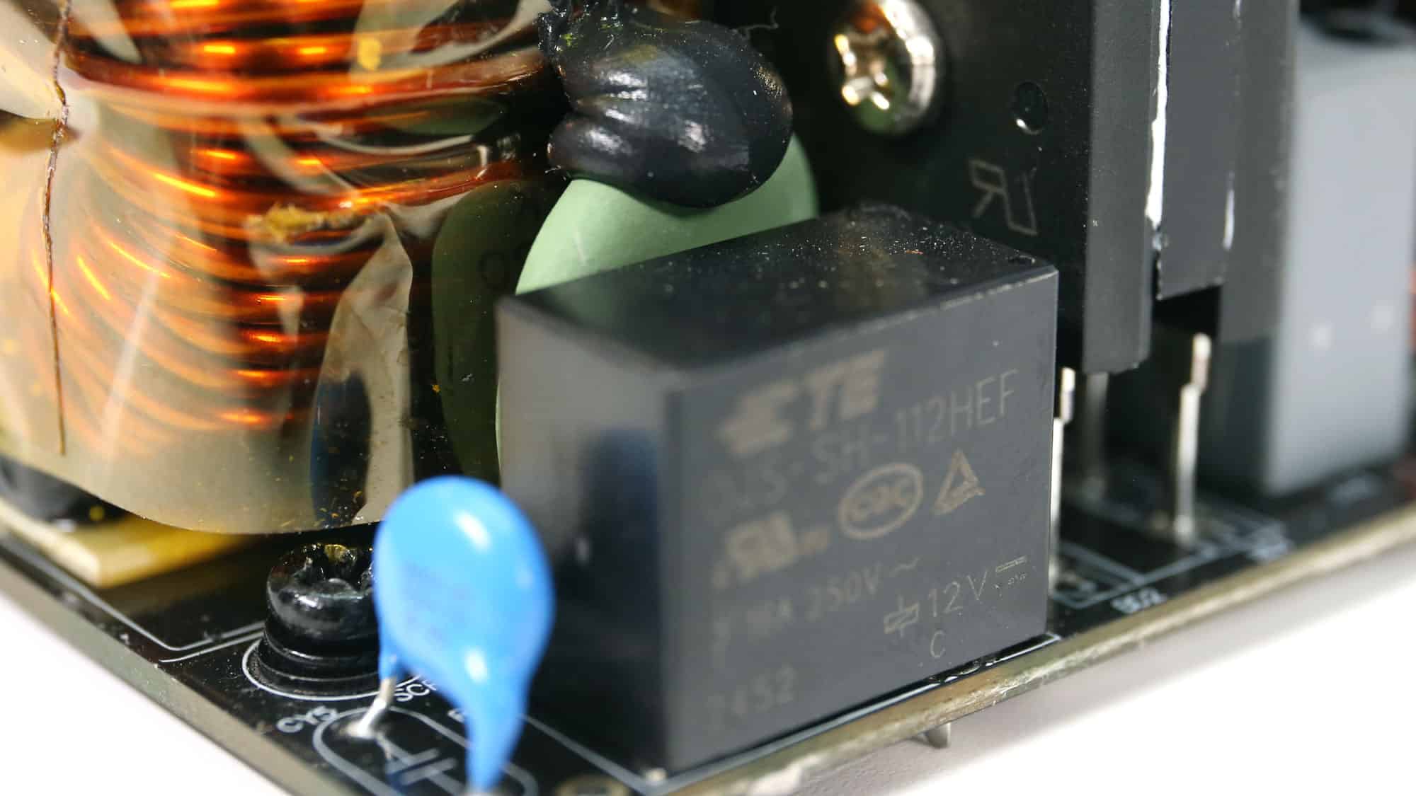 There is an MOV to protect from voltage surges and an NTC thermistor with a resistance of 5 ohms. Moreover, a bypass relay supports the NTC thermistor.