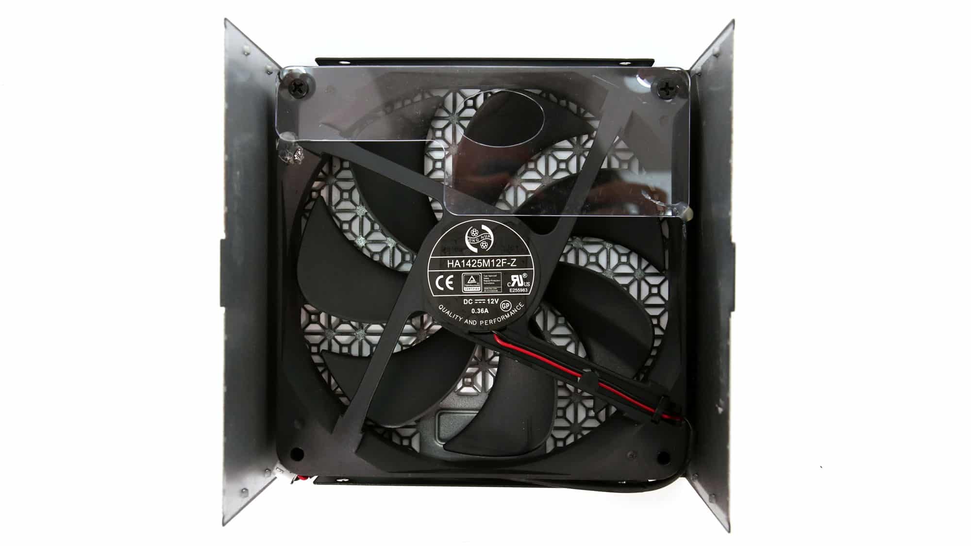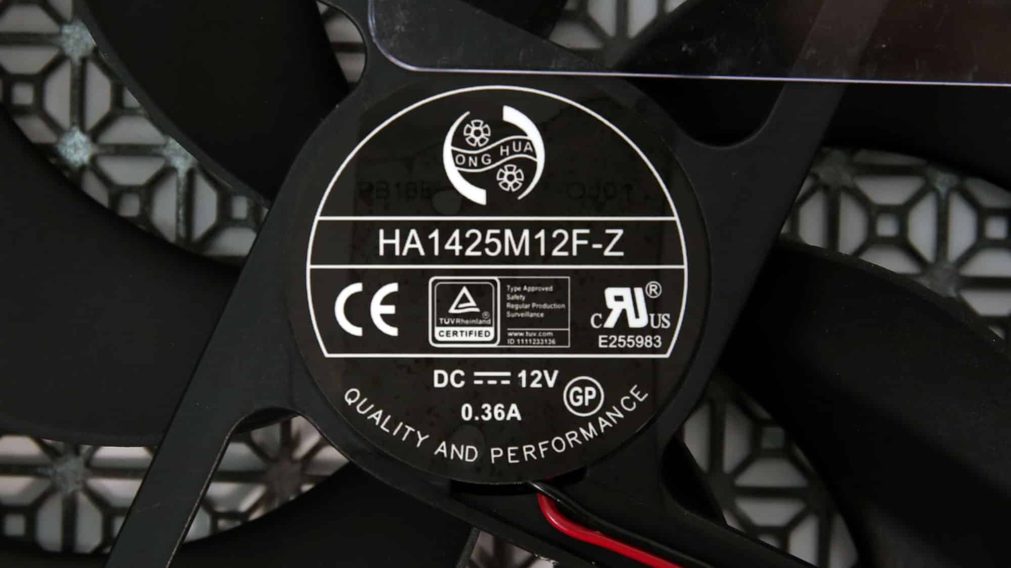 The cooling fan is a Hong Hua HA1425M12F-Z, utilizing a fluid dynamic bearing.