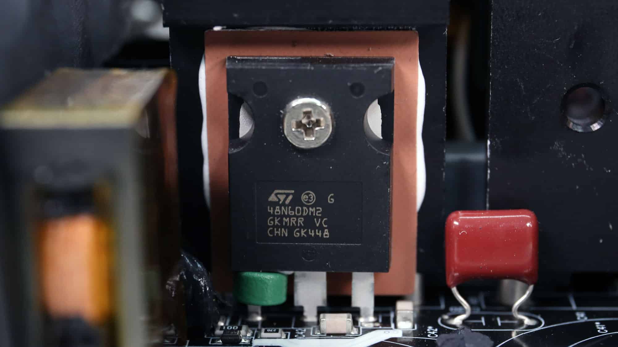 The two STMicroelectronics STW48N60DM2 primary switching FETs are installed in a half-bridge topology, and an LLC resonant converter is utilized for enhanced efficiency.